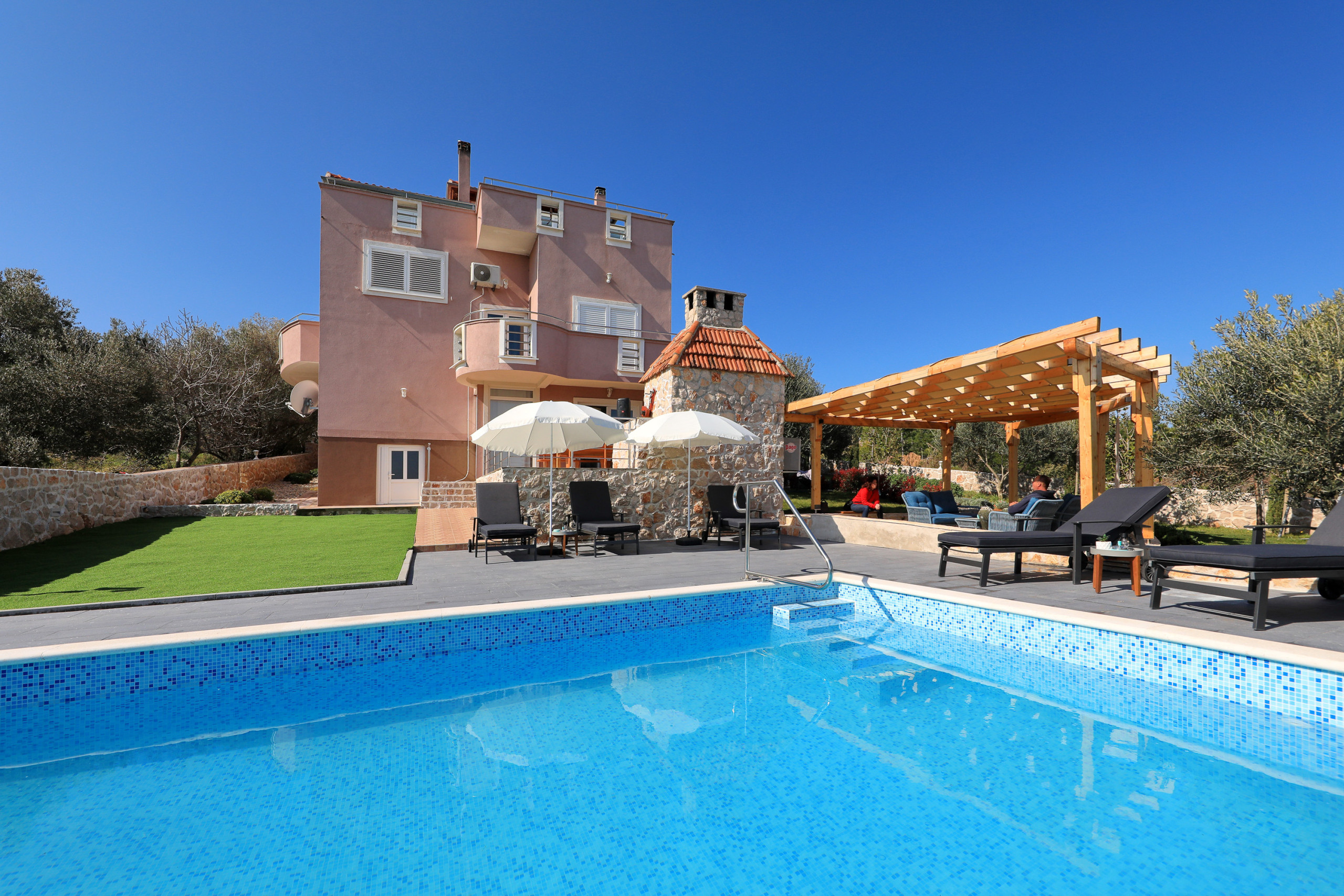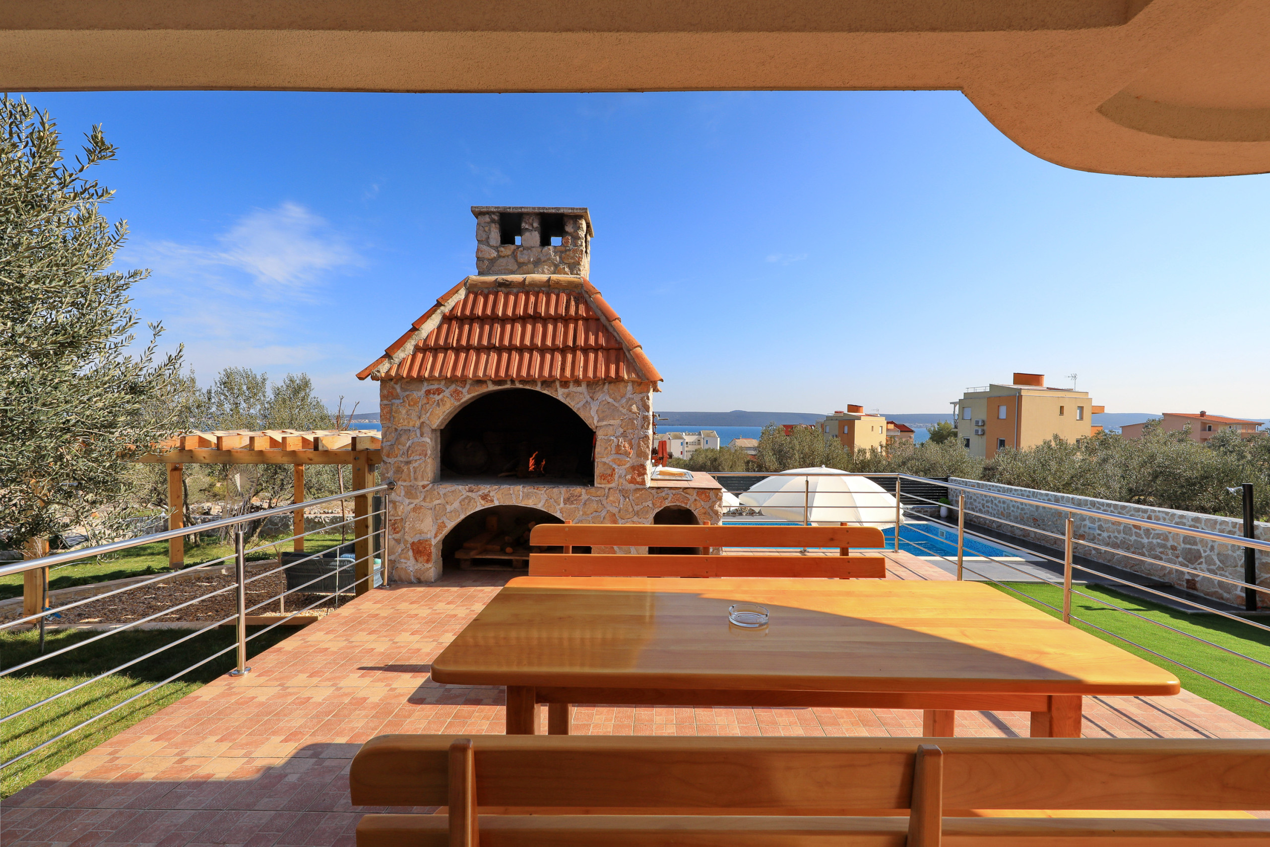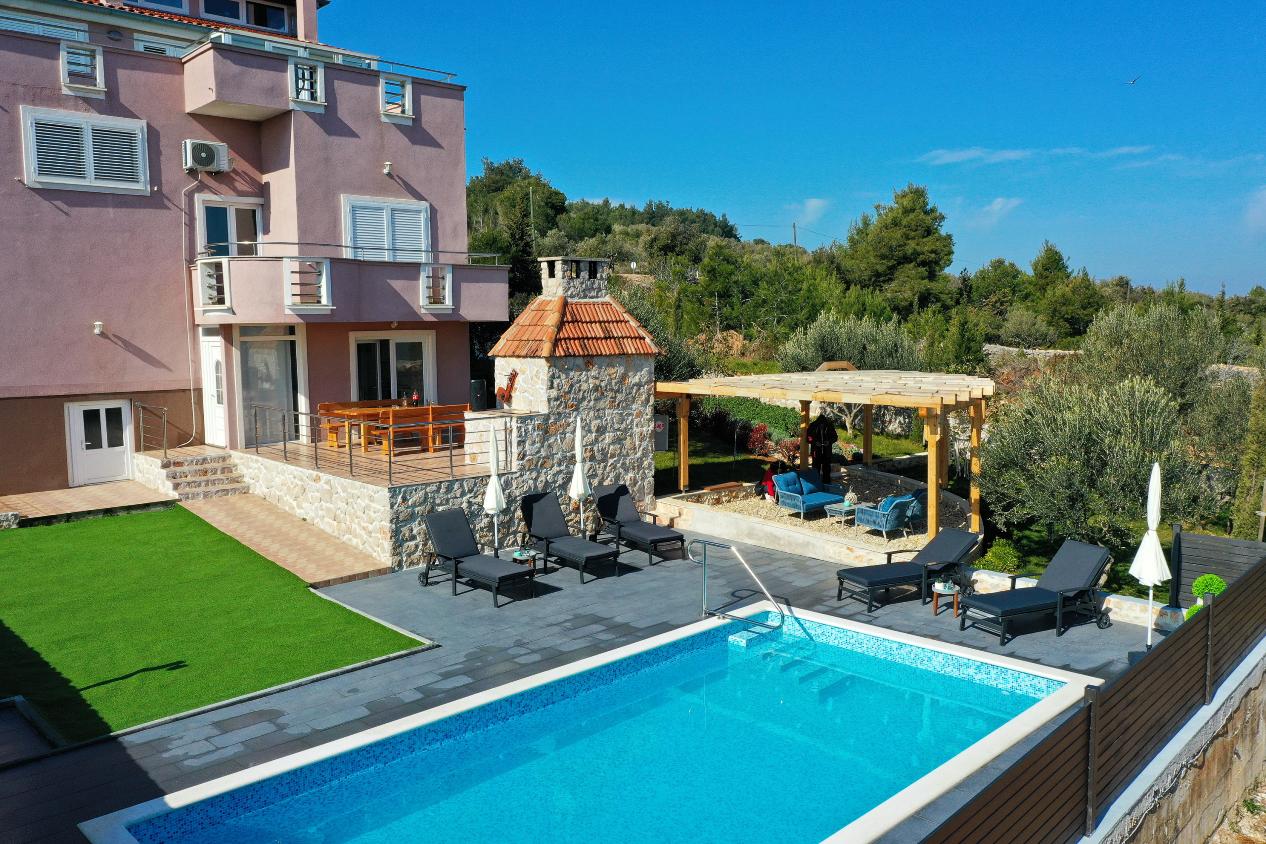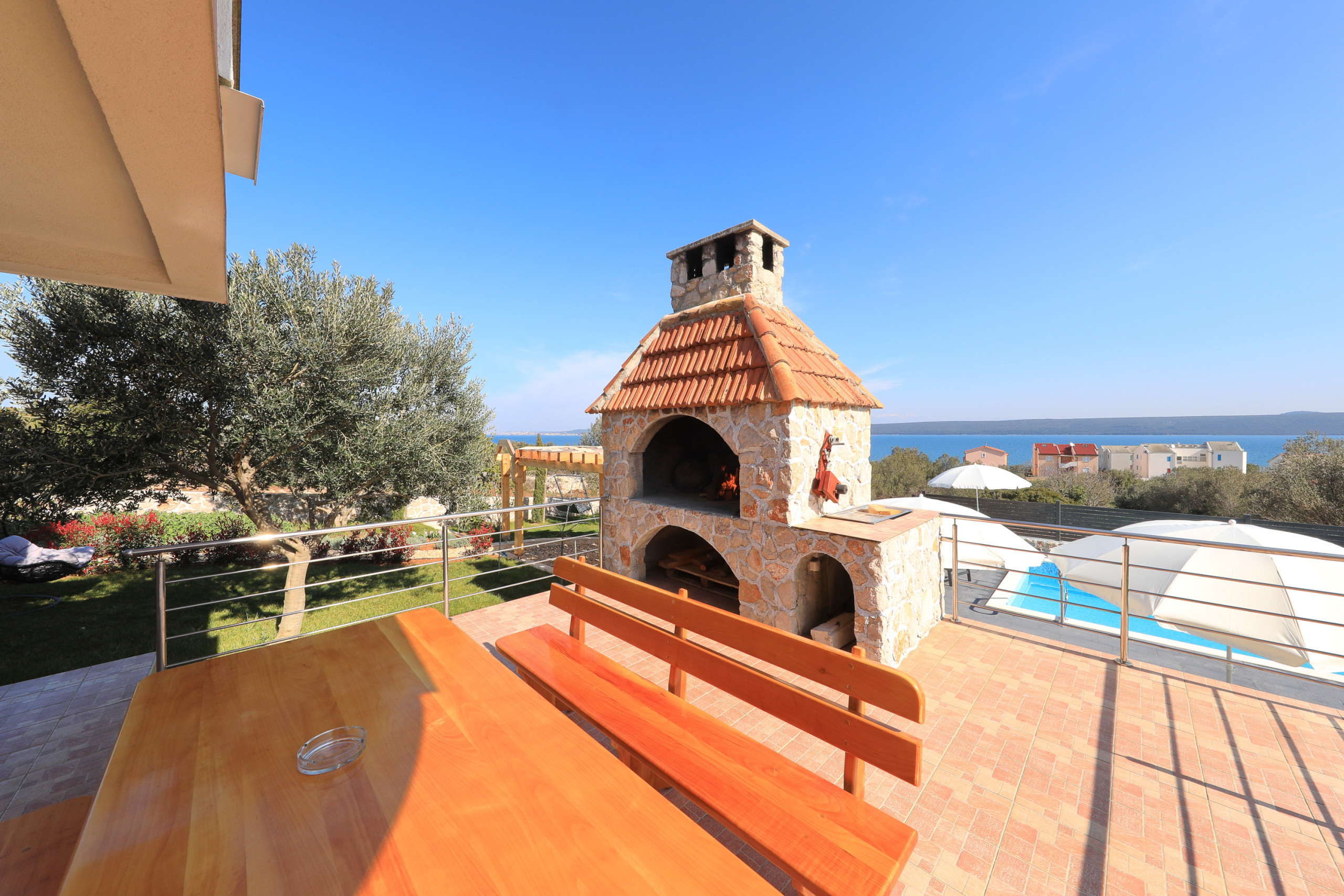 The accommodation is equipped with the following items: garden, garden furniture, 40 m² terrace, barbecue, iron, internet (Wi-Fi), hair dryer, balcony, heat pump, air conditioning in the living room, private swimming pool, garage and car park the same building, 2 TVs.
