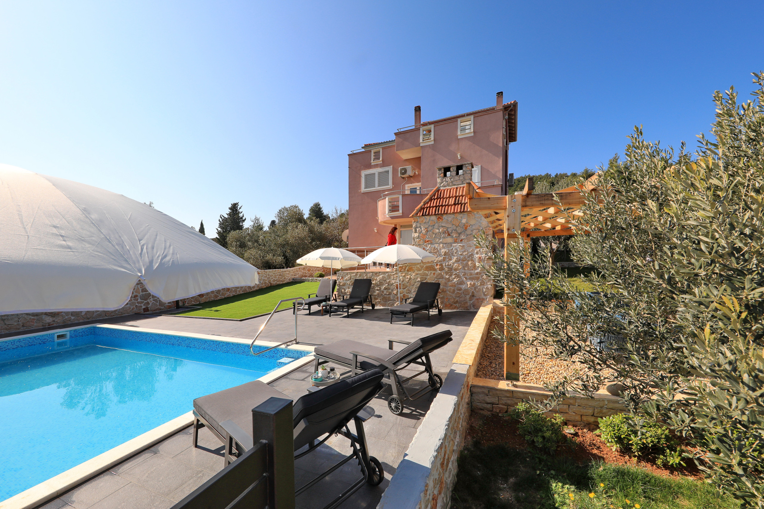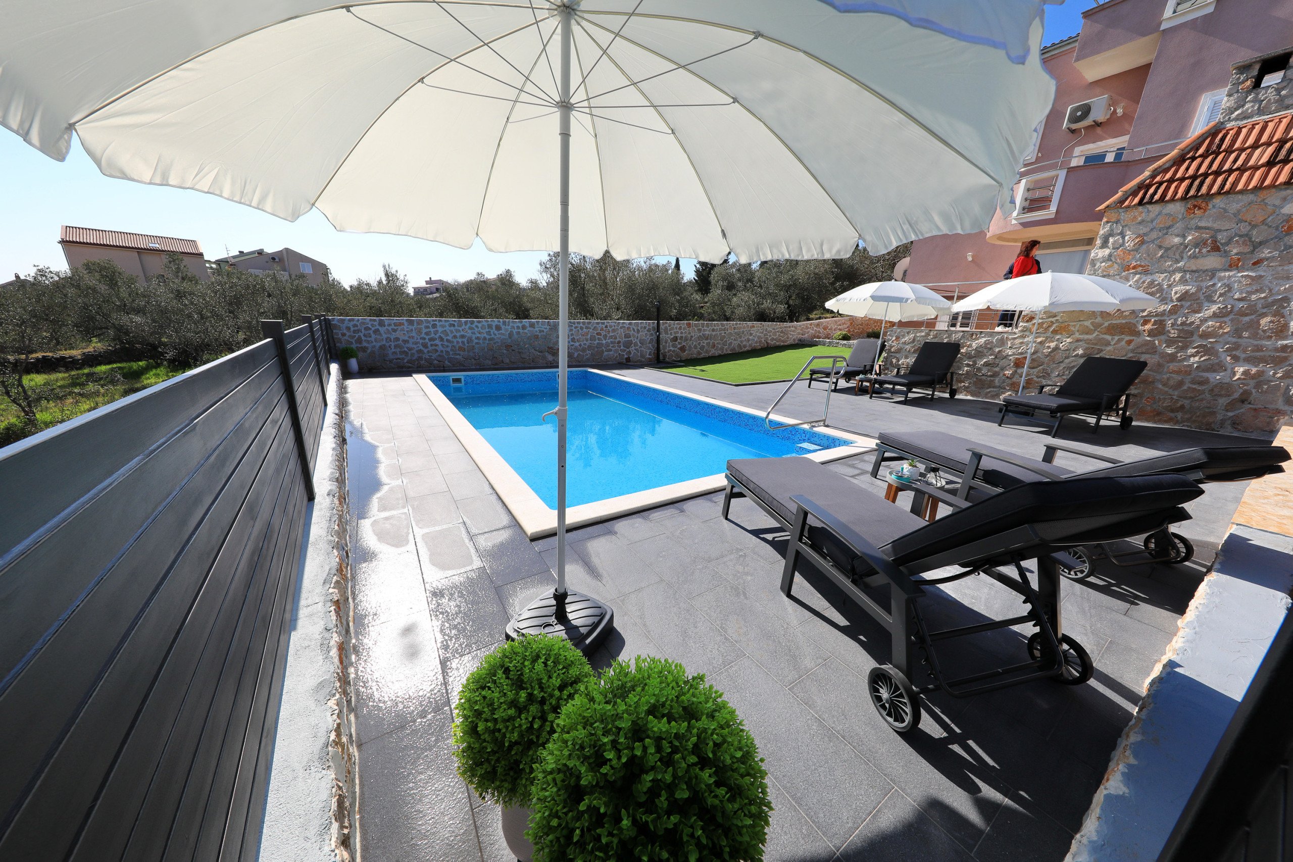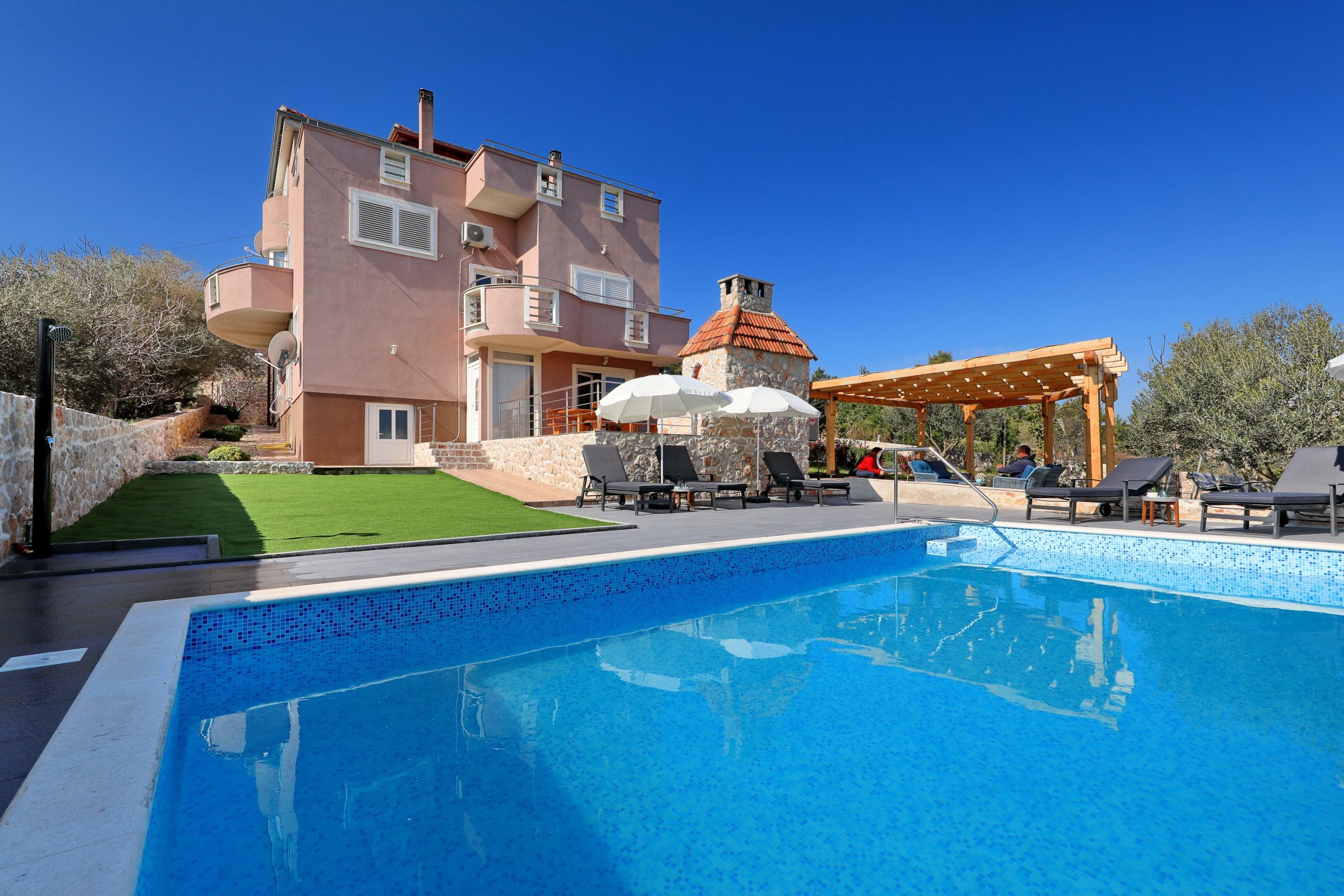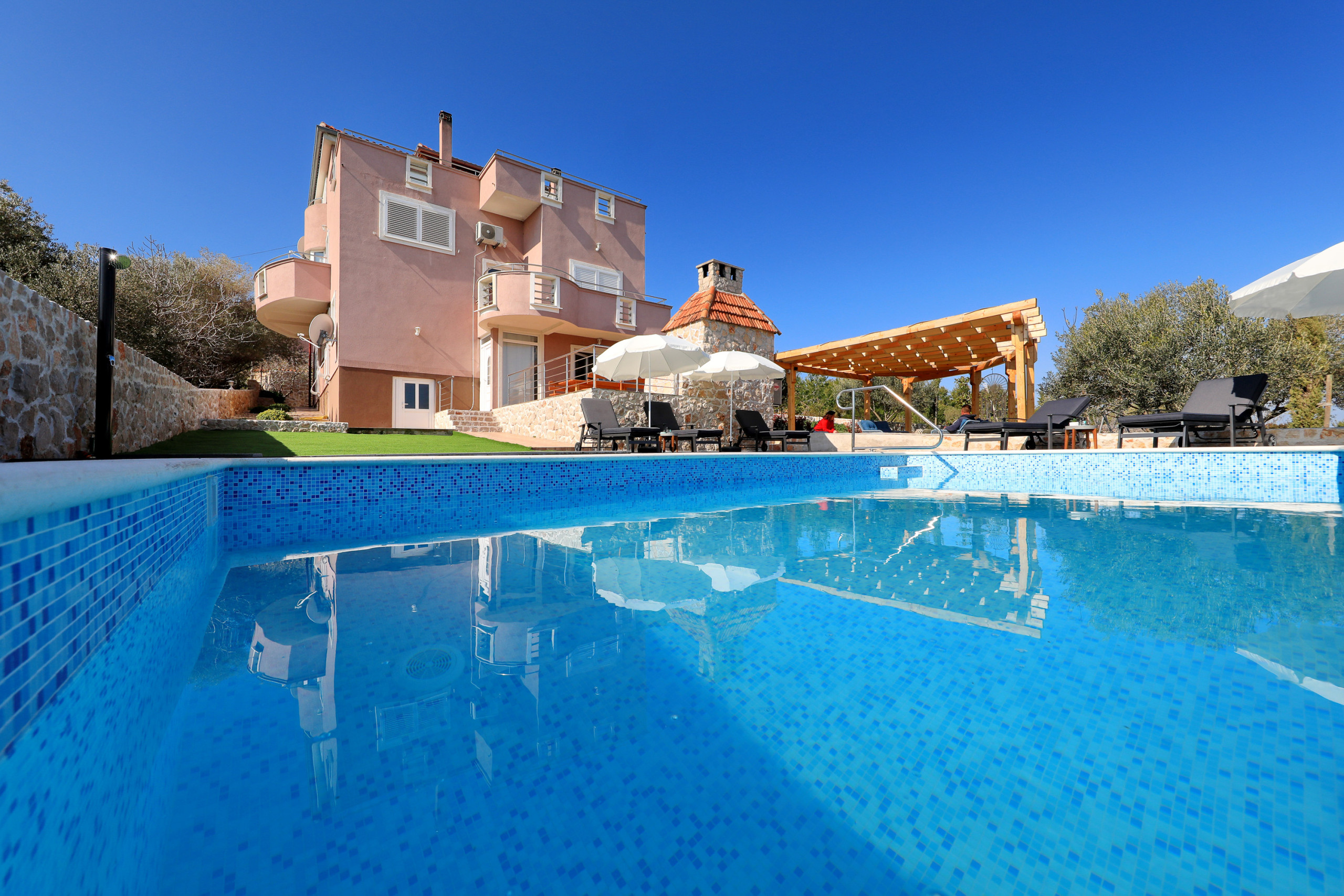 The accommodation is equipped with the following items: garden, garden furniture, 40 m² terrace, barbecue, iron, internet (Wi-Fi), hair dryer, balcony, heat pump, air conditioning in the living room, private swimming pool, garage and car park the same building, 2 TVs.