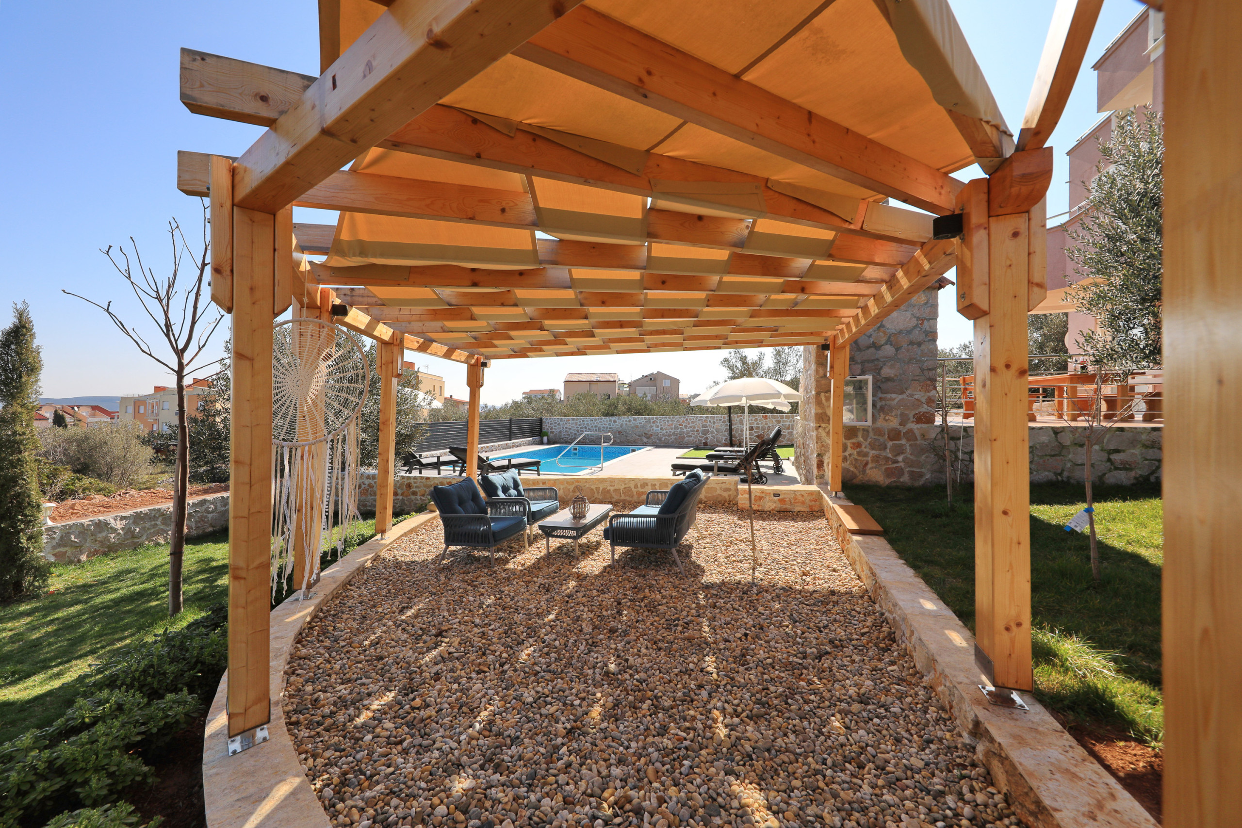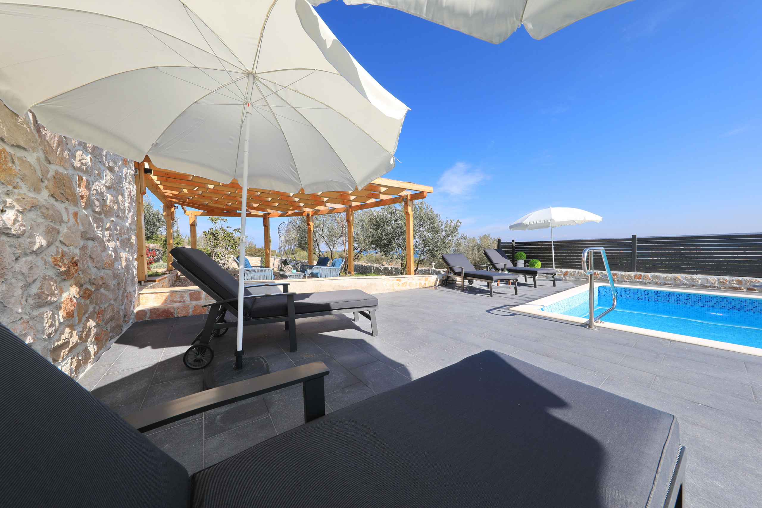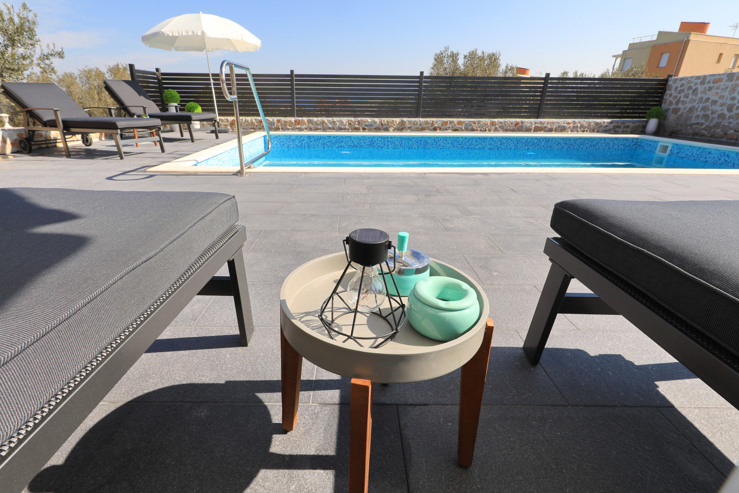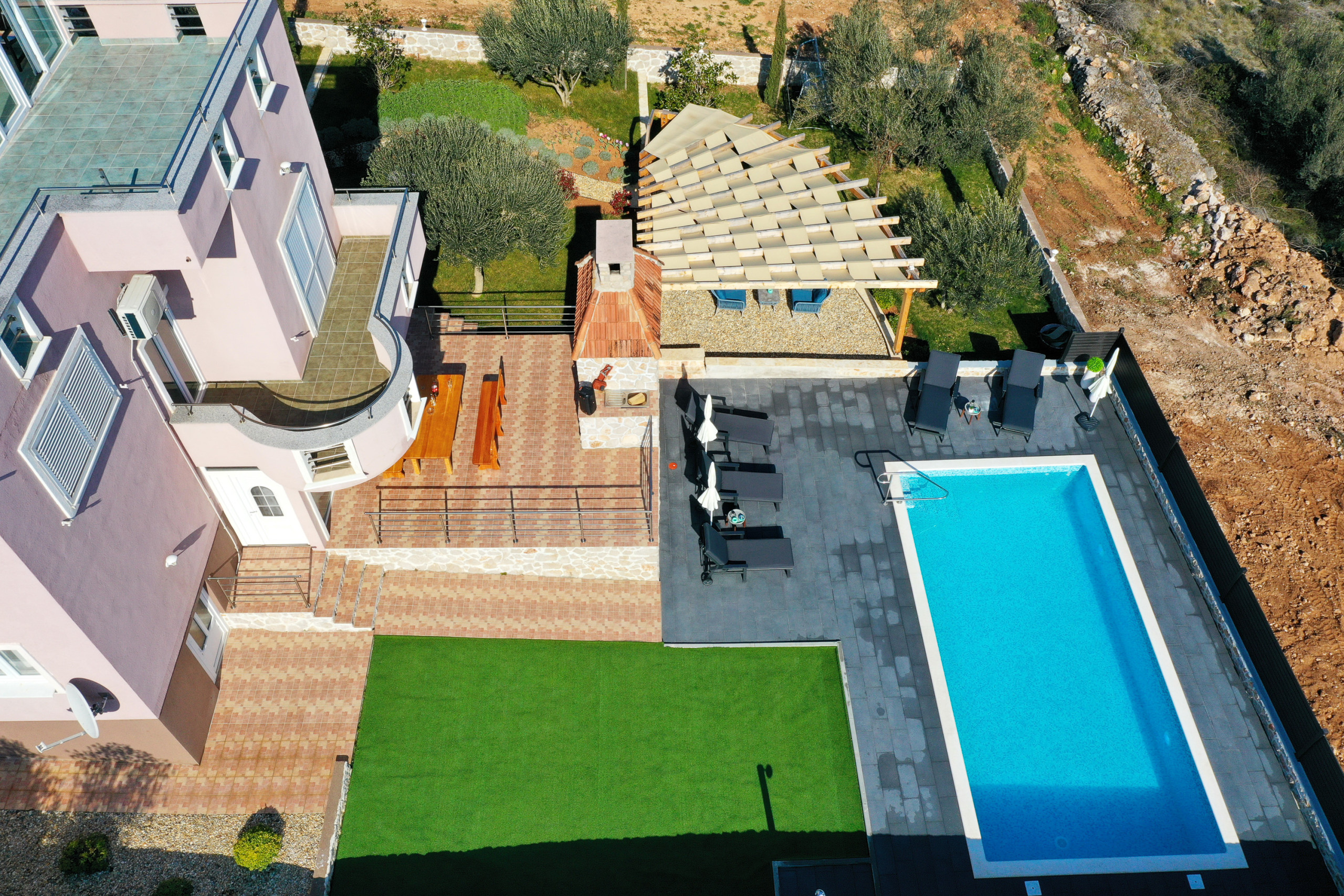 The accommodation is equipped with the following items: garden, garden furniture, 40 m² terrace, barbecue, iron, internet (Wi-Fi), hair dryer, balcony, heat pump, air conditioning in the living room, private swimming pool, garage and car park the same building, 2 TVs.