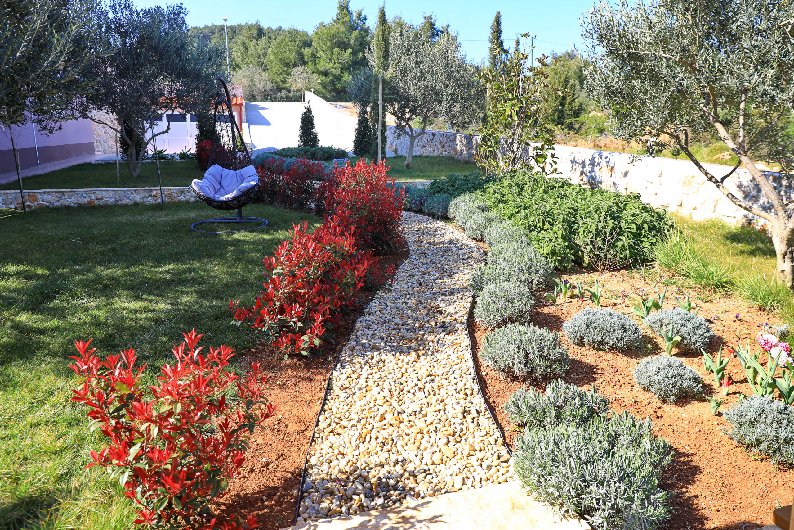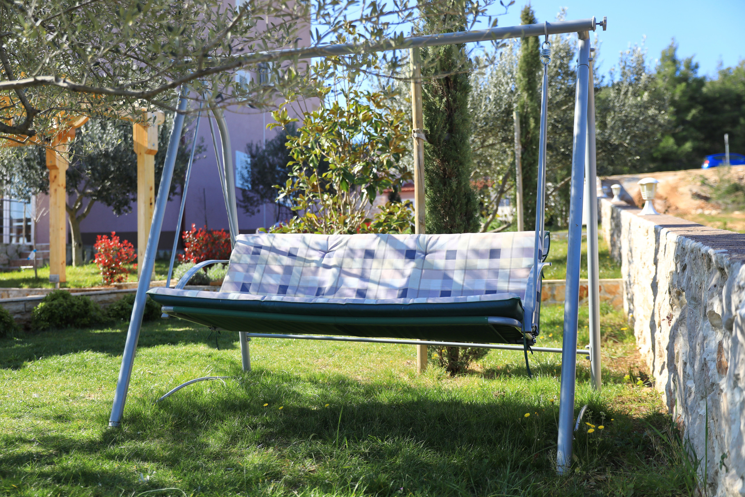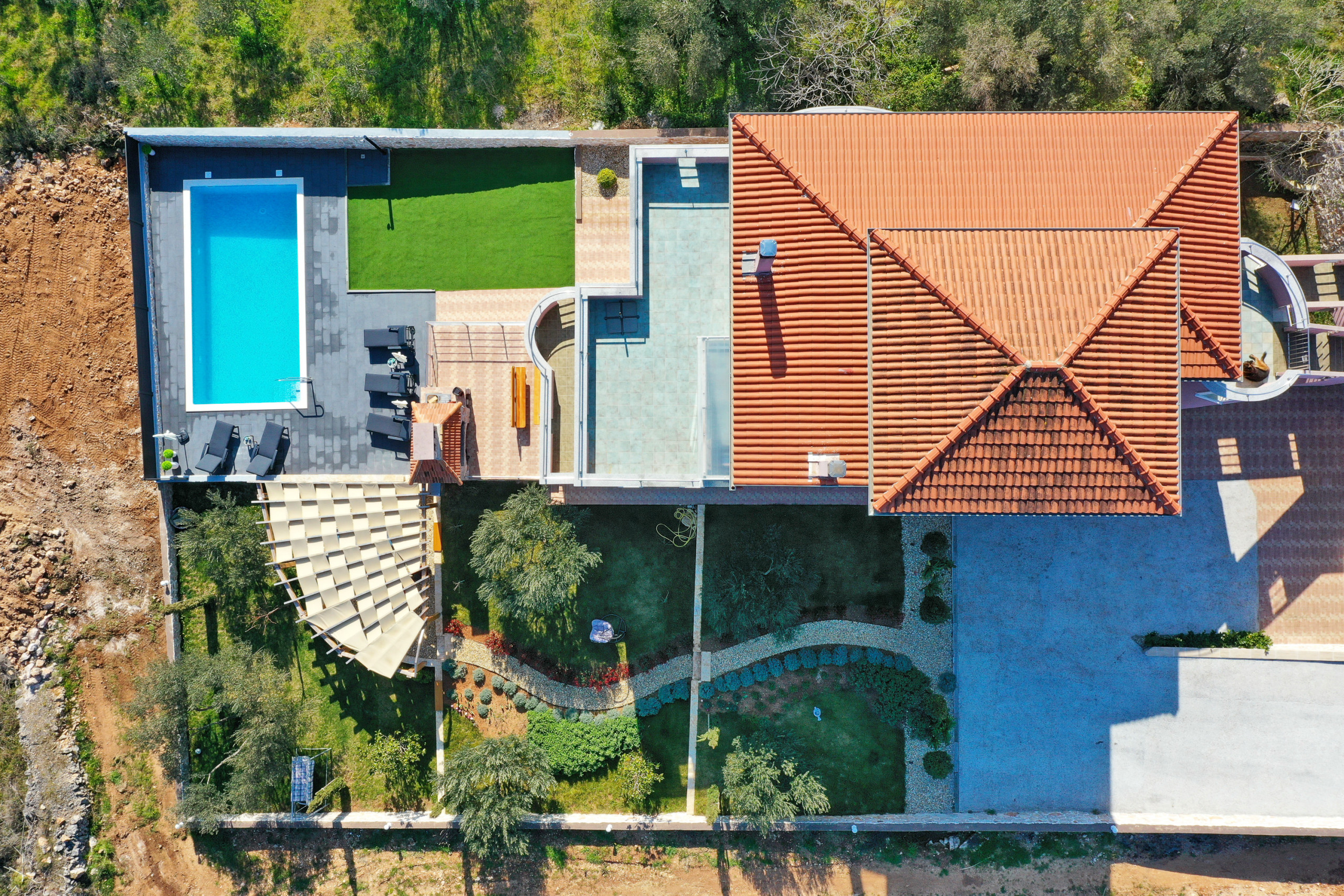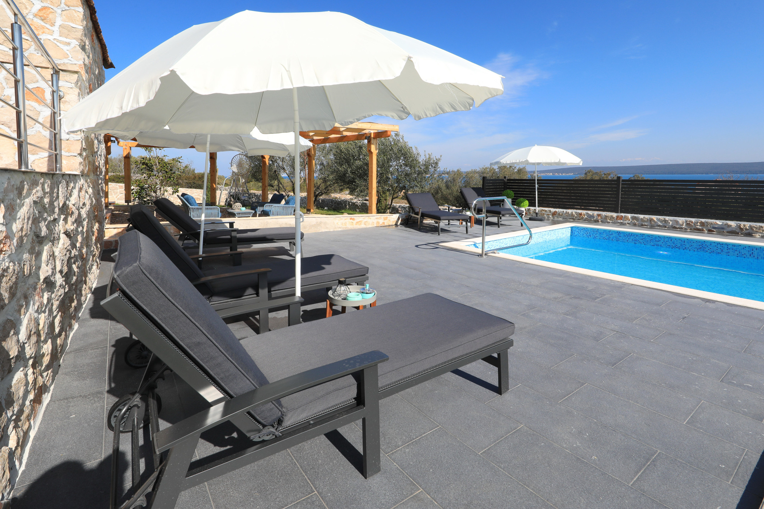 The accommodation is equipped with the following items: garden, garden furniture, 40 m² terrace, barbecue, iron, internet (Wi-Fi), hair dryer, balcony, heat pump, air conditioning in the living room, private swimming pool, garage and car park the same building, 2 TVs.