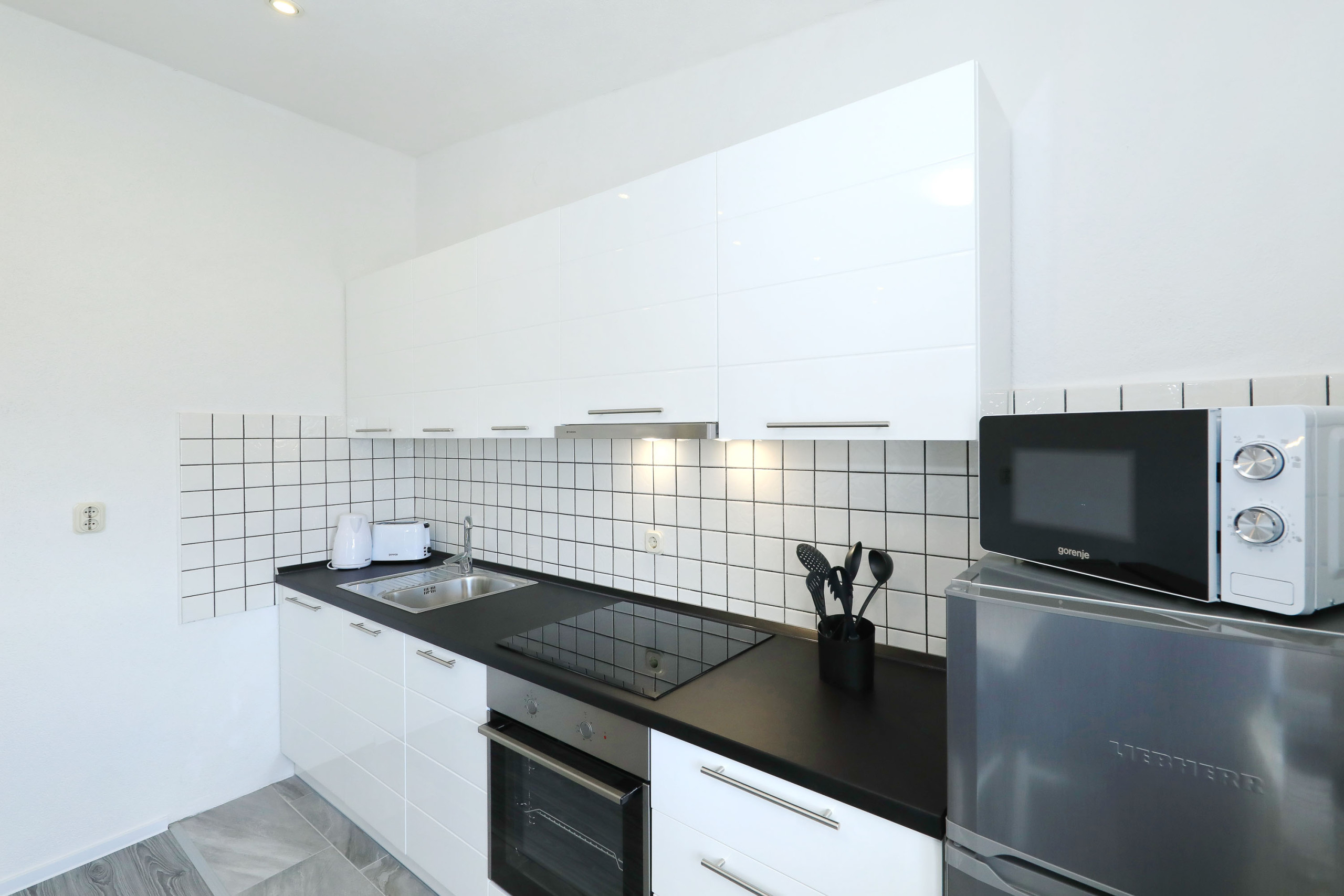 In the hotplate of glass ceramics open plan kitchen, refrigerator, microwave, oven, freezer, dishwasher, dishes/cutlery, kitchen utensils, coffee machine, toaster, kettle and hob are provided.