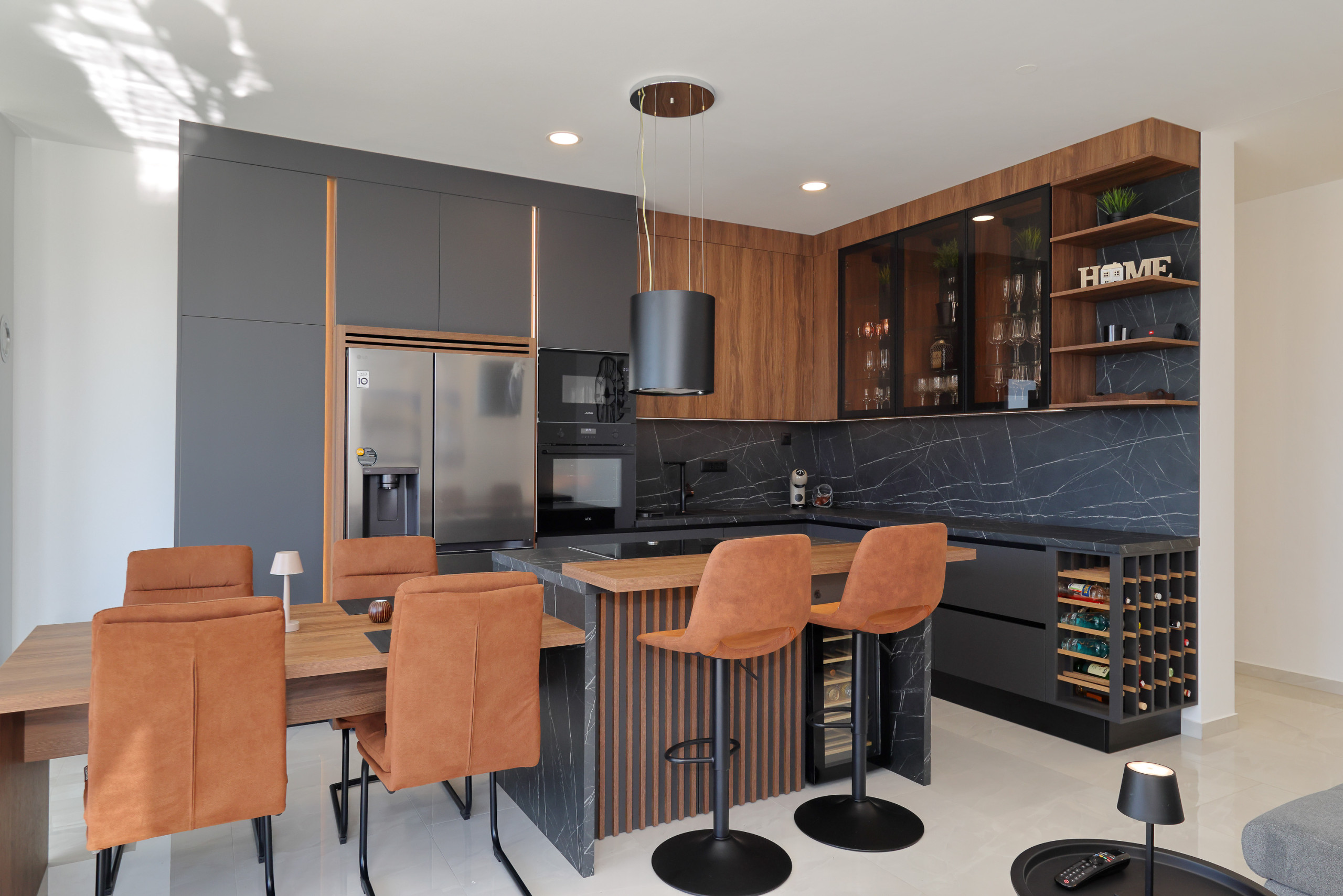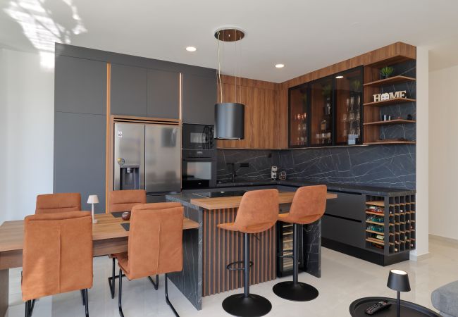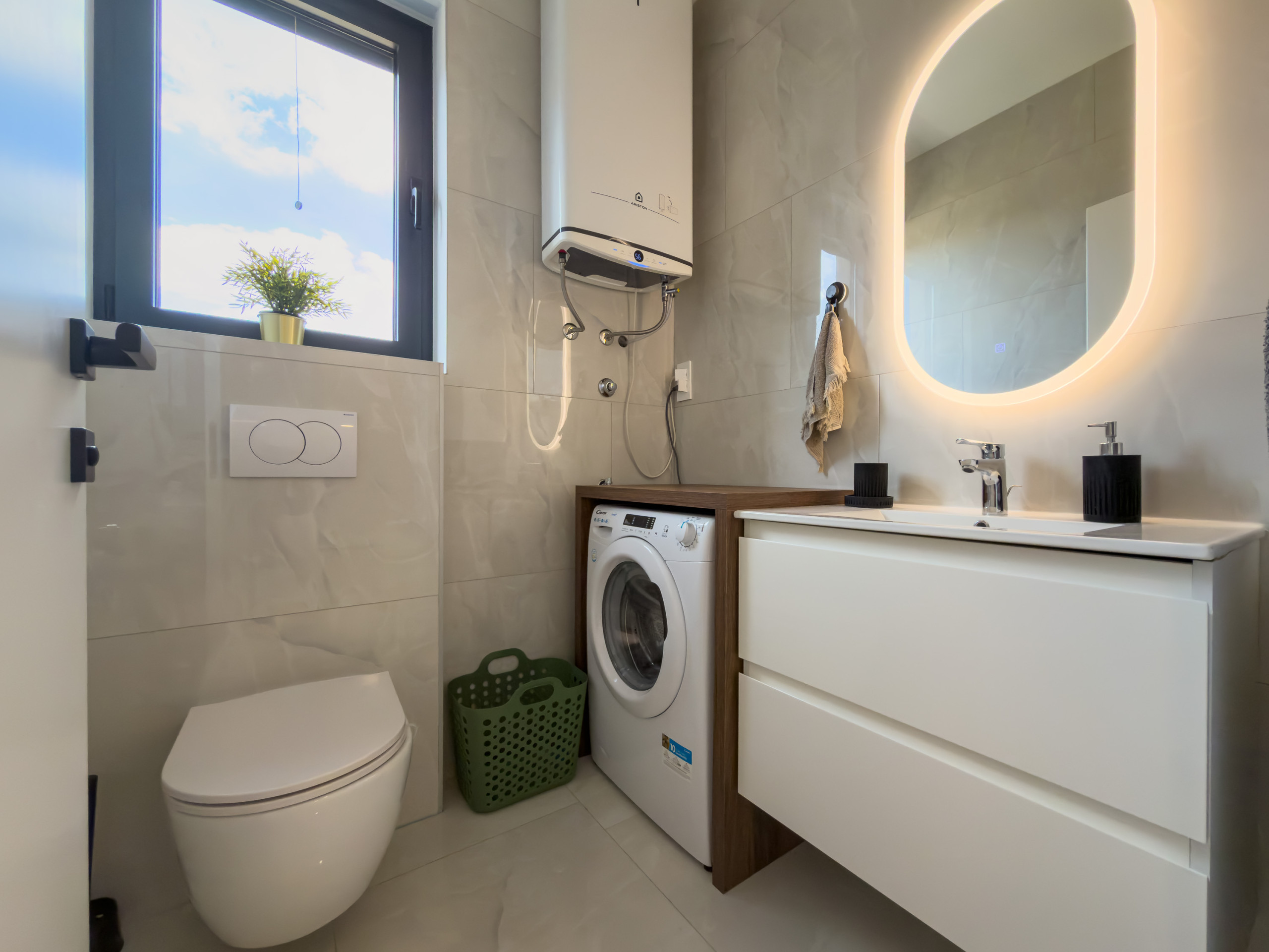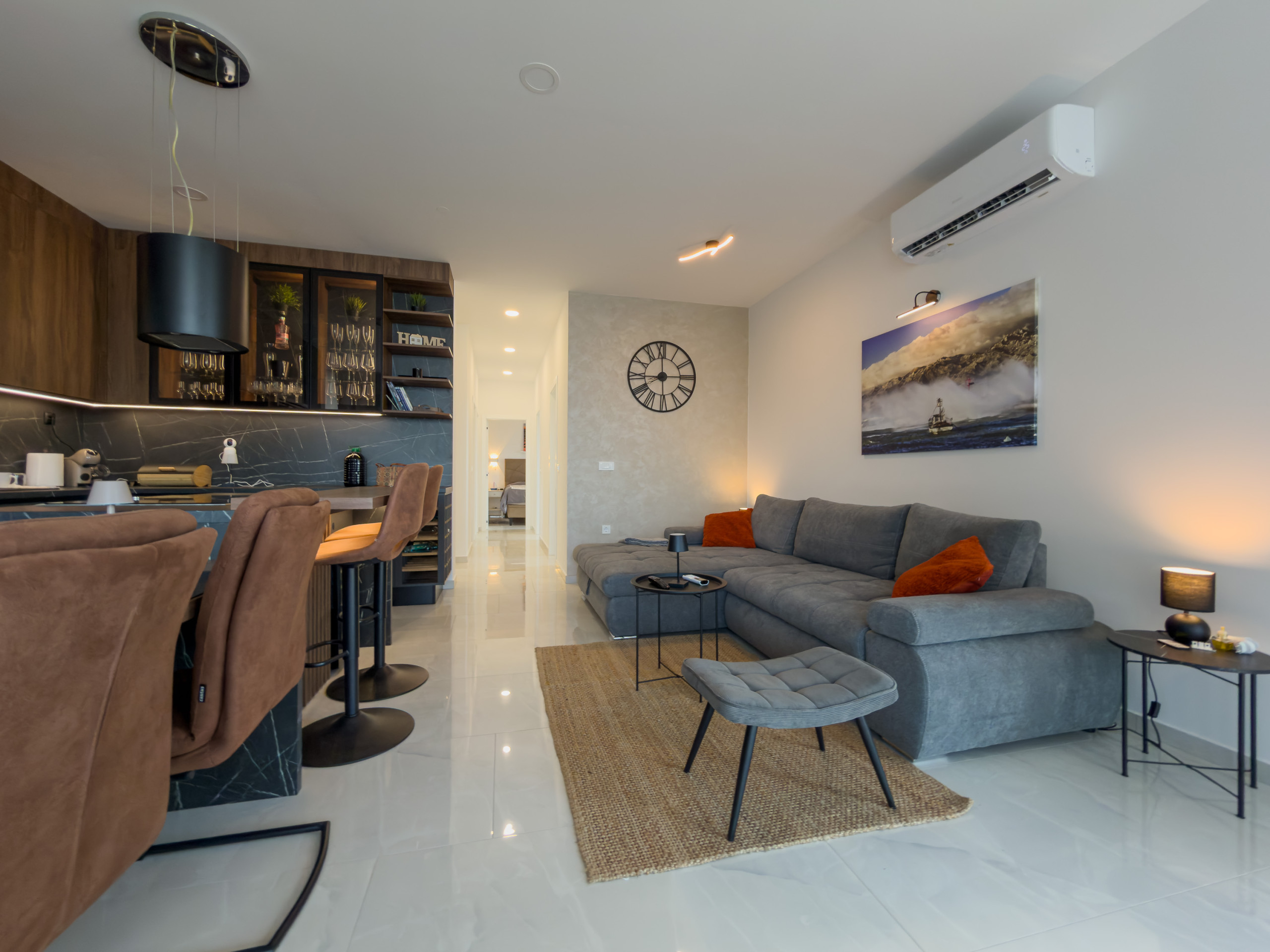The modern kitchen is fully equipped with top-quality appliances, including an induction cooktop, fridge, freezer, dishwasher, oven, microwave, coffee machine, and all necessary kitchenware. Perfect for preparing delightful meals and enjoying quality time together.