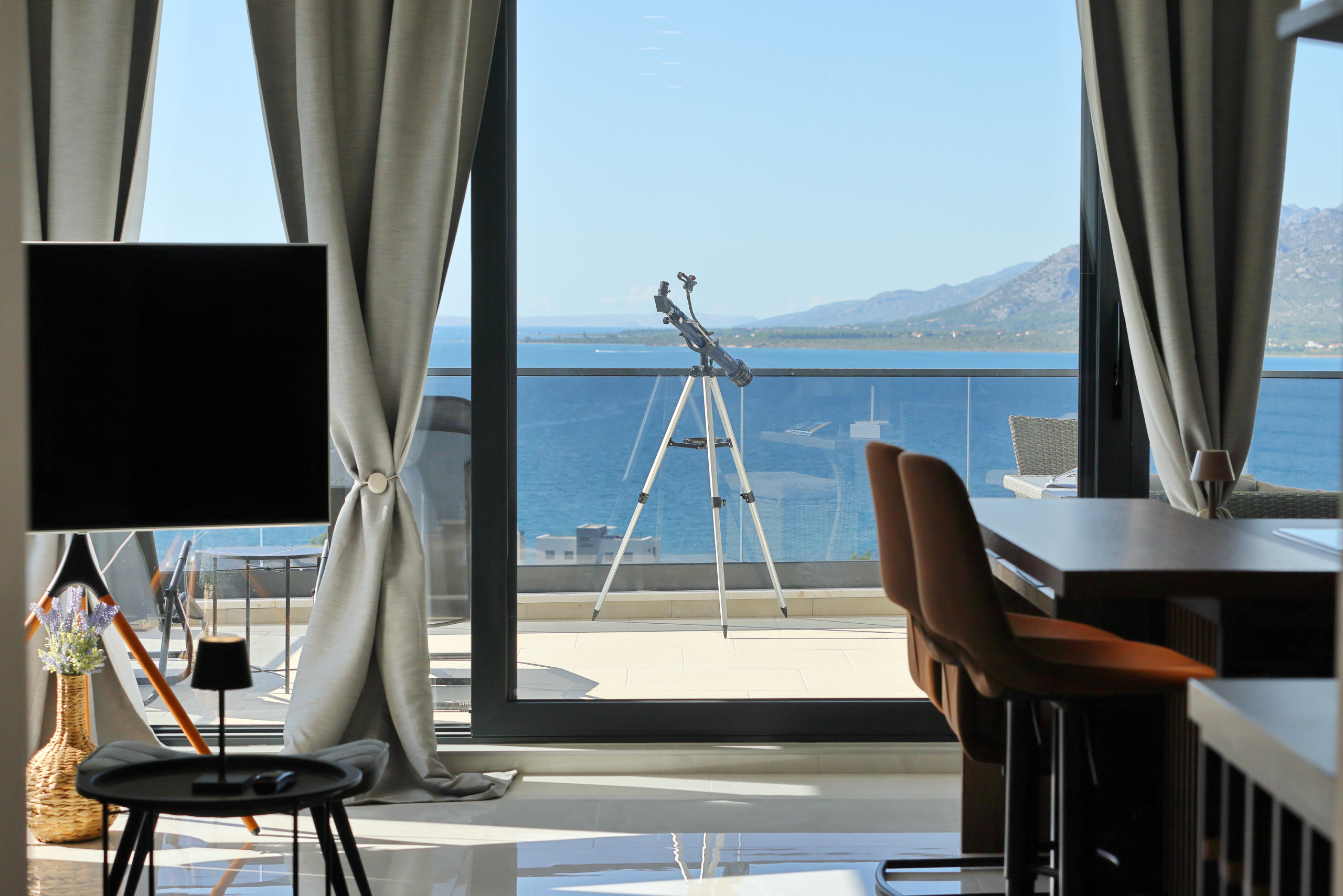 Step outside to the 20m² terrace and discover a private oasis with garden furniture and a barbecue area. The 500m² plot offers stunning views of the sea, mountains, and lush garden, creating a picturesque backdrop for relaxation. Air conditioning and a heat pump ensure comfort in all seasons, while high-speed WiFi keeps you connected.