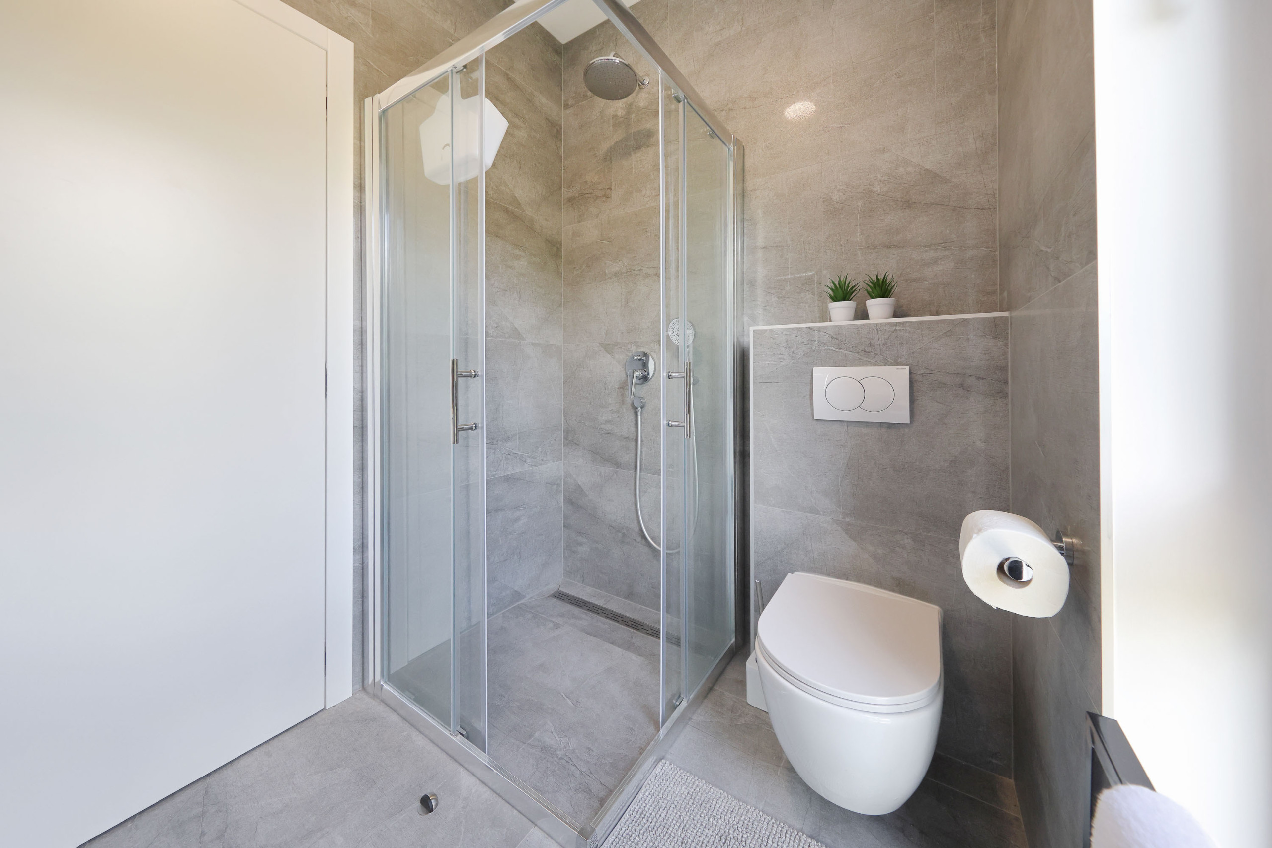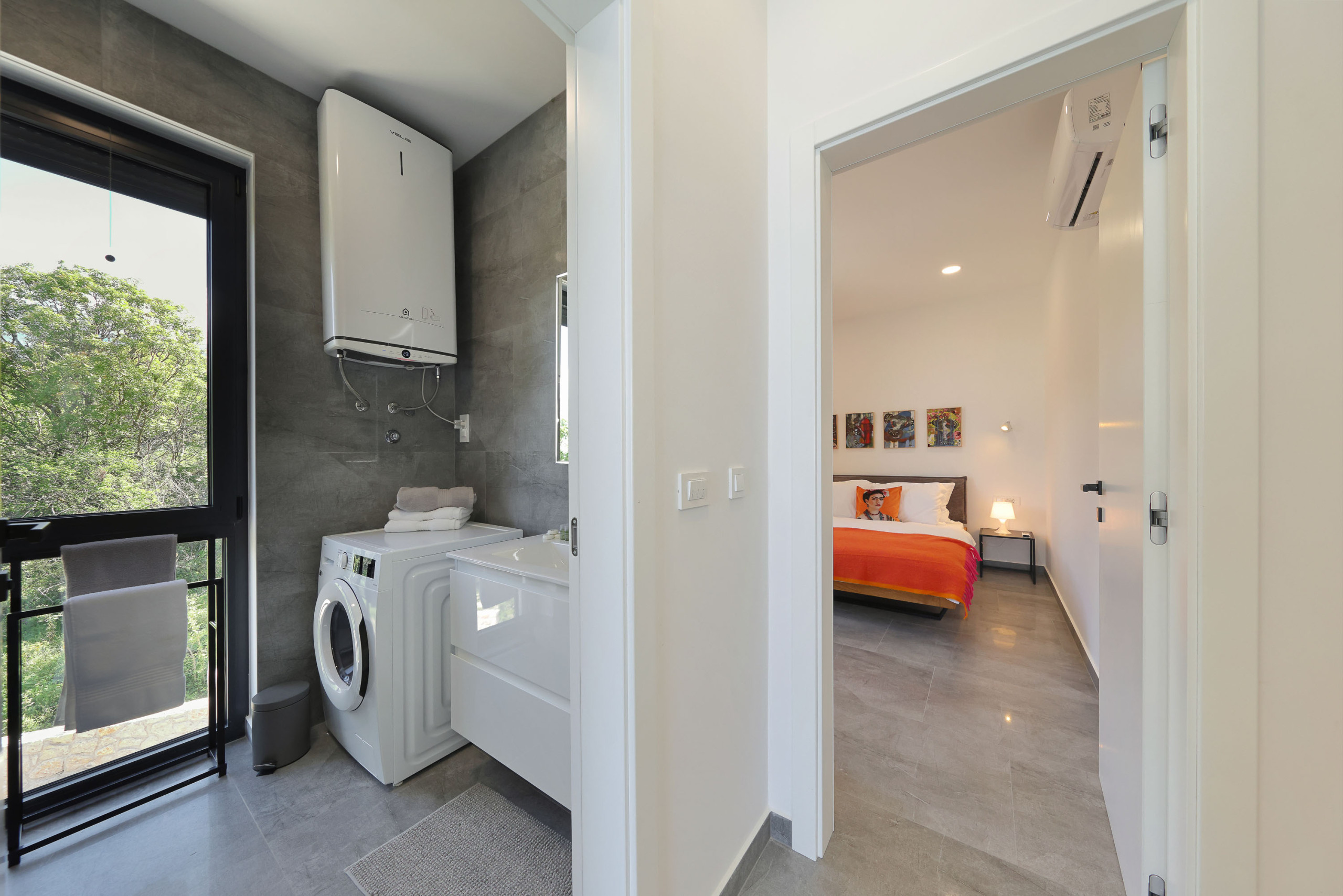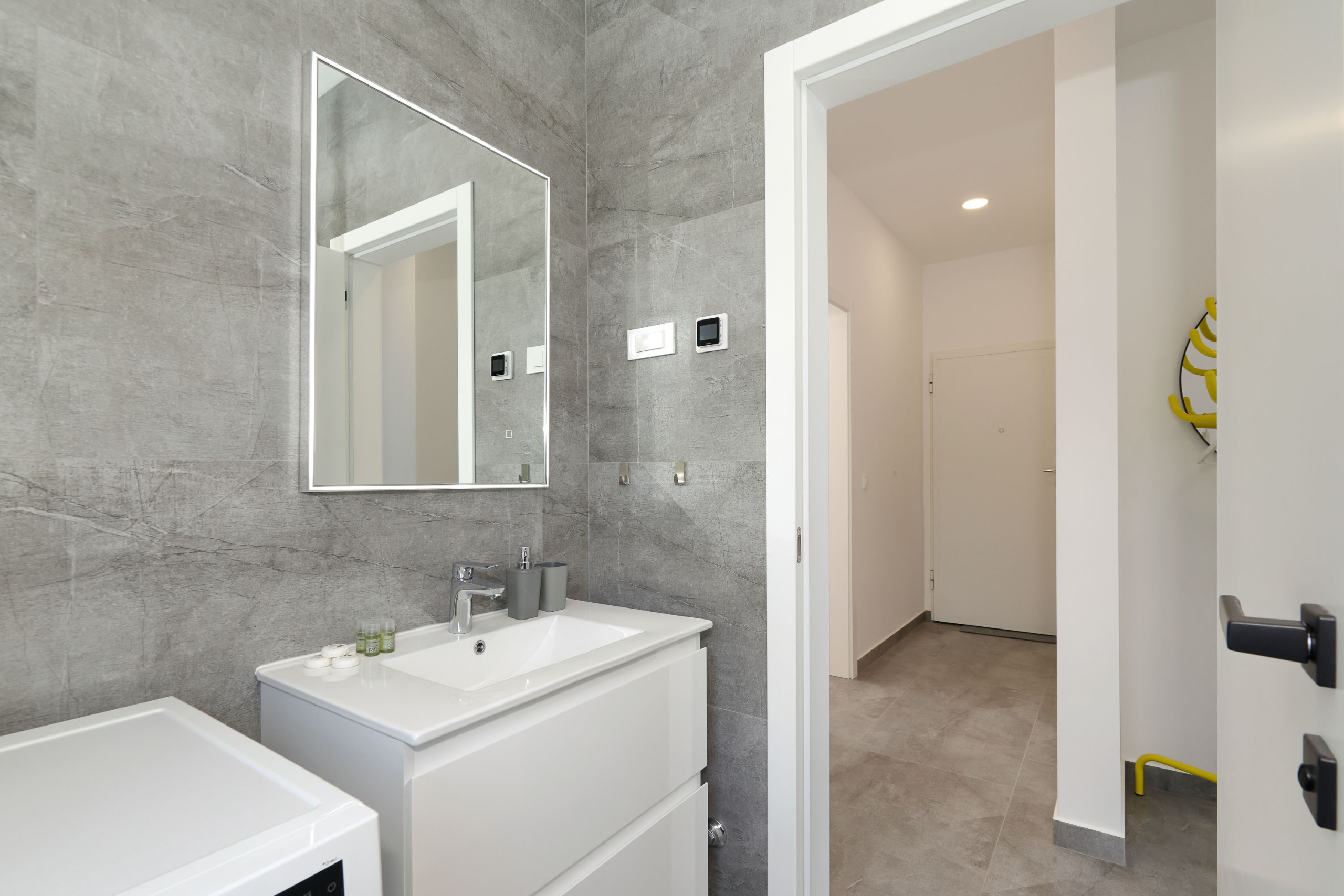 The modern bathroom includes a walk-in shower, toilet, and washing machine, and there's also a practical utility room with an iron, ironing board, and cleaning supplies. The entire apartment is tiled with high-quality porcelain tiles, contributing to a clean and allergy-friendly indoor environment.