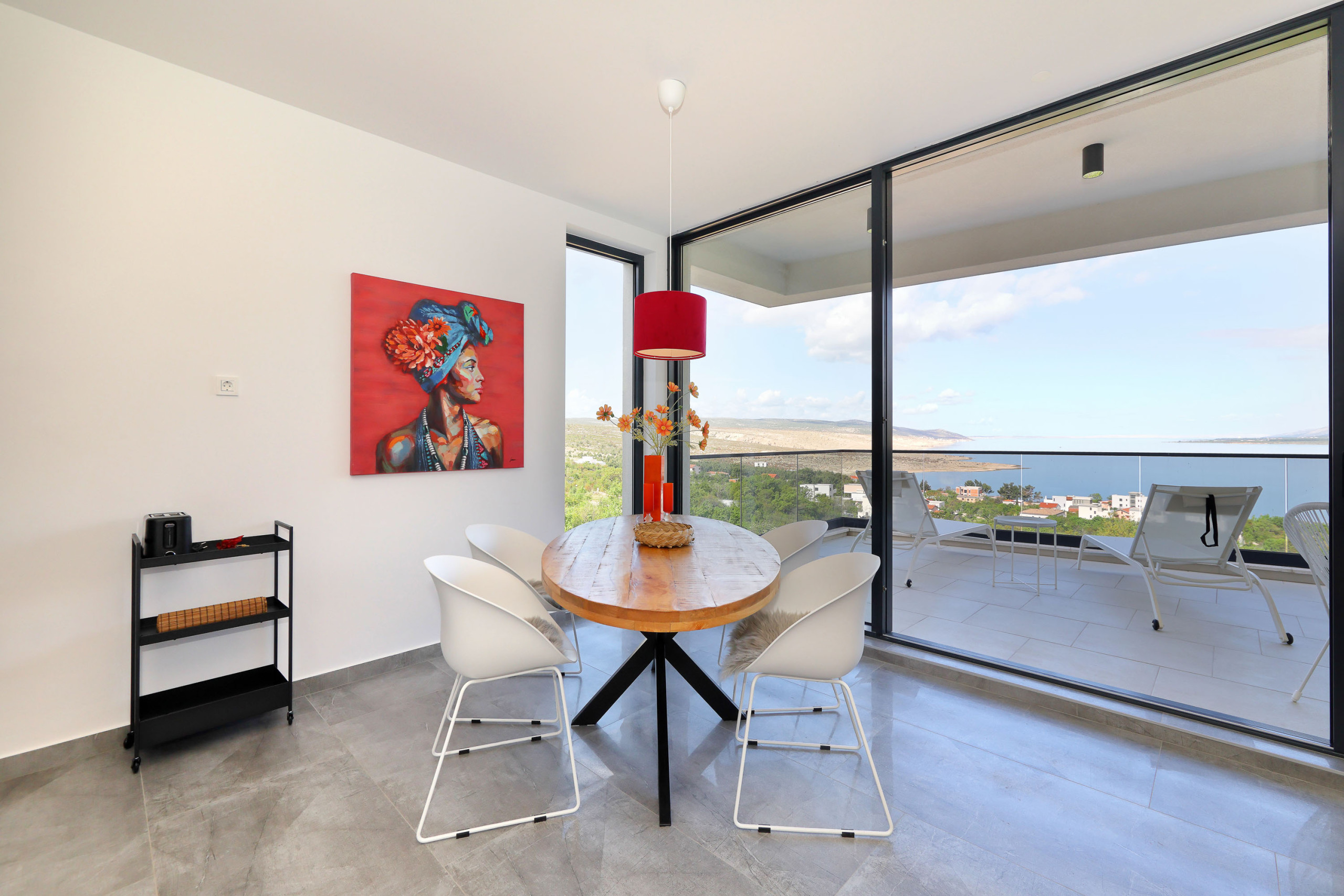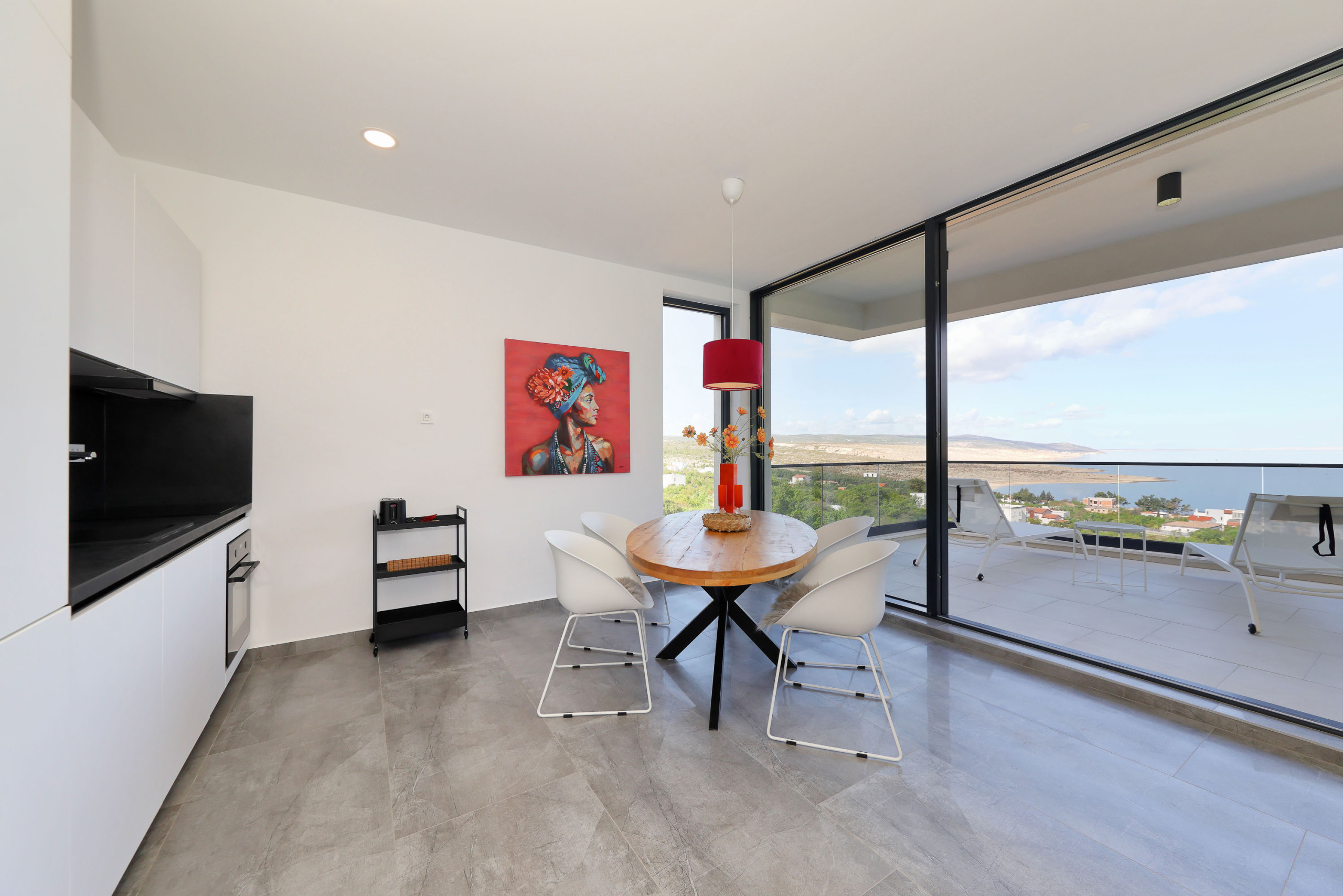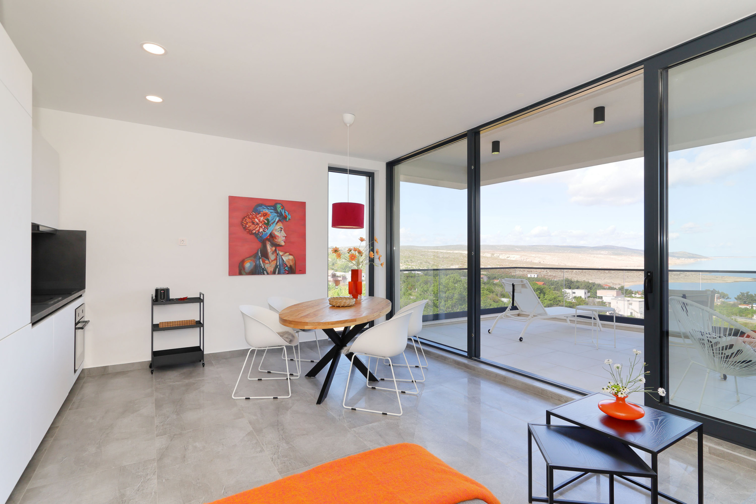 Welcome to Ferienwohnung Meerblick Rovanjska, a modern, air-conditioned holiday apartment in the peaceful seaside village of Rovanjska, just 10 km from the entrance to the stunning Paklenica National Park. Located on the second floor, this 65 m² apartment offers a spacious balcony with sun loungers and breathtaking panoramic views of the bay, the Adriatic Sea, and the Velebit Mountains – a perfect setting for morning coffee or evening relaxation with a view.