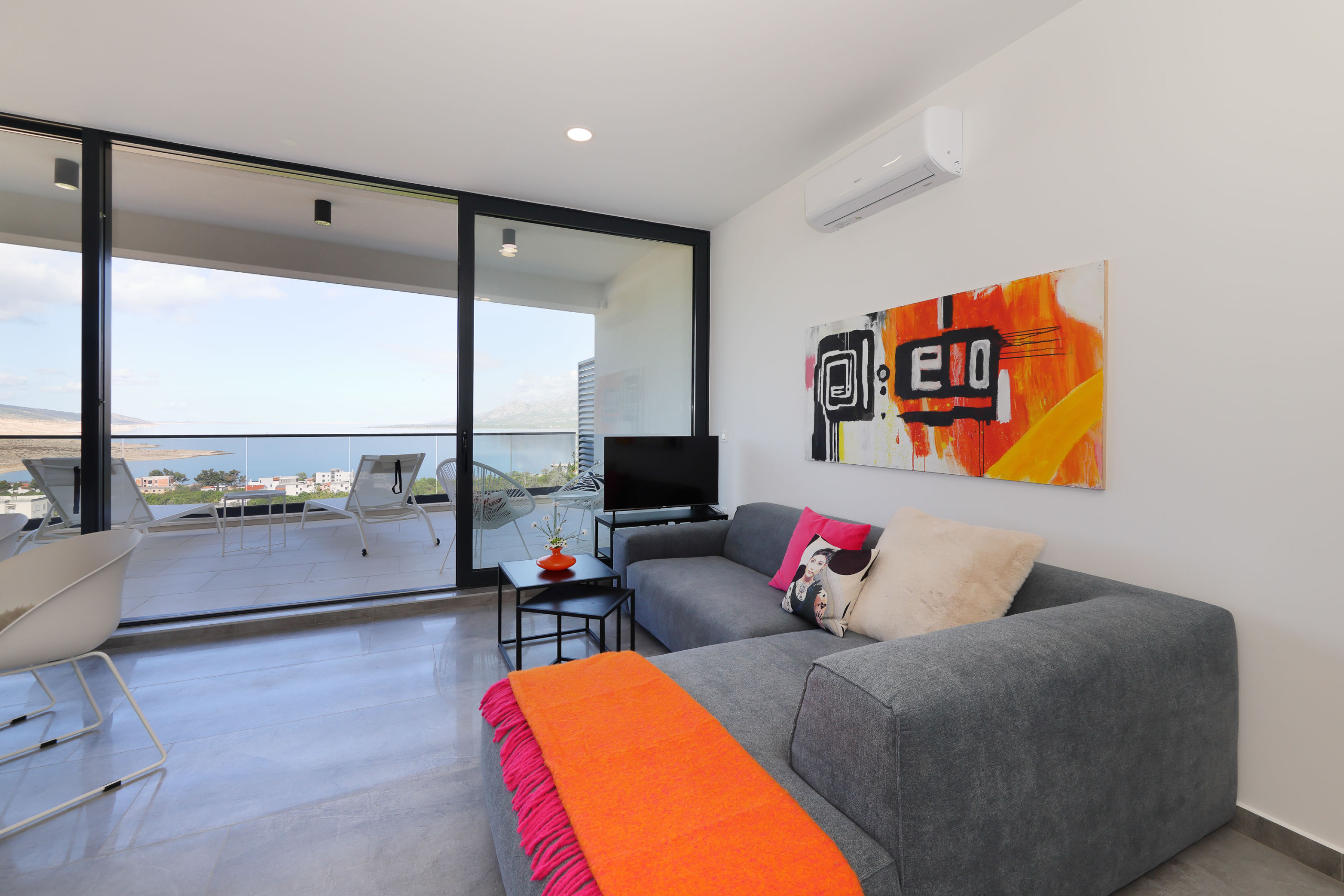 This comfortable and beautiful apartment can accommodate 7 people. It’s extremely luminous and airy. The kitchen is decorated in a modern way and is fully equipped. The living room has an extendable sofa bed that can accommodate 2 people. It’s equipped with a TV and air conditioning. The first room has a queen sized bed and access to the balcony. The second room has a queen sized bed and another single bed. The guests also have access to a washing machine. The balcony has a sea view and is equipped with a sofa and a coffee table.