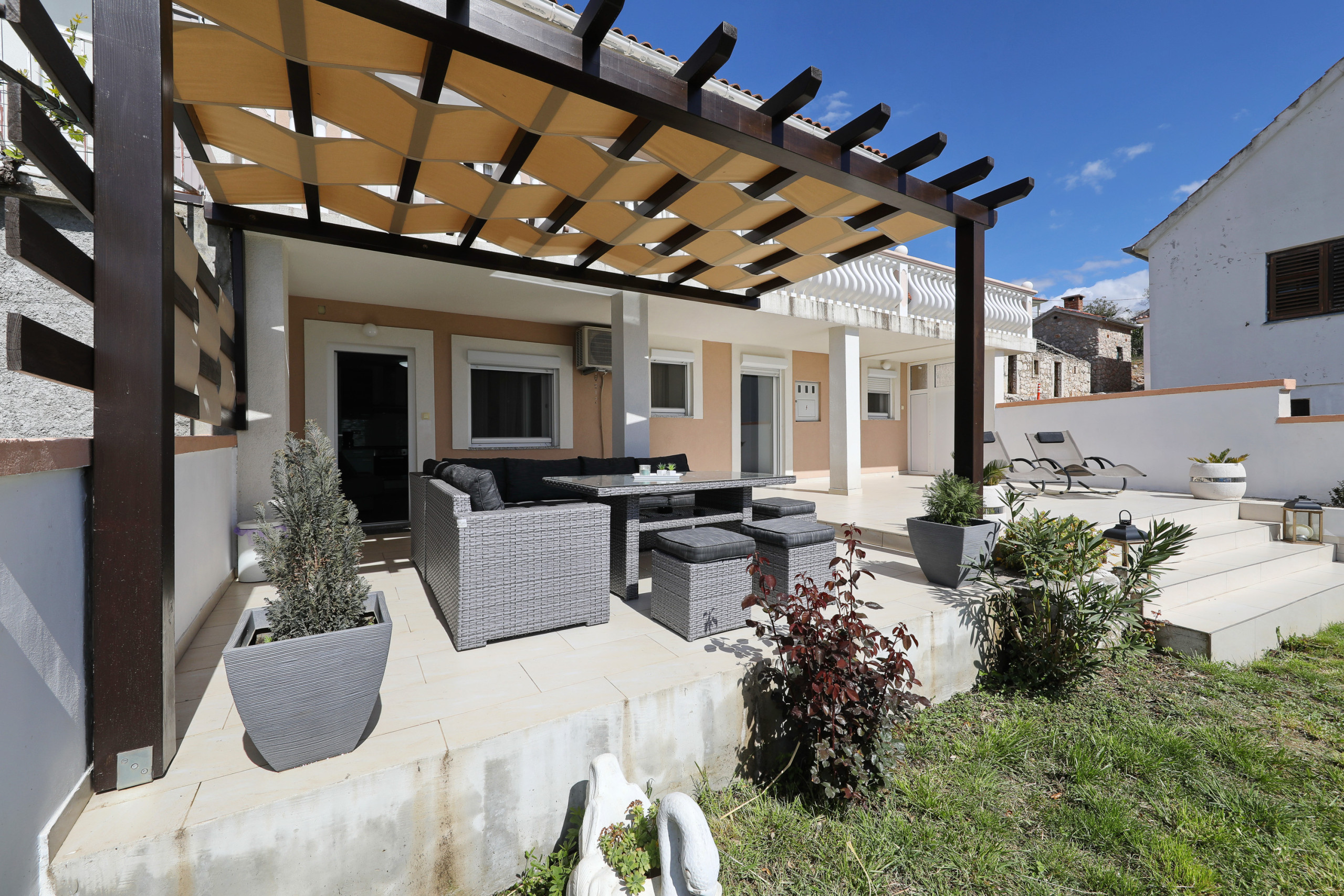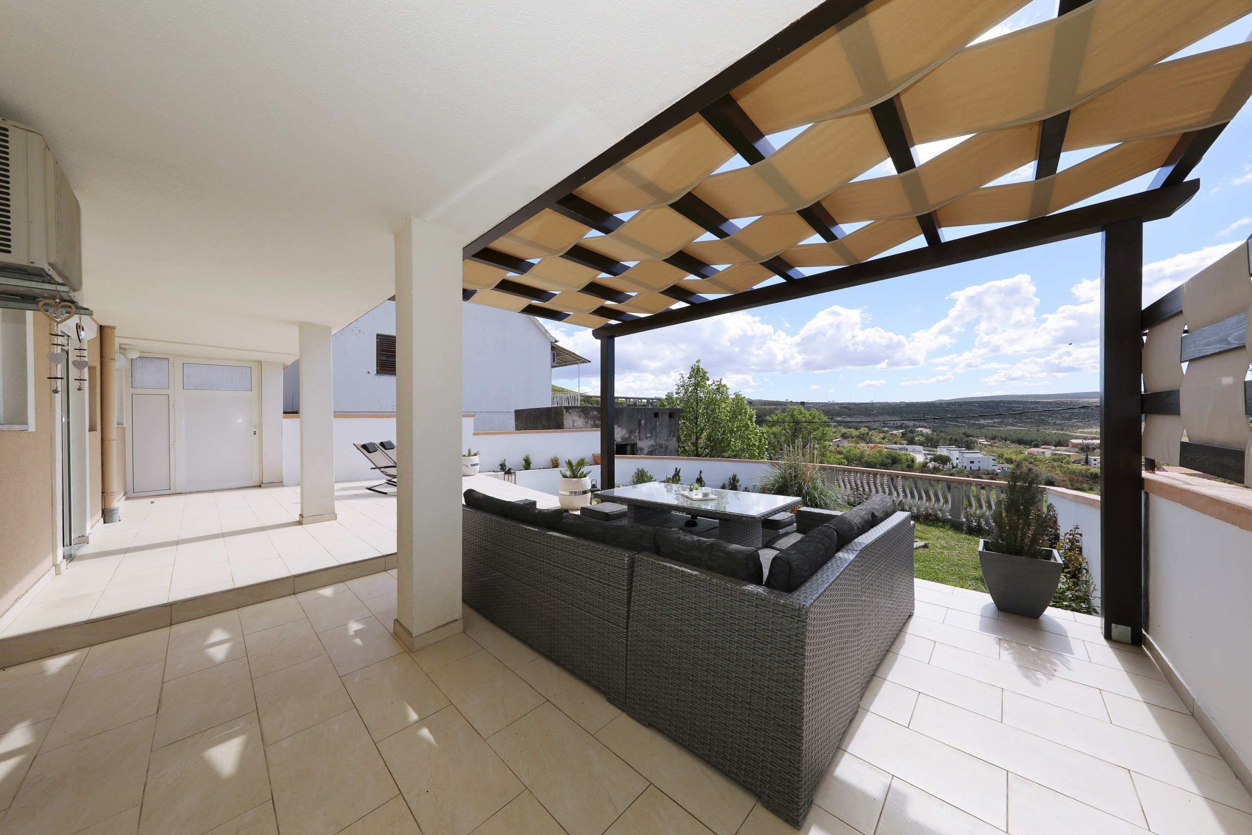 Welcome to Ferienwohnung Meerblick Rovanjska, a modern, air-conditioned holiday apartment in the peaceful seaside village of Rovanjska, just 10 km from the entrance to the stunning Paklenica National Park. Located on the second floor, this 65 m² apartment offers a spacious balcony with sun loungers and breathtaking panoramic views of the bay, the Adriatic Sea, and the Velebit Mountains – a perfect setting for morning coffee or evening relaxation with a view.