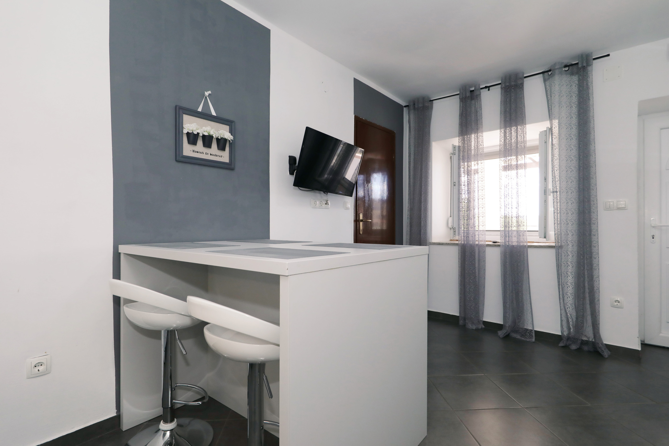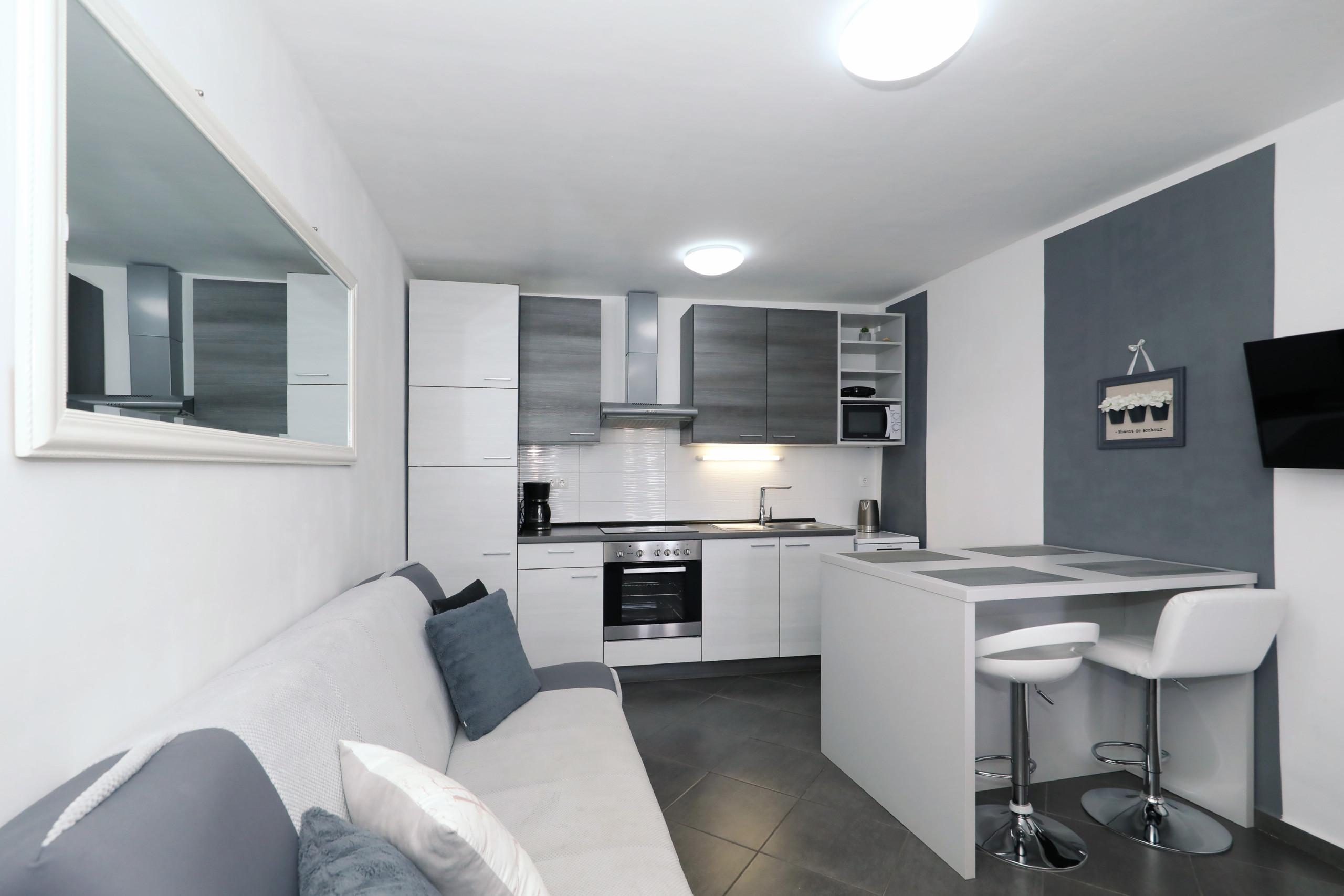 This comfortable apartment can accommodate 4 people. It’s extremely luminous and airy. The kitchen is decorated in a modern way and is fully equipped.