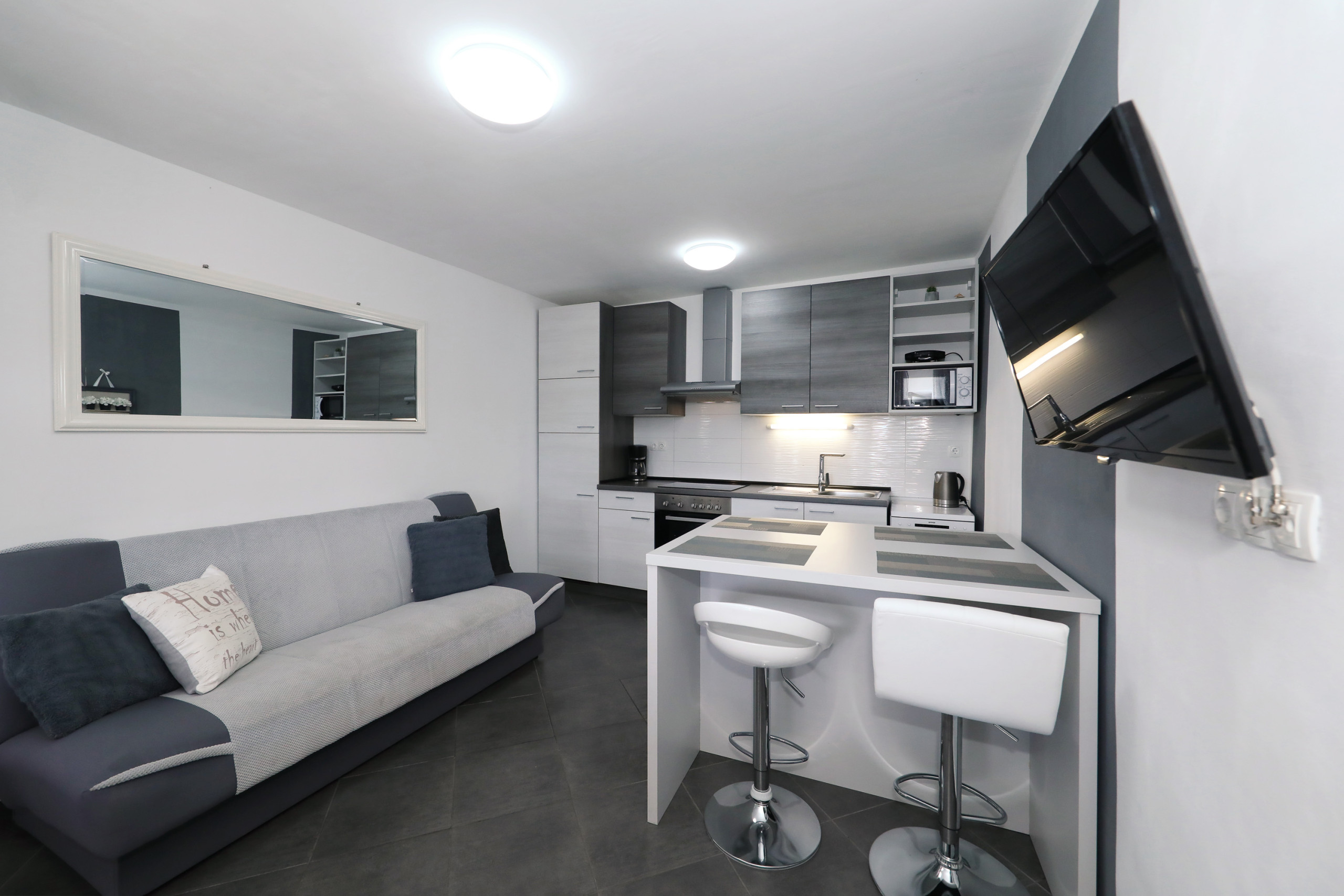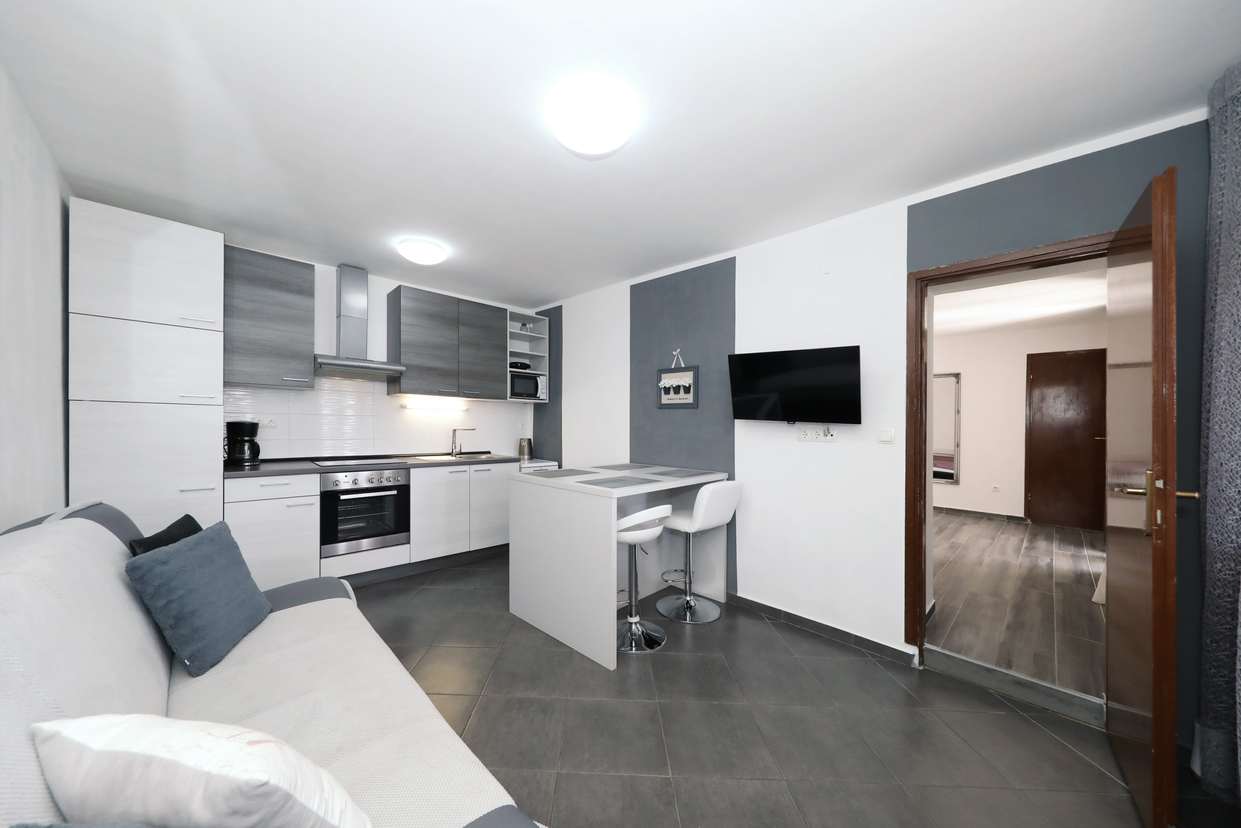 Inside, you’ll find two comfortable bedrooms, both air-conditioned and equipped with double beds, ensuring a restful night’s sleep even during the warm summer months. The bright and open living room invites you to unwind on the cozy sofa or catch up on a movie with the Smart TV, while a dedicated work desk and fast, free Wi-Fi make the apartment suitable even for remote working. The fully equipped open kitchen allows for easy self-catering, with all essential appliances and utensils provided.