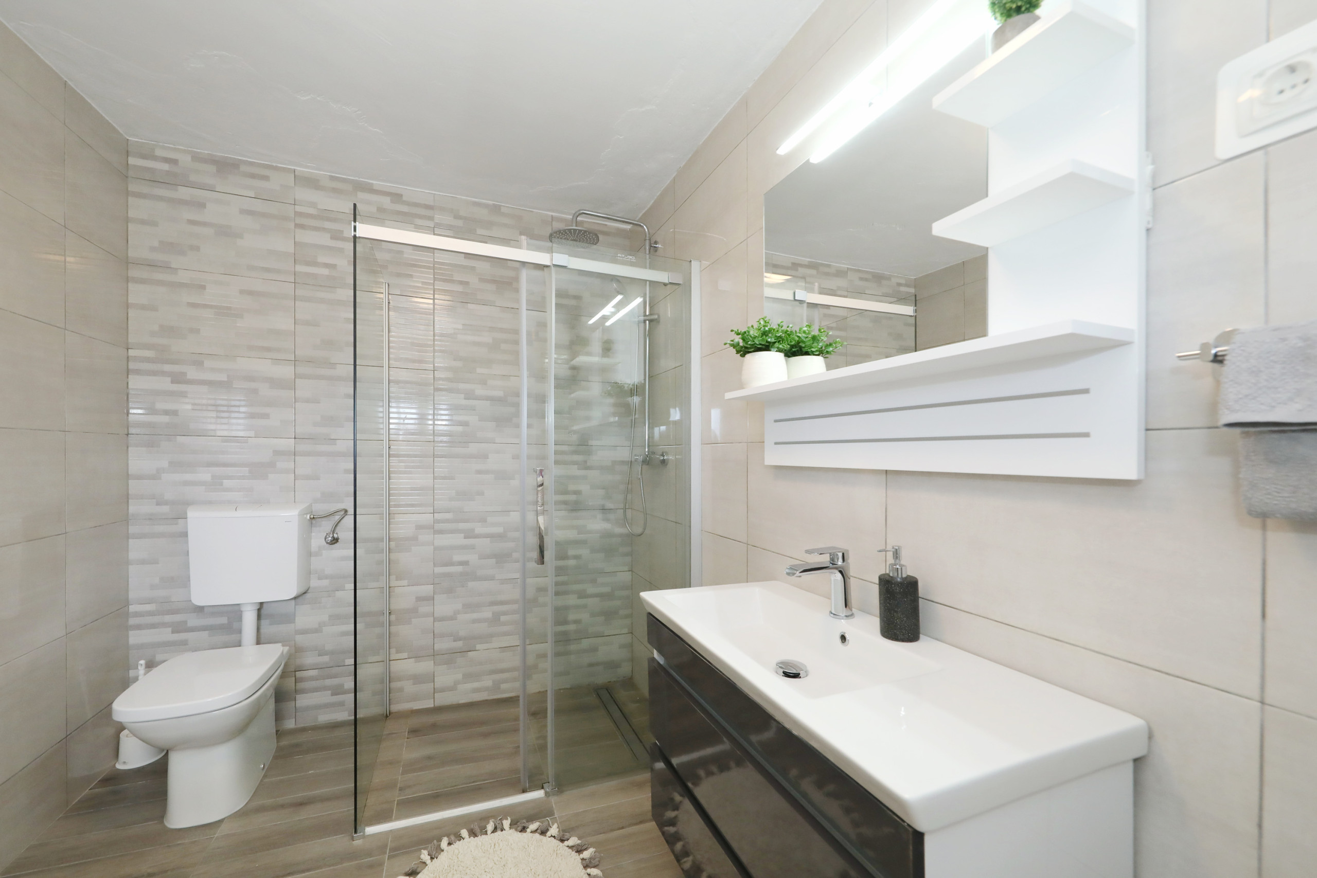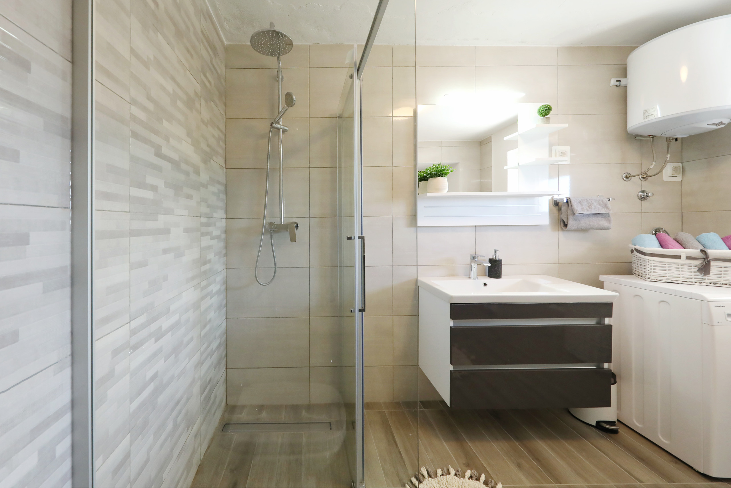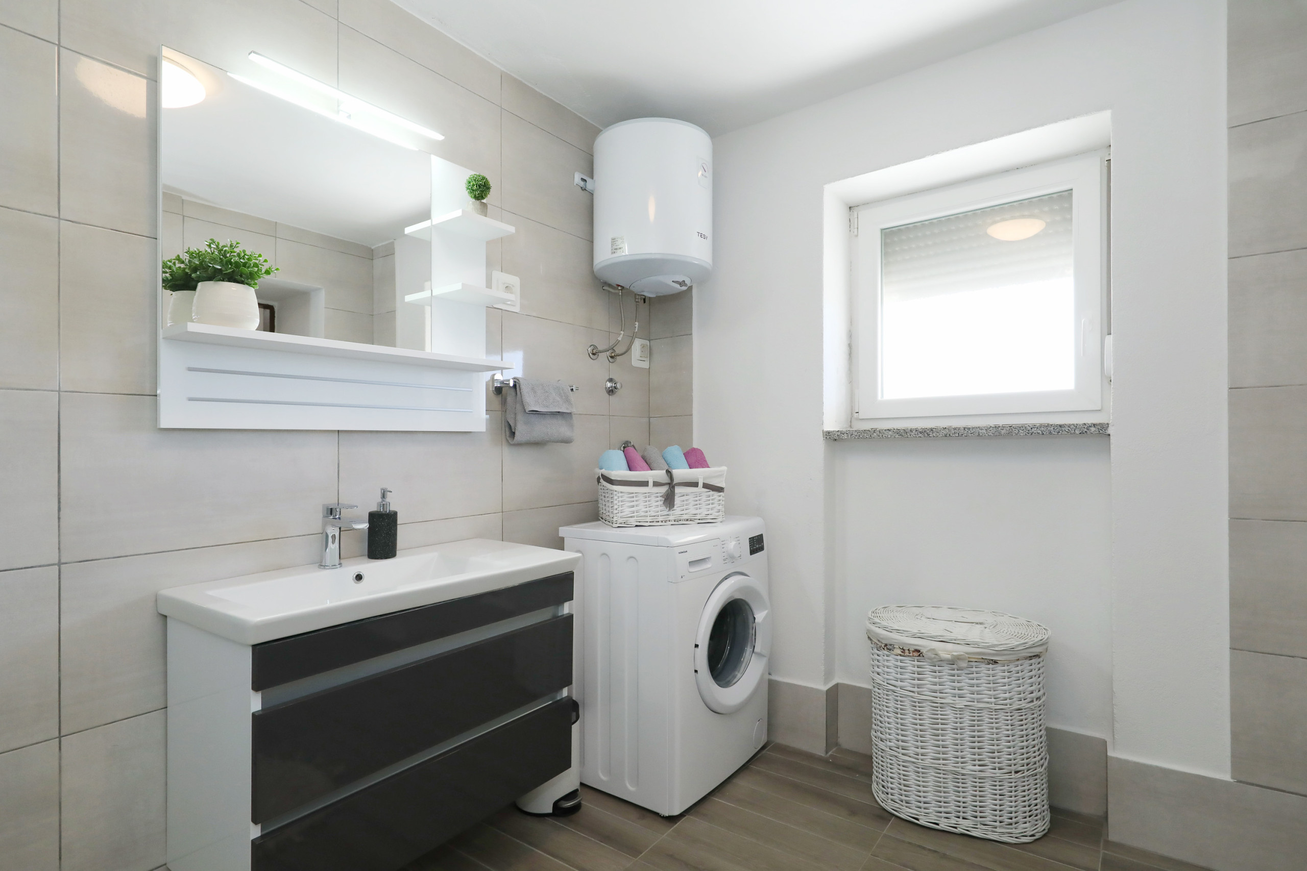 The modern bathroom includes a walk-in shower, toilet, and washing machine, and there's also a practical utility room with an iron, ironing board, and cleaning supplies. The entire apartment is tiled with high-quality porcelain tiles, contributing to a clean and allergy-friendly indoor environment.