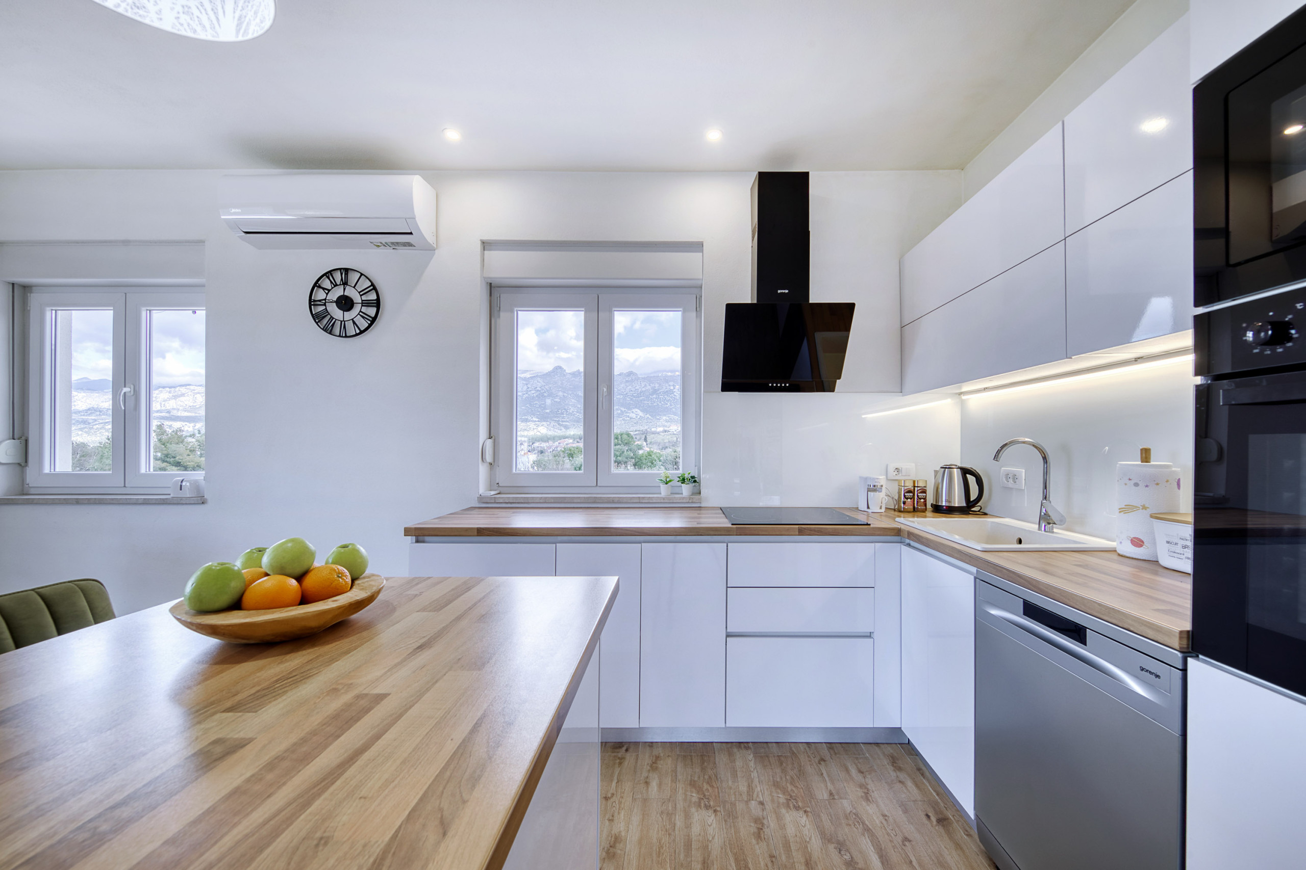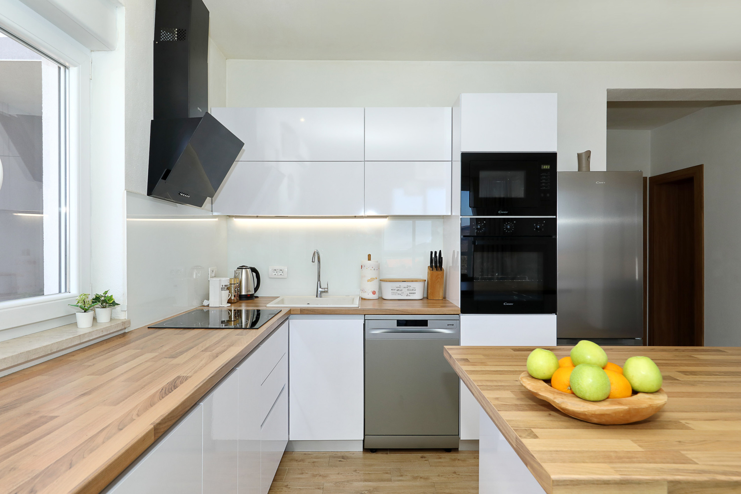 The heart of the home is its fully equipped American-style kitchen, featuring modern appliances including a glass-ceramic stove, oven, microwave, dishwasher, fridge, freezer, and coffee machine. Cooking enthusiasts will appreciate the comprehensive kitchenware and dining essentials, making meal preparation a pleasure. A dining table invites shared meals and memorable conversations.