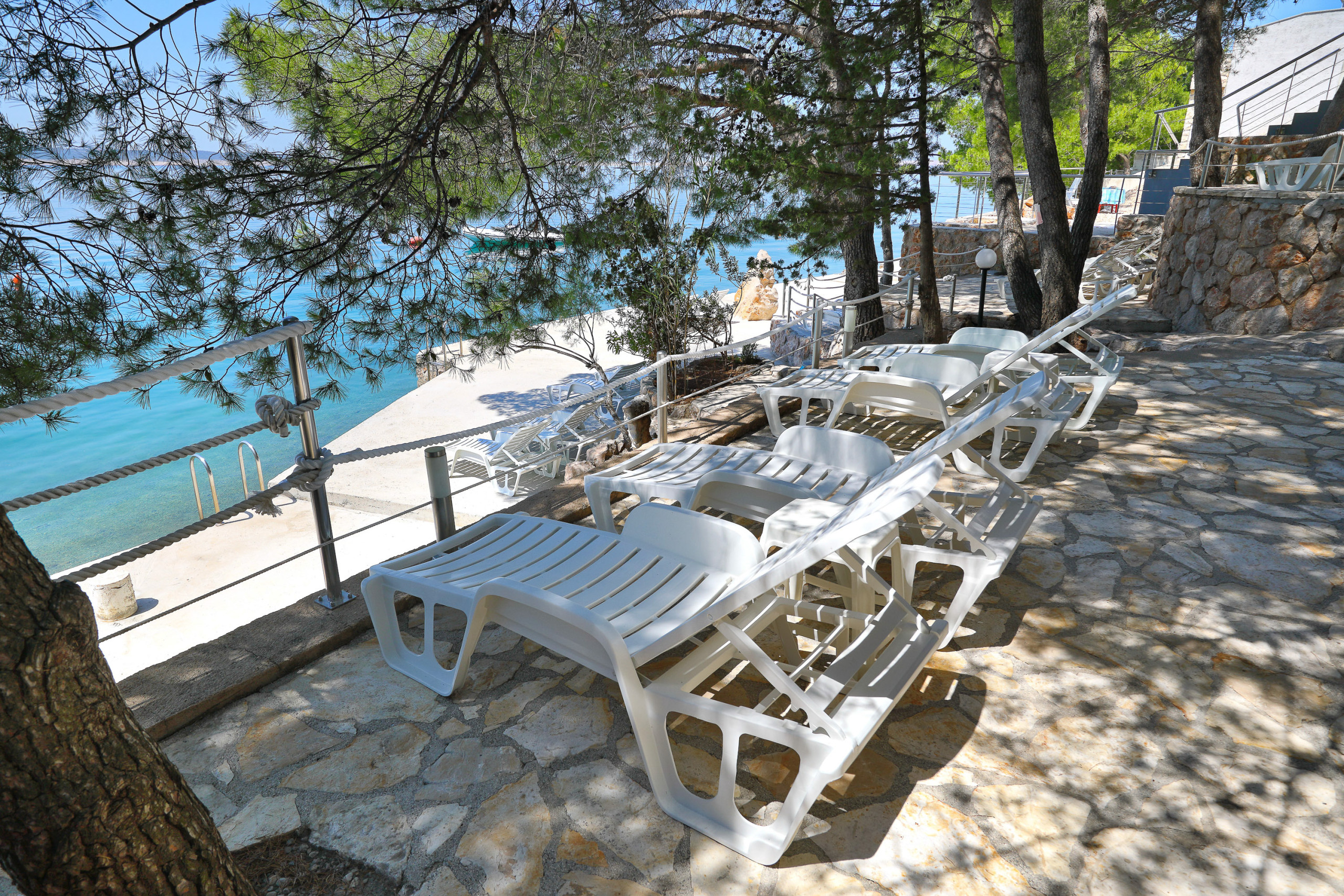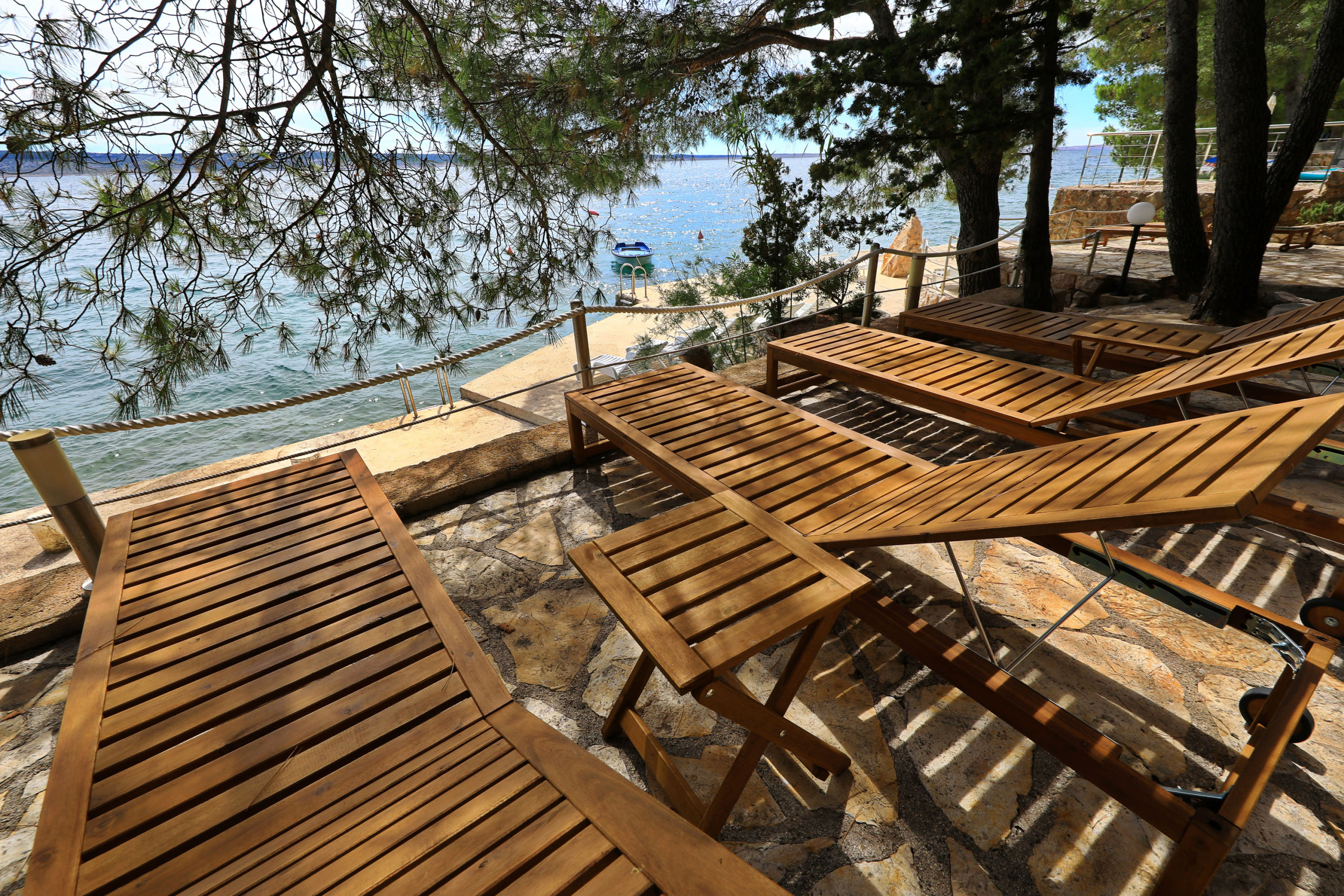 Aside from the balcony, the guests also have access to a 160m2 shared terrace with a gorgeous panoramic view which is equipped with tables and benches and a grill. The property has its own 400m2 private beach with loungers (in the sun and in the shade) and a small, quiet bar equipped with drinks, coffee machine and a TV.