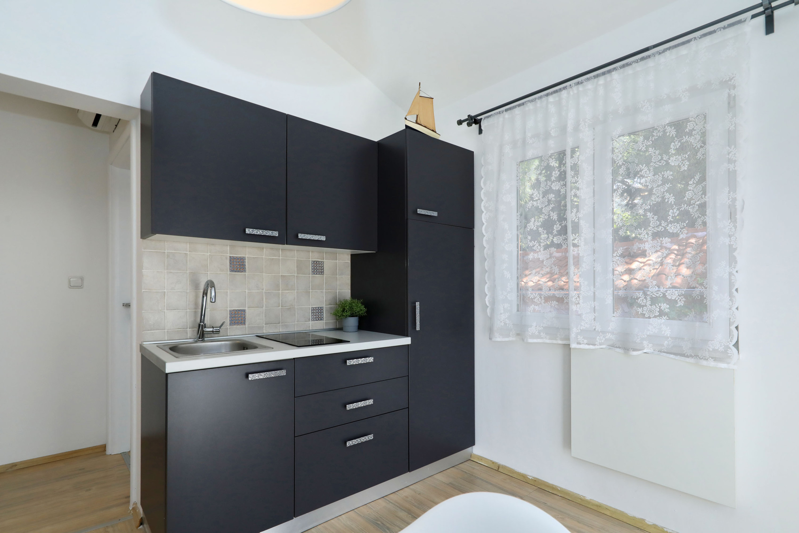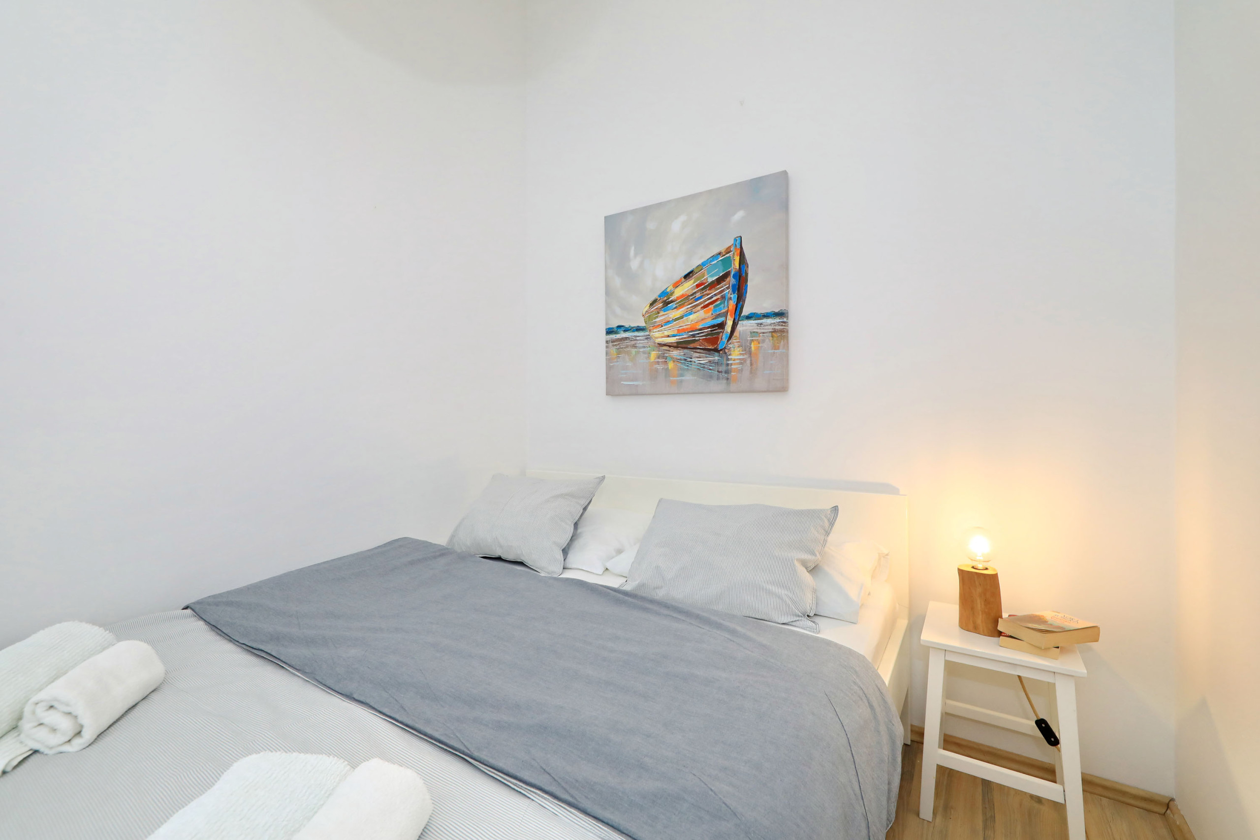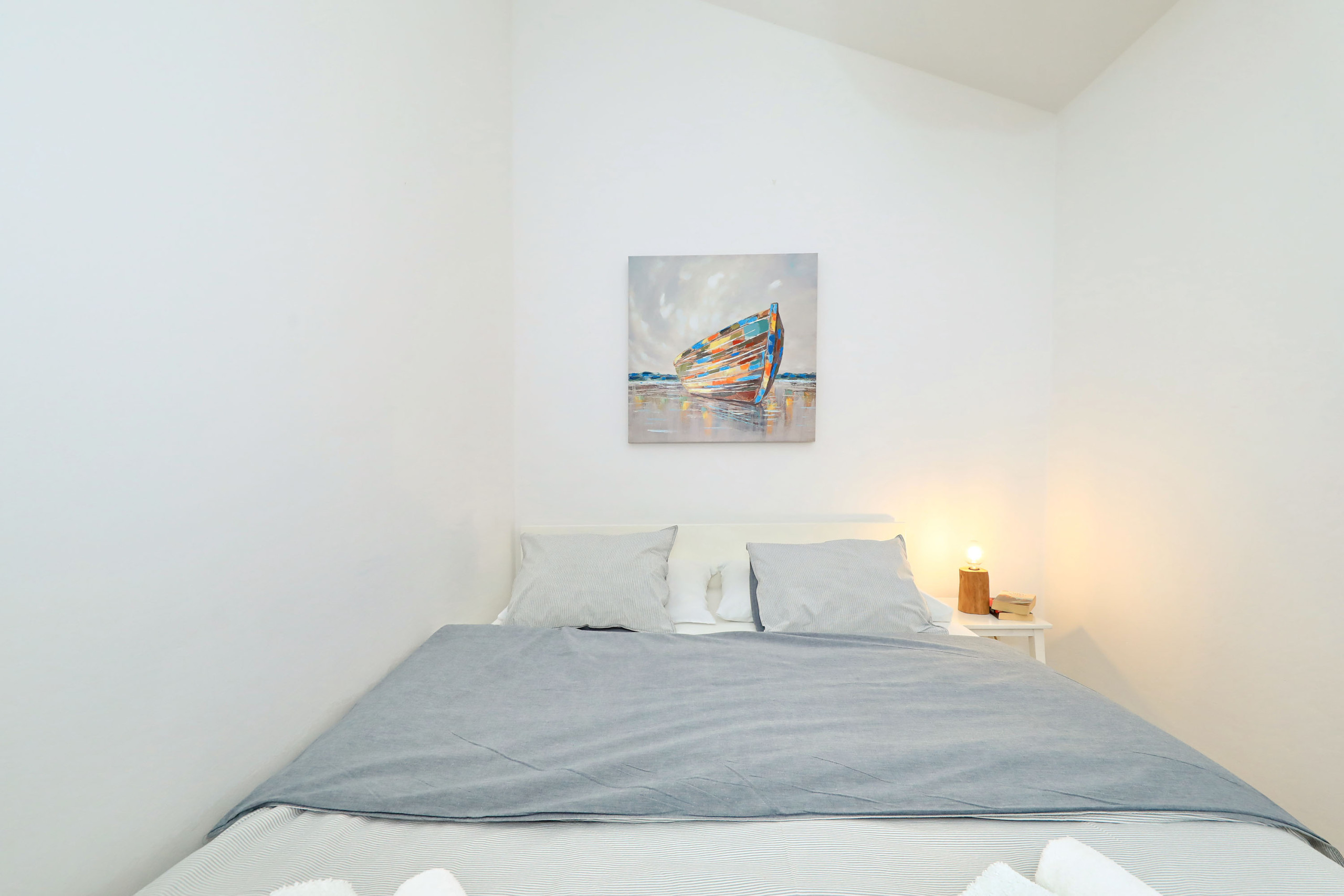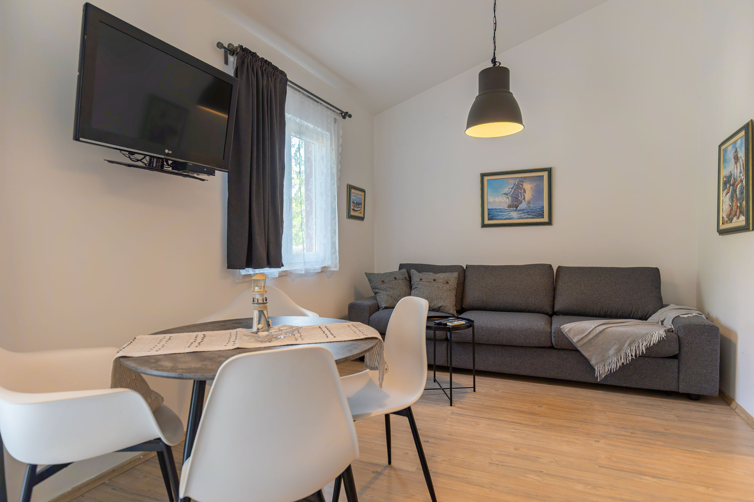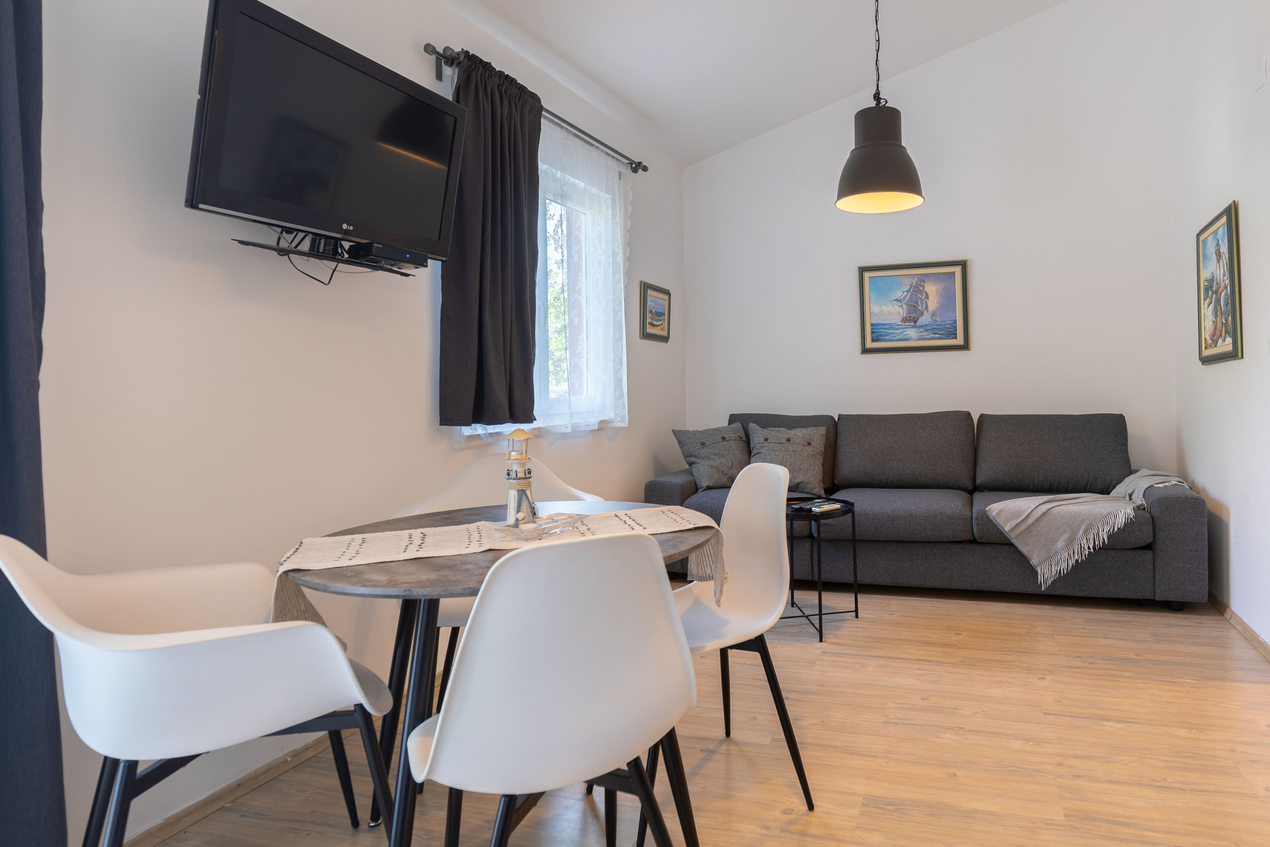 Apartment No.5 is located on the second floor. It consists of a kitchen, a dining area, a living area, a bedroom and a bathroom. The kitchen has modern appliances and is fully equipped. The dining area is connected to the kitchen and is equipped with a table for 4 people. The living area is equipped with a flat screen TV with satellite programs and a sofa bed that can accommodate 2. The bedroom is equipped with a queen sized bed and a wardrobe. The dining area has access to a furnished balcony and has a view of the sea.