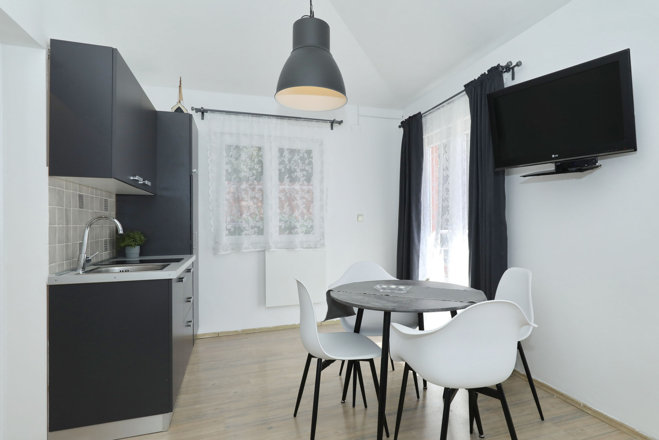 Apartment No.3 is located on the second floor. It consists of a kitchen, a dining area, a living area, a bedroom and a bathroom. The kitchen has modern appliances and is fully equipped. The dining area is connected to the kitchen and is equipped with a table for 4 people. The living area is equipped with a flat screen TV with satellite programs and a sofa bed that can accommodate 2. The bedroom is equipped with a queen sized bed and a dresser. The dining area has access to a furnished balcony and has a partial view of the sea.
