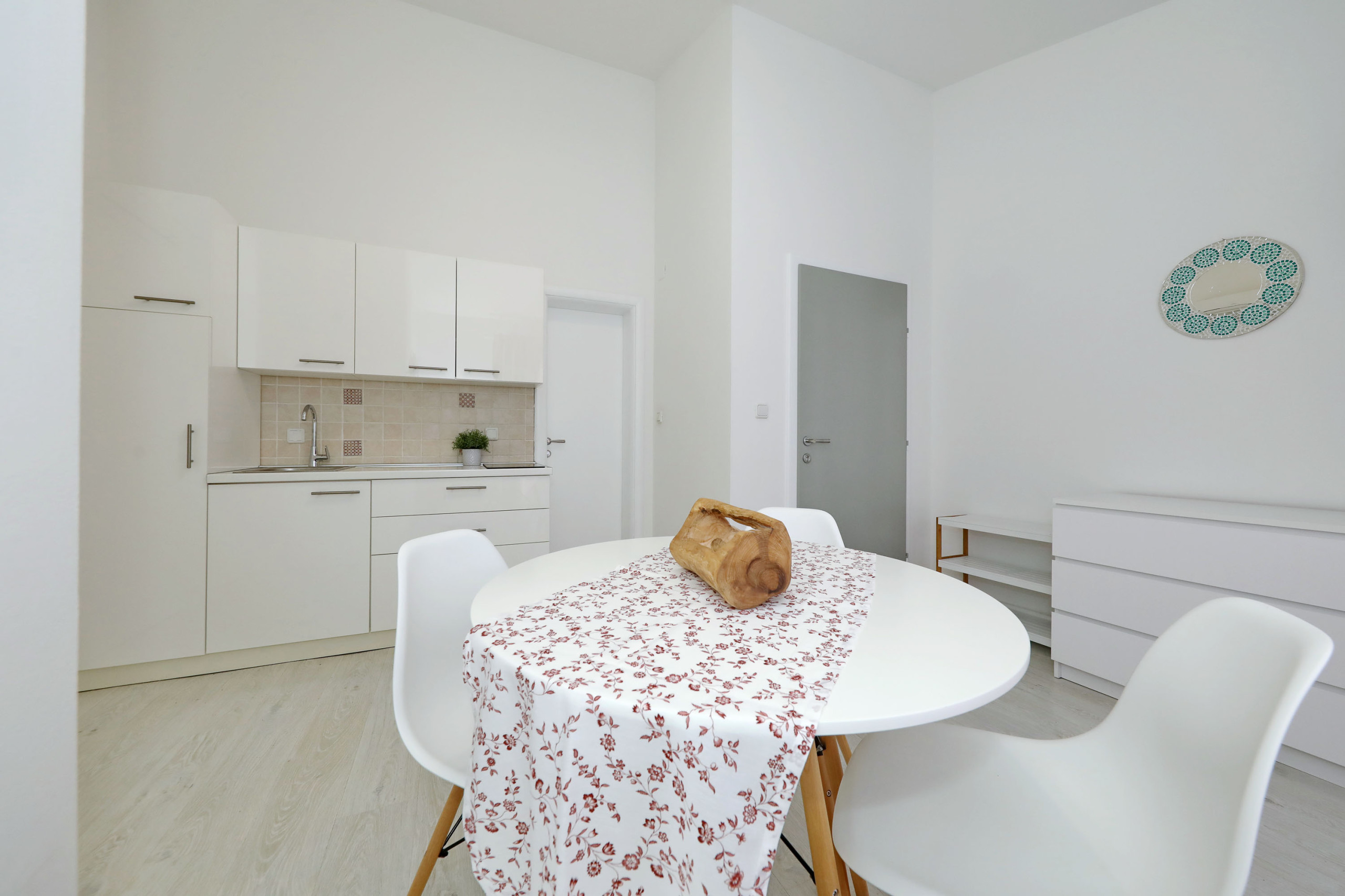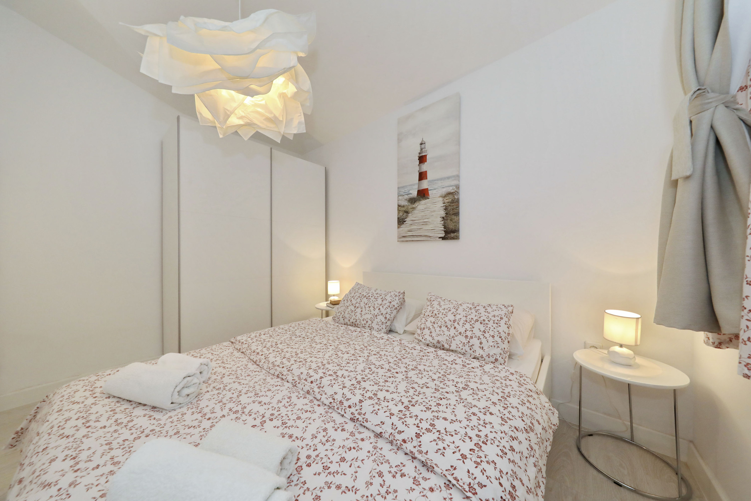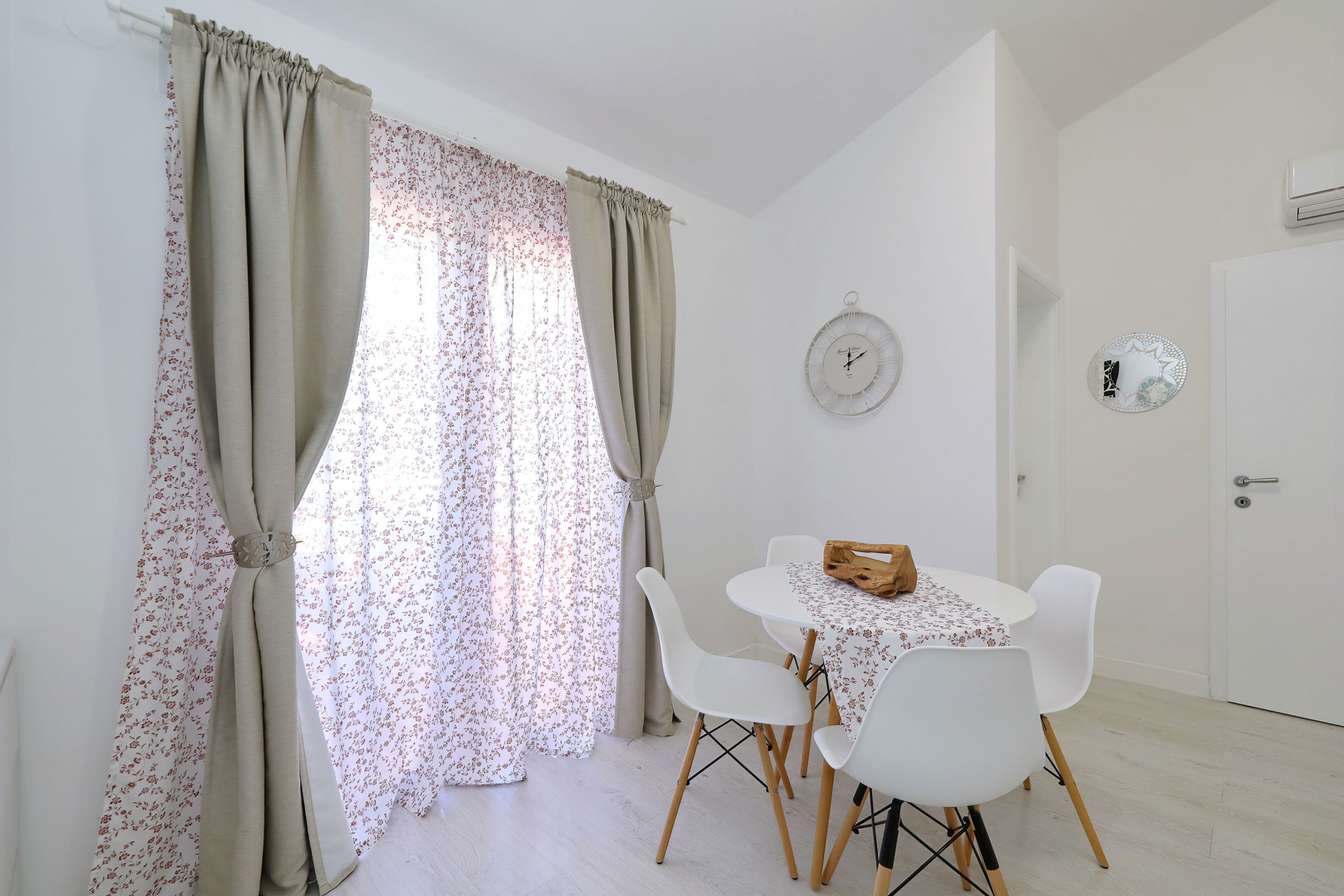 Apartment No.4 is located on the second floor. It consists of a kitchen, a dining area, two bedrooms and a bathroom. The kitchen has modern appliances and is fully equipped. The dining area is connected to the kitchen and is equipped with a table for 4 and a flat screen TV with satellite programs. The first bedroom has a comfortable queen sized bed, and the second bedroom has a bunk bed (2x 90x200cm) with a wardrobe. The dining area has access to a furnished balcony.