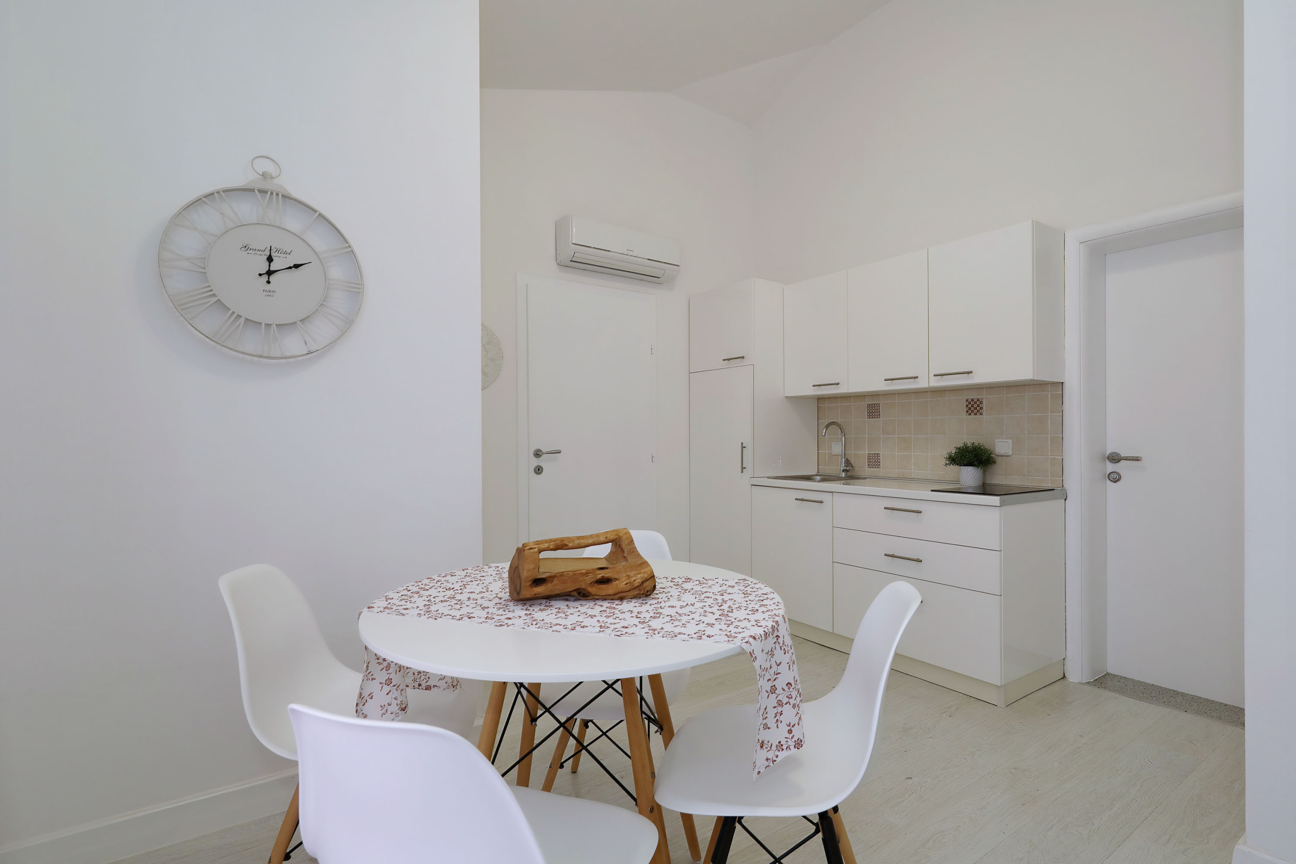 Apartment No.6 is located on the second floor. It consists of a kitchen, a dining area, a living area, a bedroom and a bathroom.