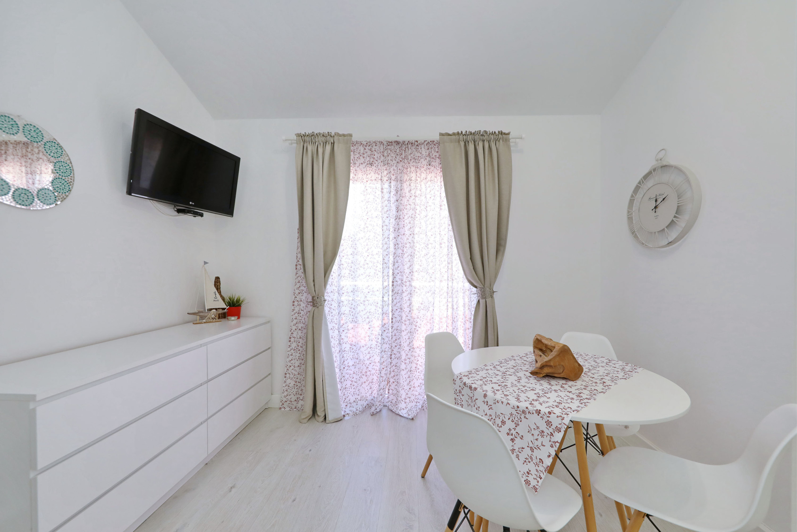 The kitchen has modern appliances and is fully equipped. The dining area is connected to the kitchen and is equipped with a table for four people. The living area is equipped with a flat screen TV with satellite programs and a sofa bed that can accommodate two people.