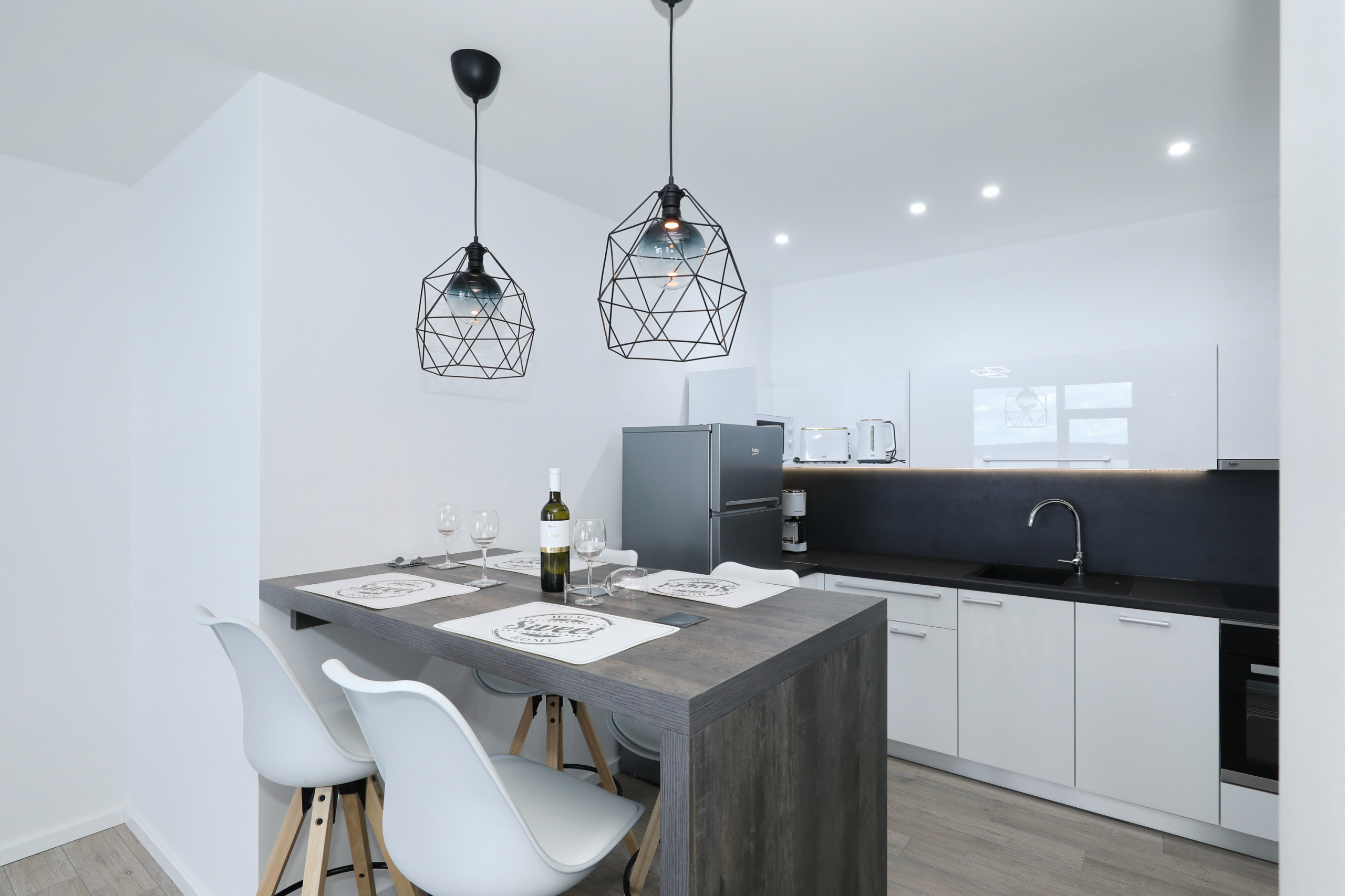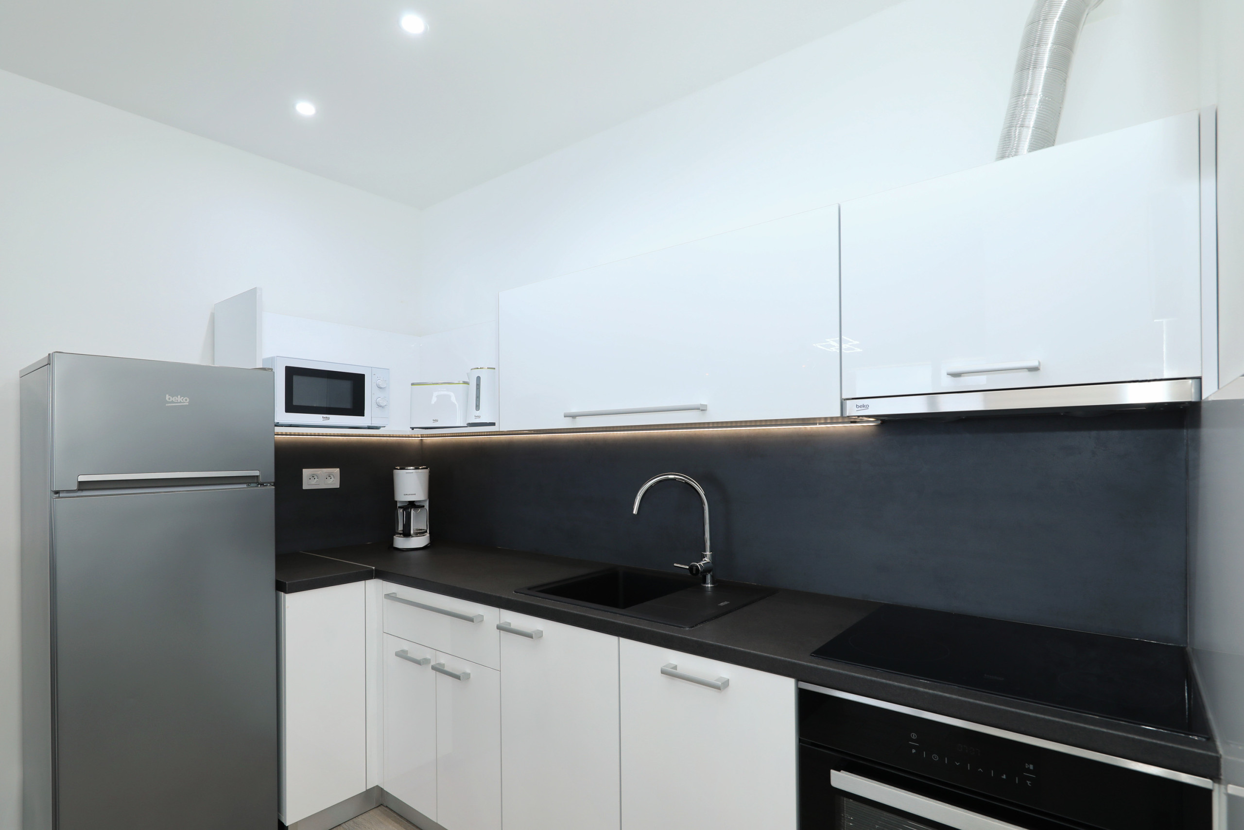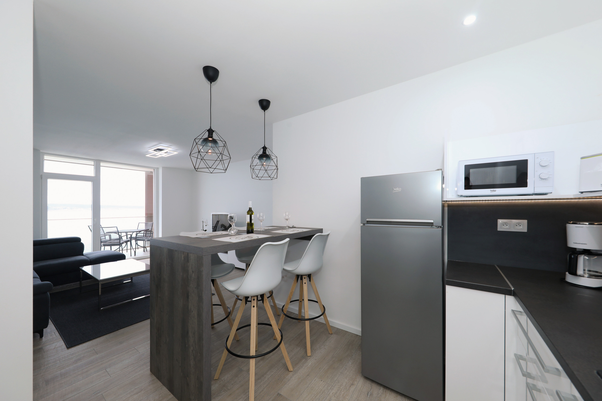 In the hotplate of glass ceramics open plan kitchen, refrigerator, microwave, oven, freezer, dishwasher, dishes/cutlery, kitchen utensils, coffee machine, toaster and kettle are provided.