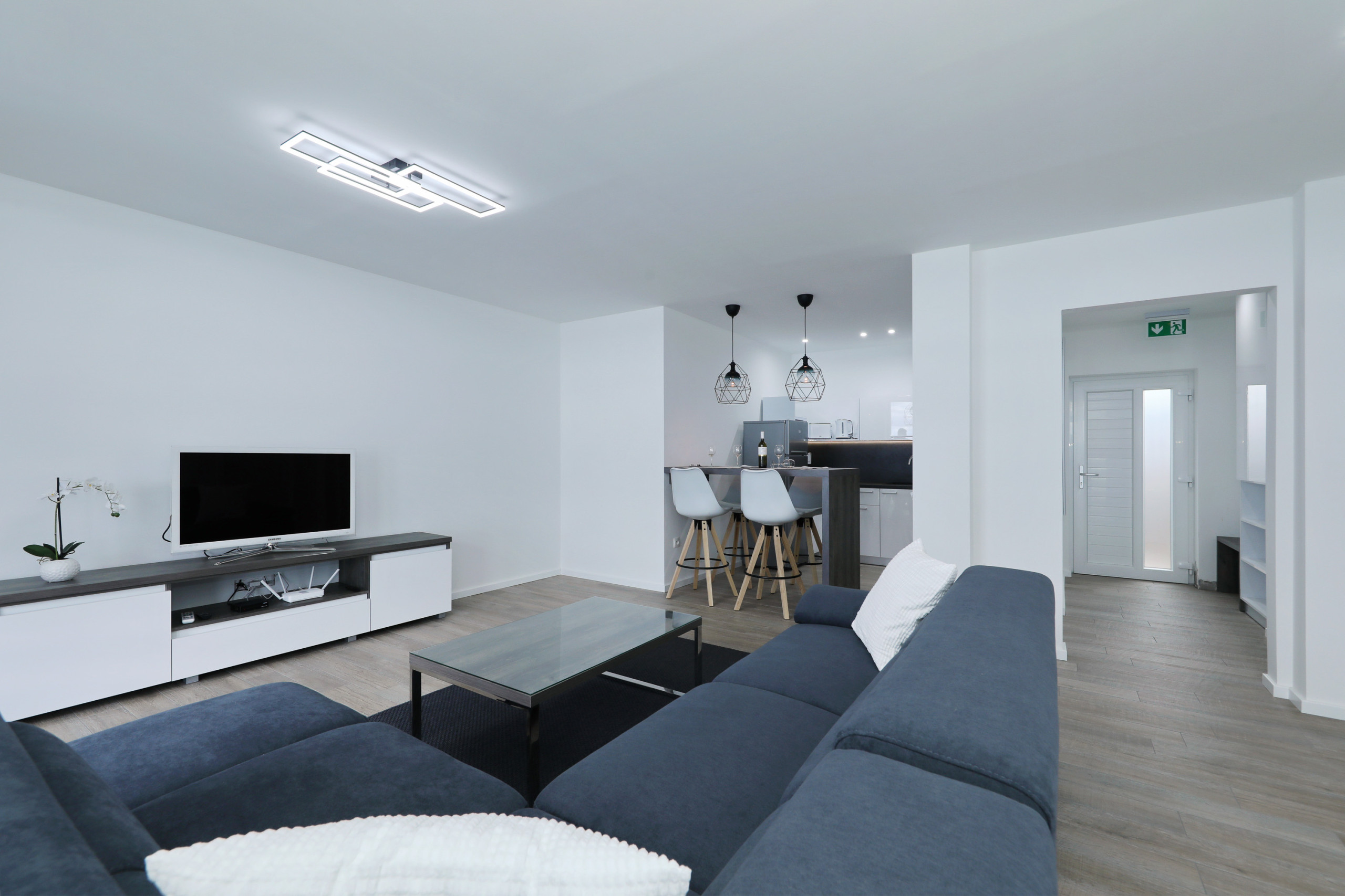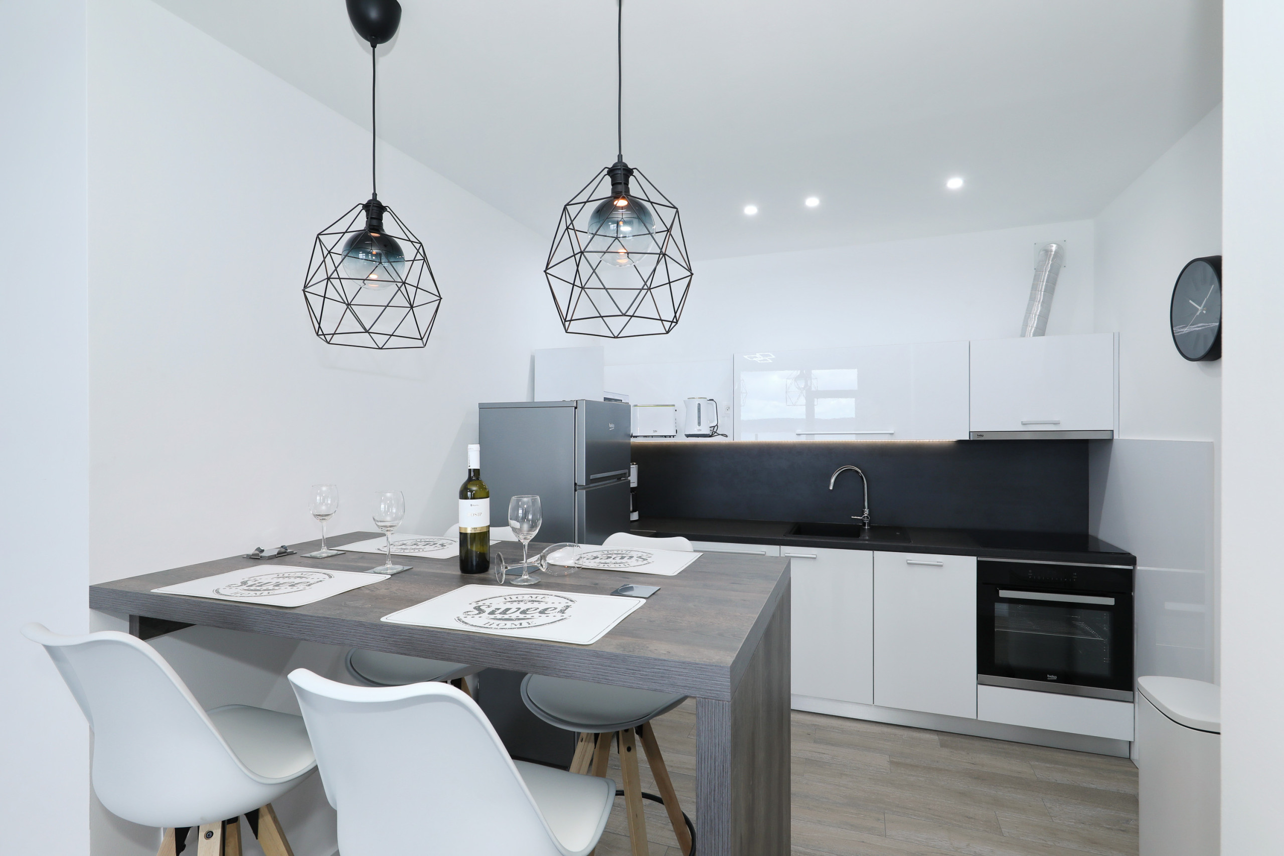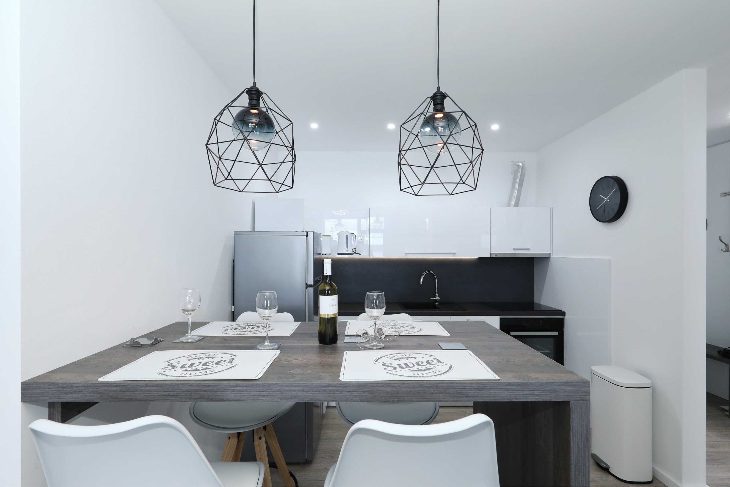 In the hotplate of glass ceramics open plan kitchen, refrigerator, microwave, oven, freezer, dishwasher, dishes/cutlery, kitchen utensils, coffee machine, toaster and kettle are provided.