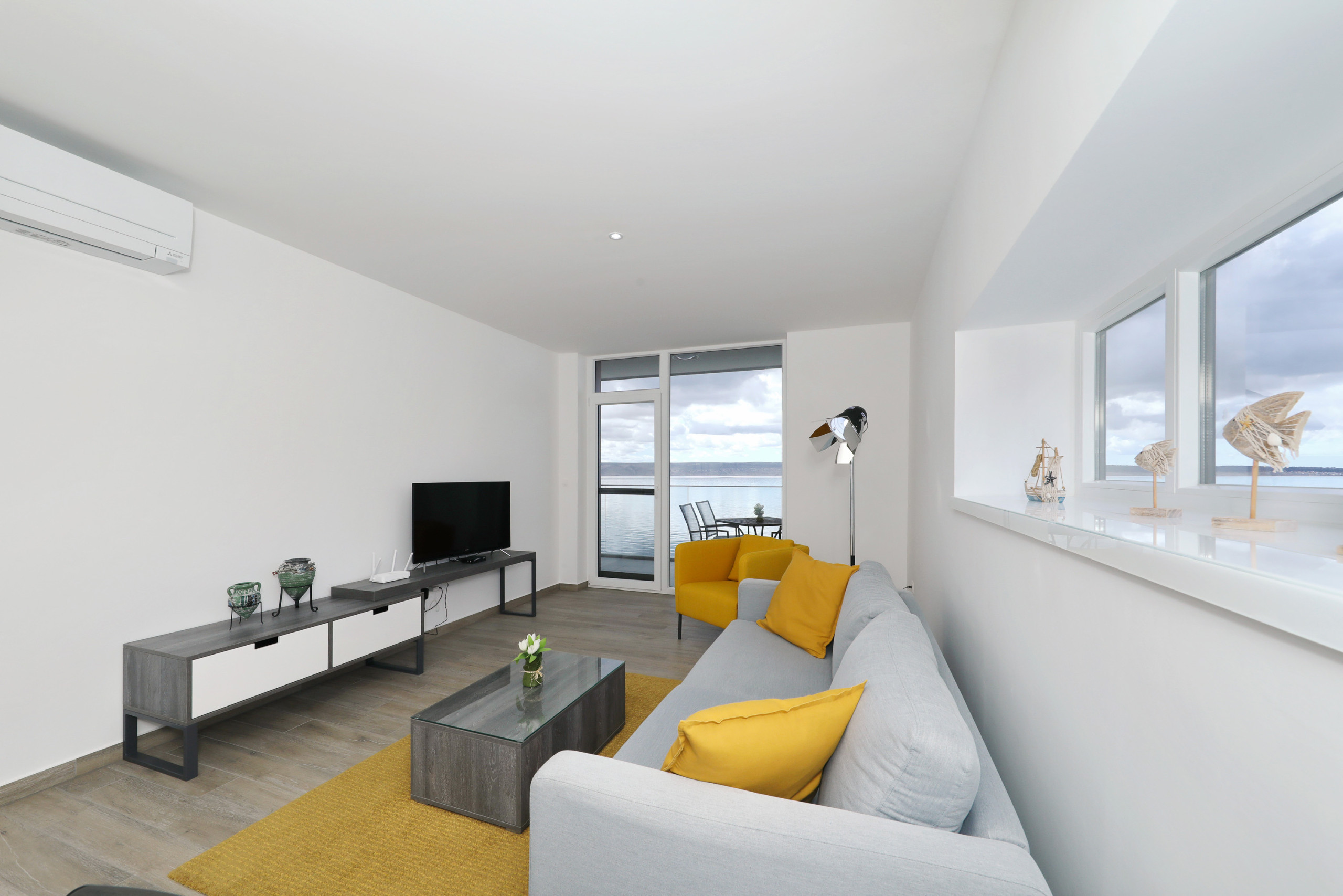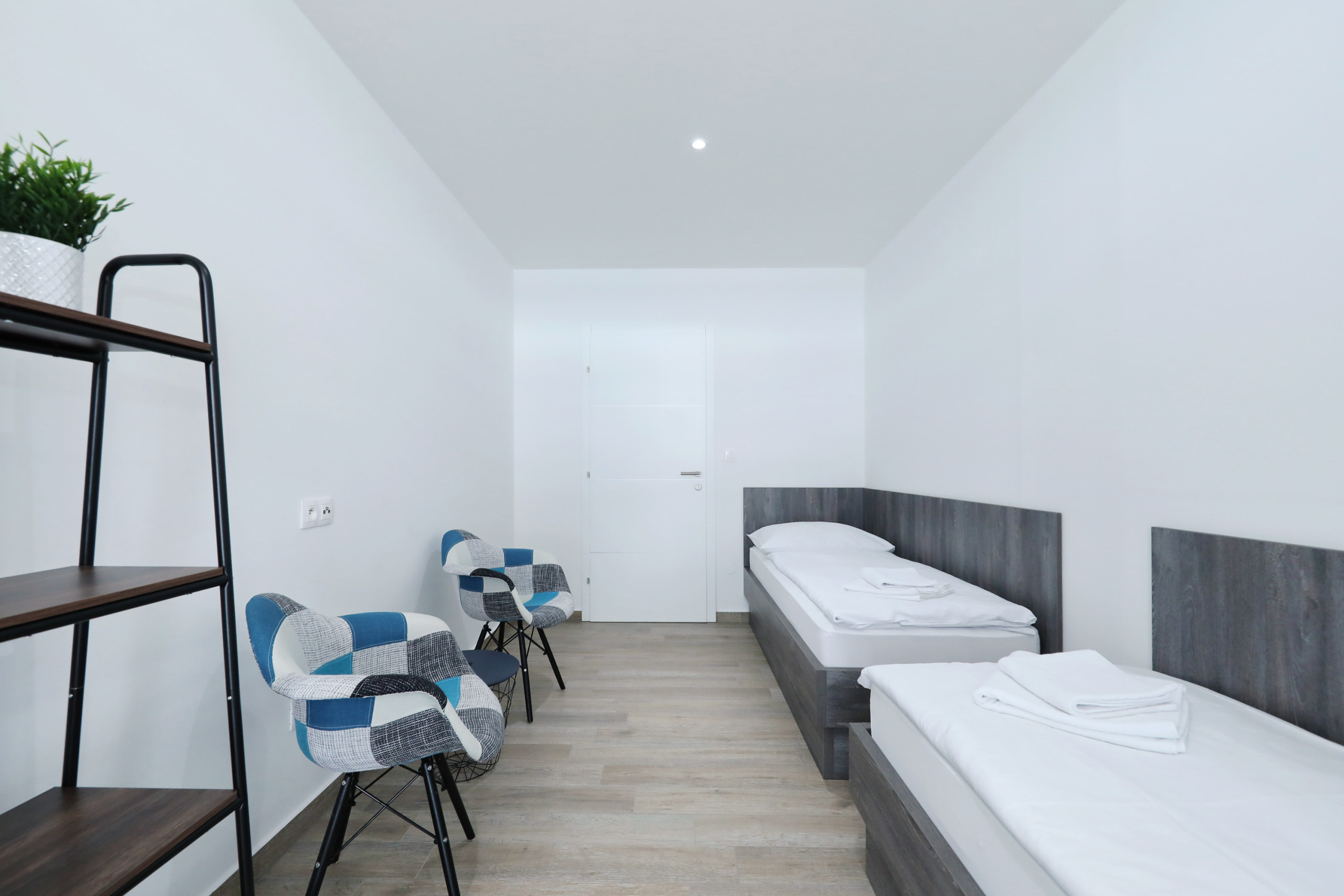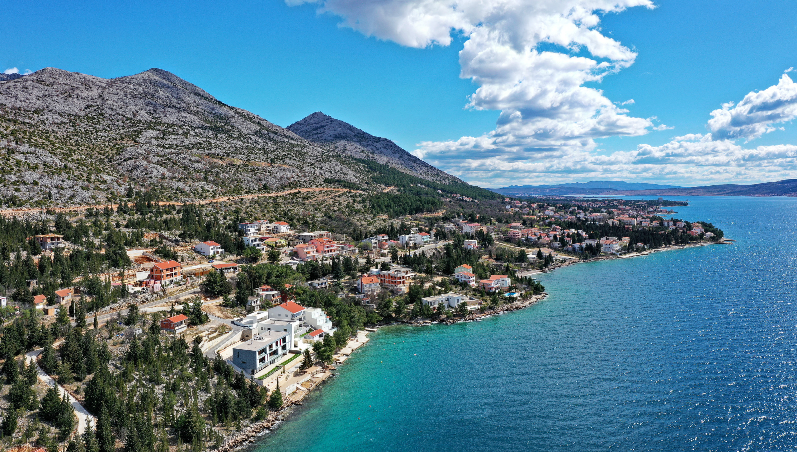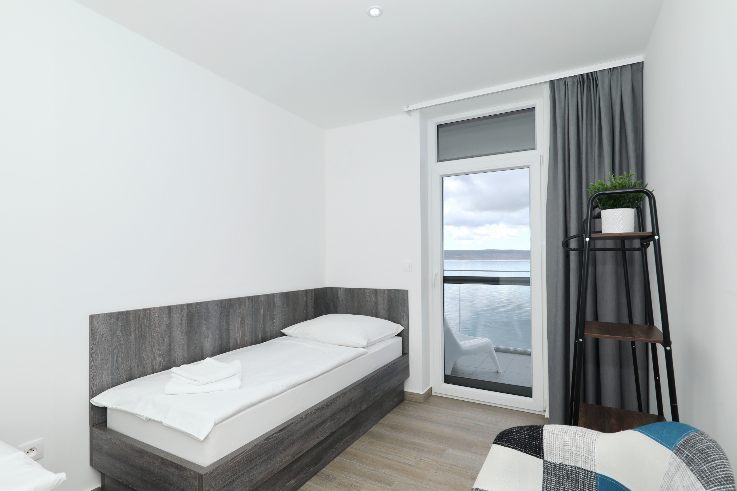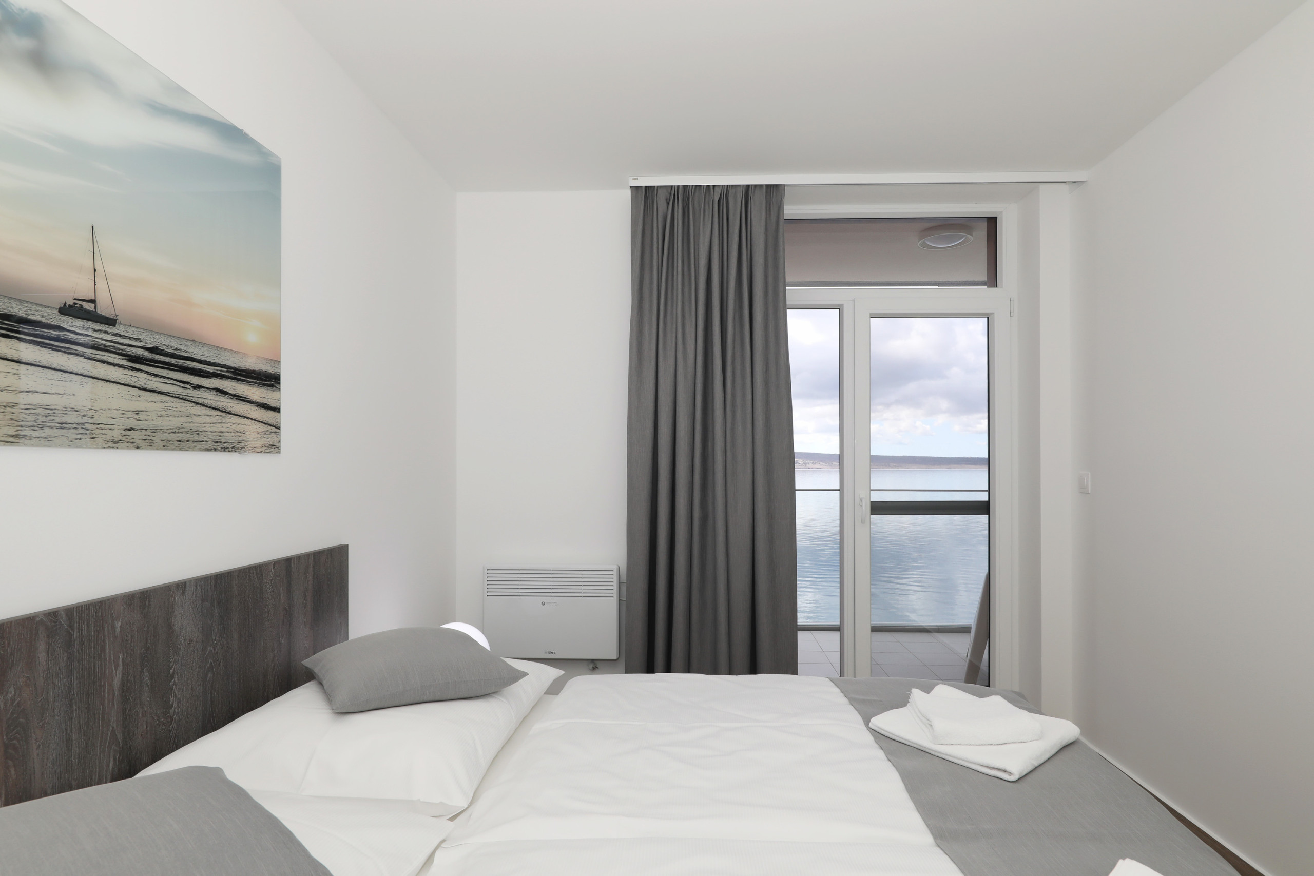Beautiful Seaview apartment with private beach No.5 is located in Starigrad Paklenica. Between Paklenica National park and the sea, it has a private beach just few meters in front. Private beach has deck chairs and umbrellas. With 67m2 total, apartment has a 16m2 terrace with sea view and deck chairs. It has a living room/dining room with fully equipped kitchen, family bedroom with queen bed and two single beds (two parts of one bedroom are separated), bathroom and WC. Free parking, Wi-fi and AC