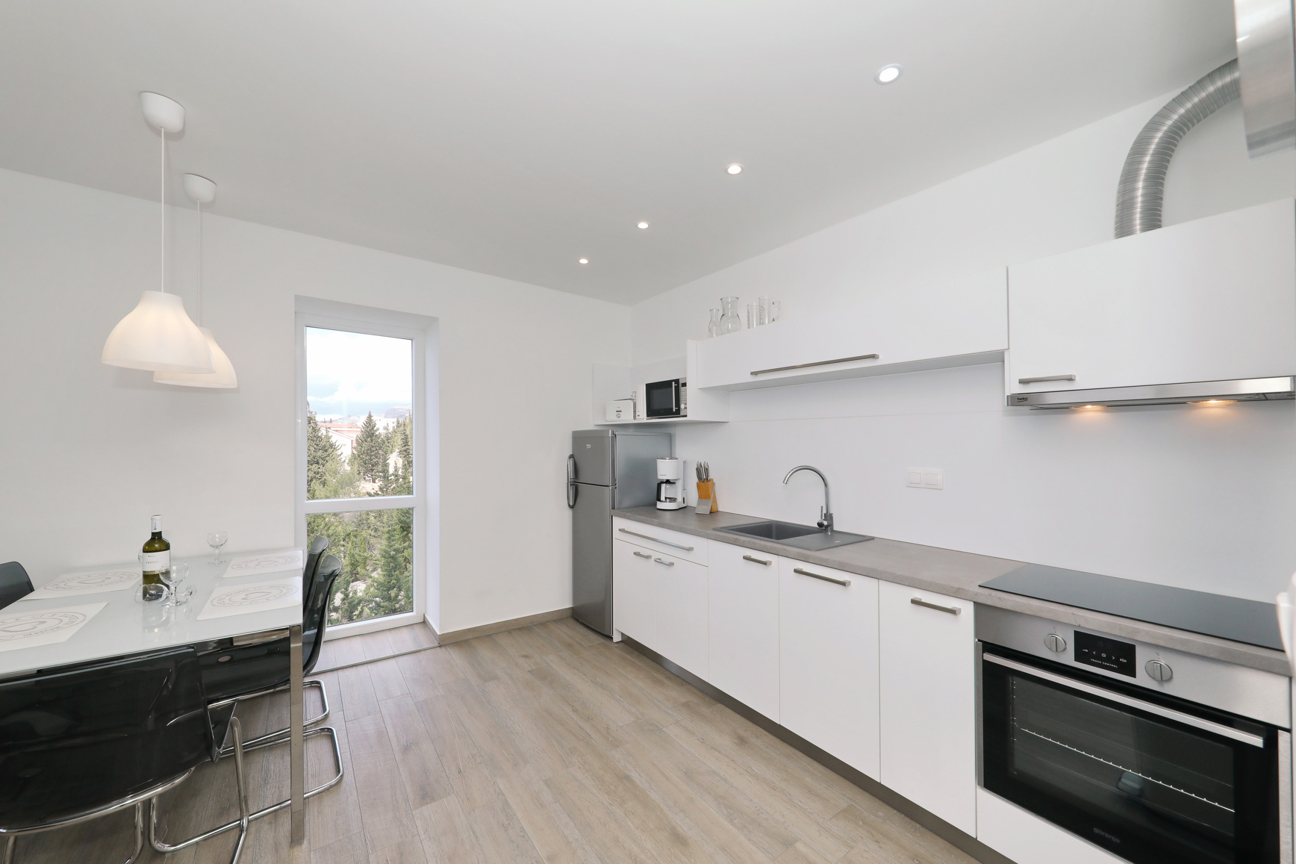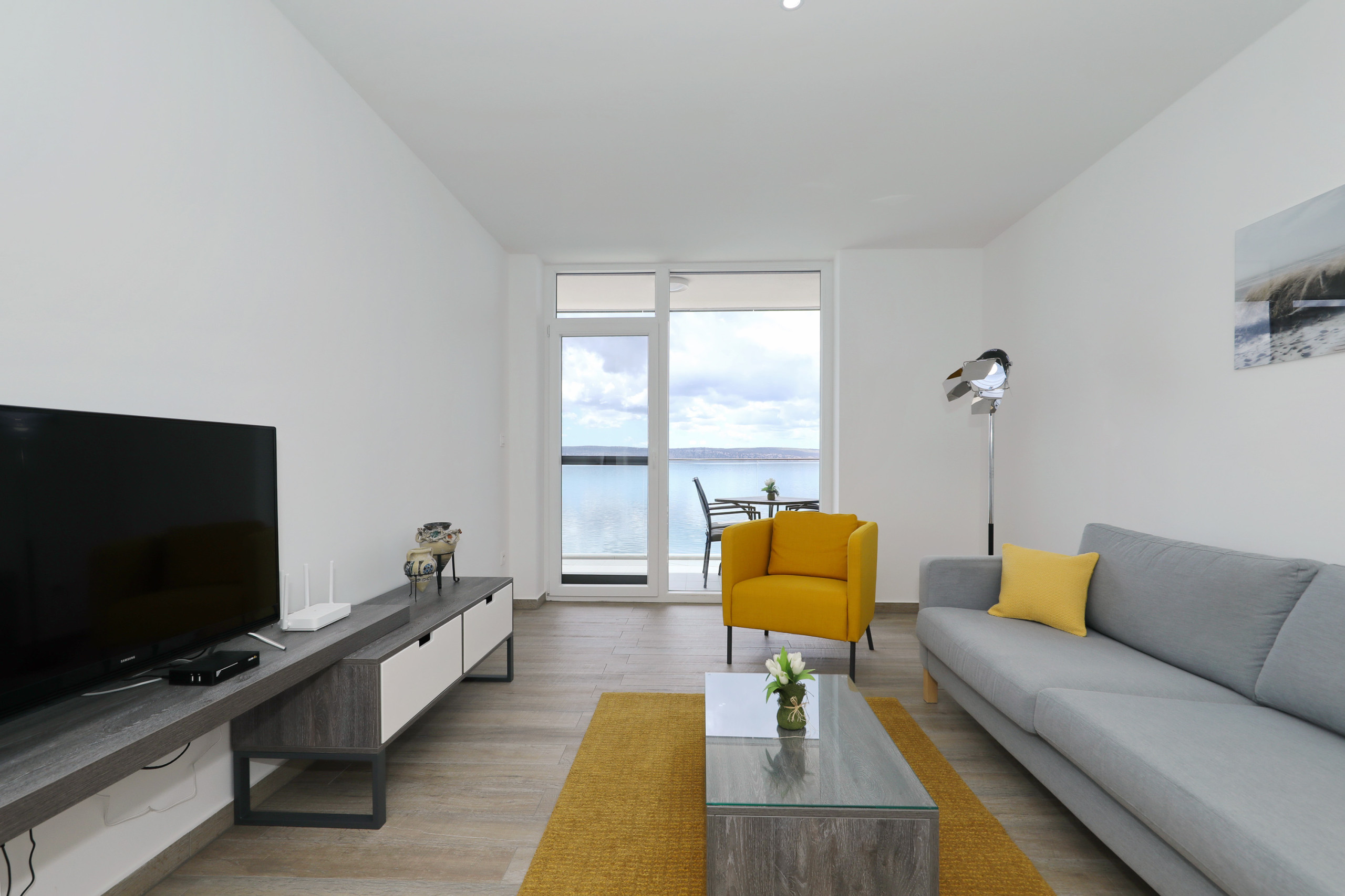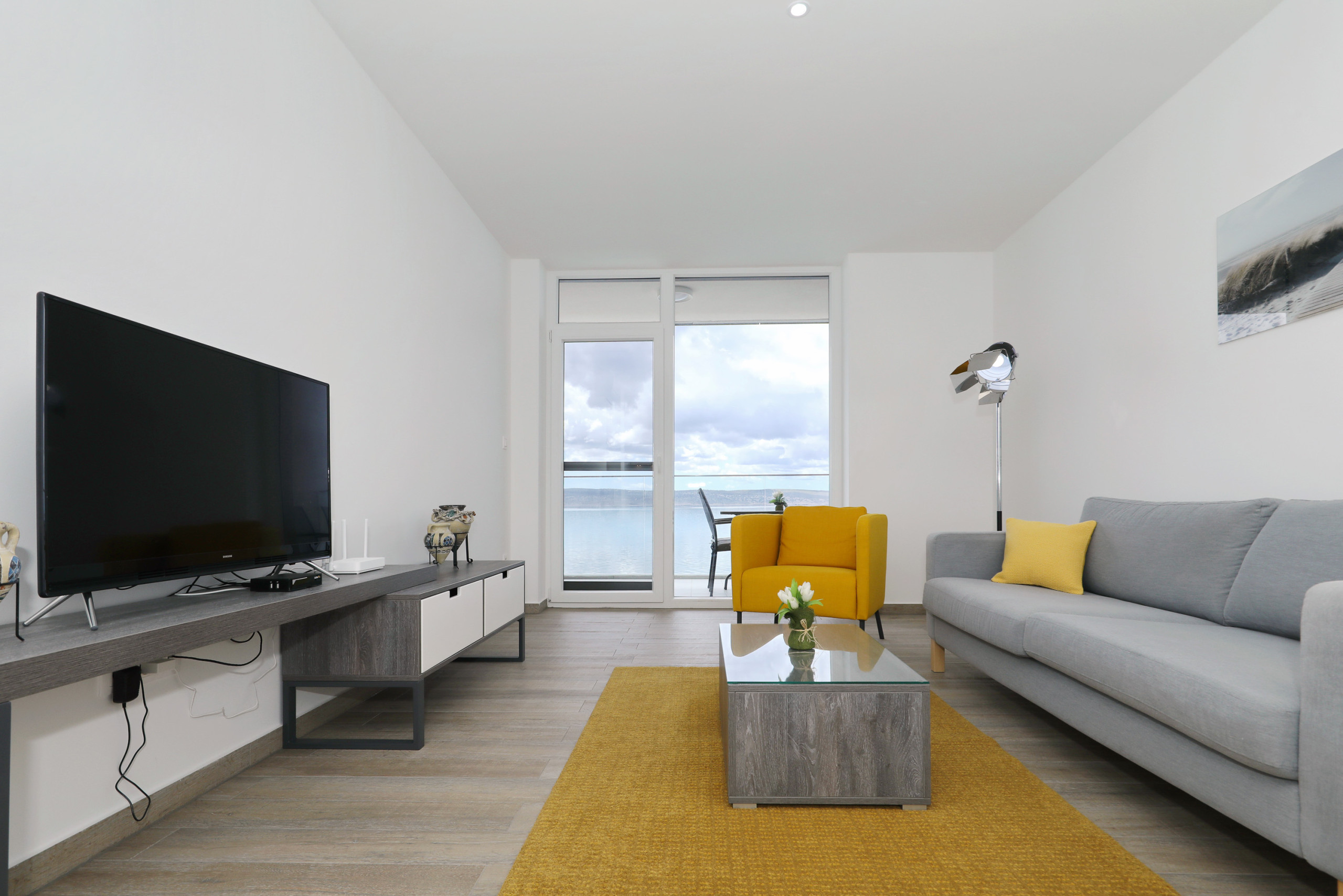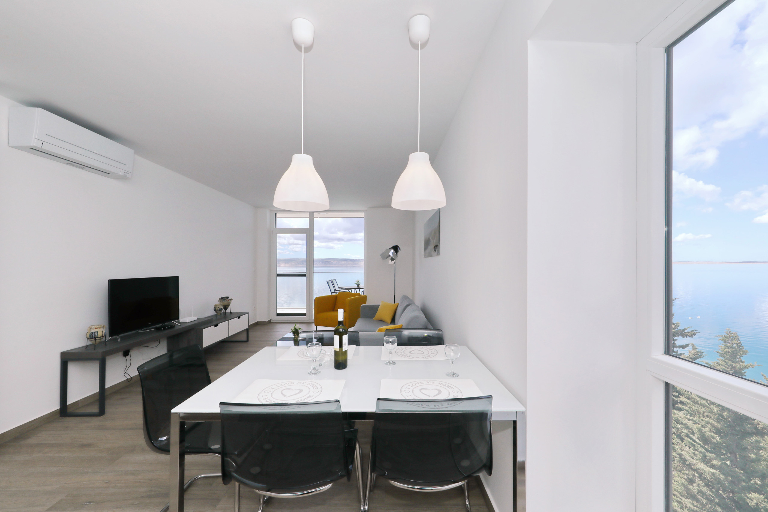 Apartment is located on the seaside, few meters from beach. Mountain is behind the house. Just 1,5km from center.