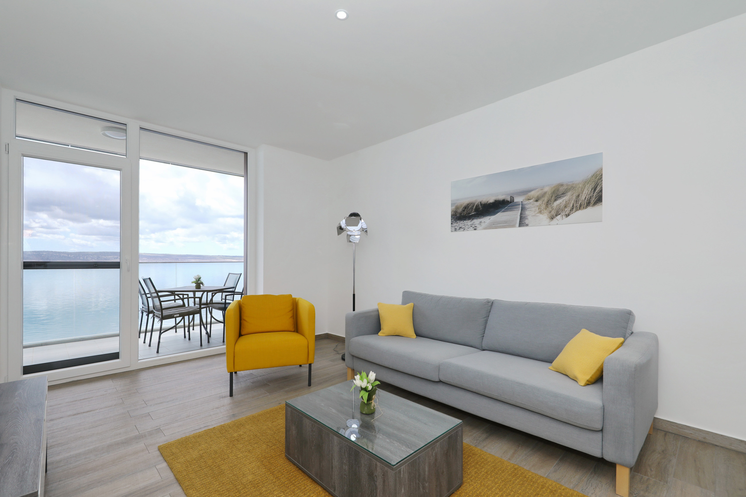 Private beach offers an oasis away from city crowd, and the terrace will make your morning coffee or afternoon drink a most special one. Modern design with large sofa in the living room.