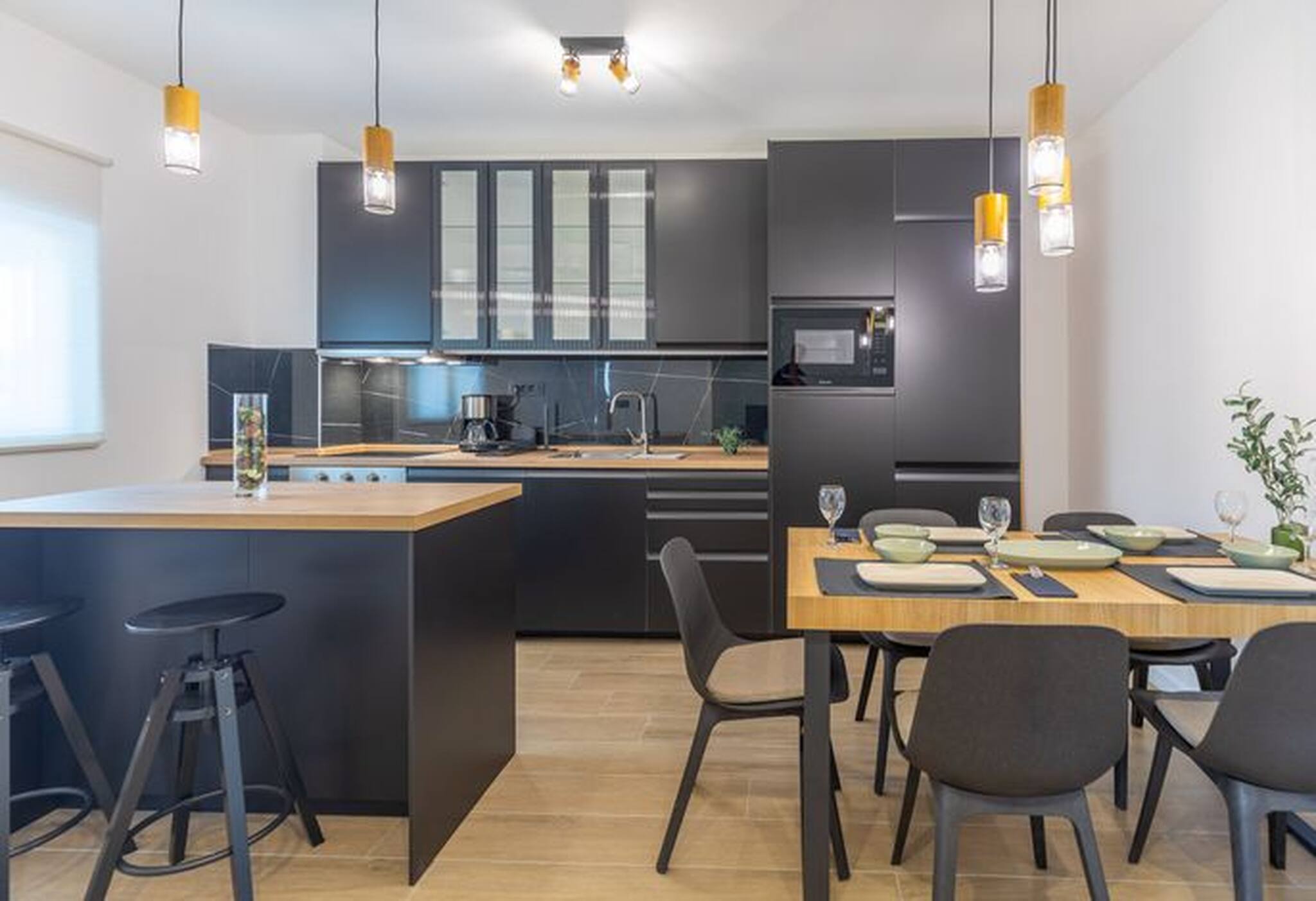 the kitchen, refrigerator, microwave, oven, freezer, dishwasher, kitchen utensils and coffee machine are provided.