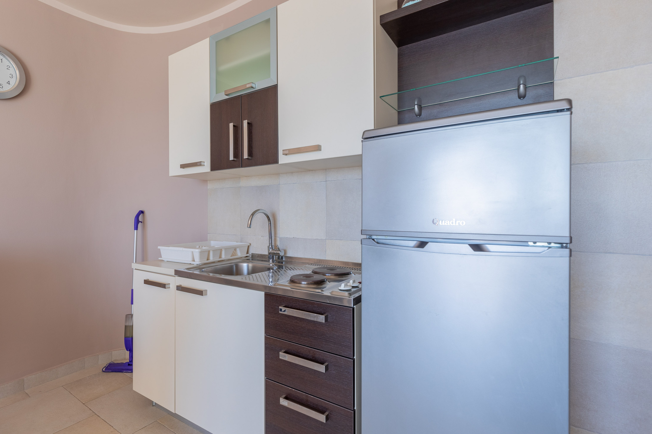 The apartment consist of a combined living and dining area with a kitchenette, a bathroom and a bedroom. The kitchenette is equipped with cutlery and has two circuits for cooking, while the living and the dining area are equipped with a flat screen TV with satellite programs.
