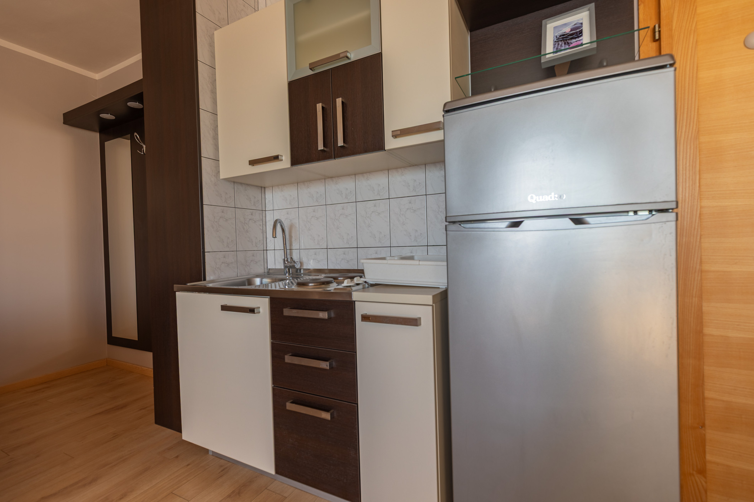 The kitchenette is equipped with cutlery and has two circuits for cooking, while the living and the dining area are equipped with a flat screen TV with satellite programs. The bedroom is equipped with queen-sized bed and has access to a furnished balcony.