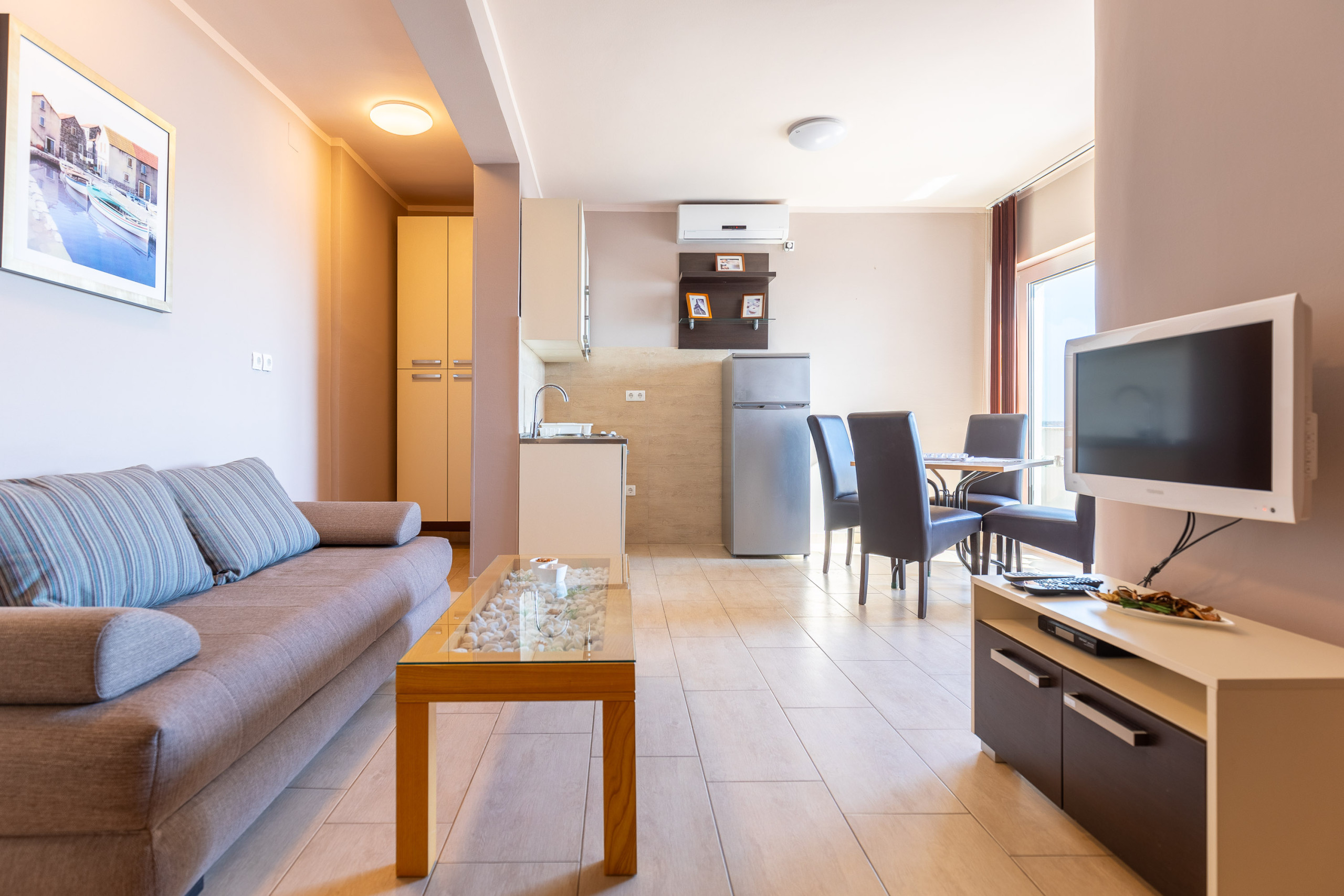 The kitchenette is equipped with cutlery and has two circuits for cooking, while the living and the dining area are equipped with a flat screen TV with satellite programs. The bedroom is equipped with queen-sized bed and has access to a furnished balcony.