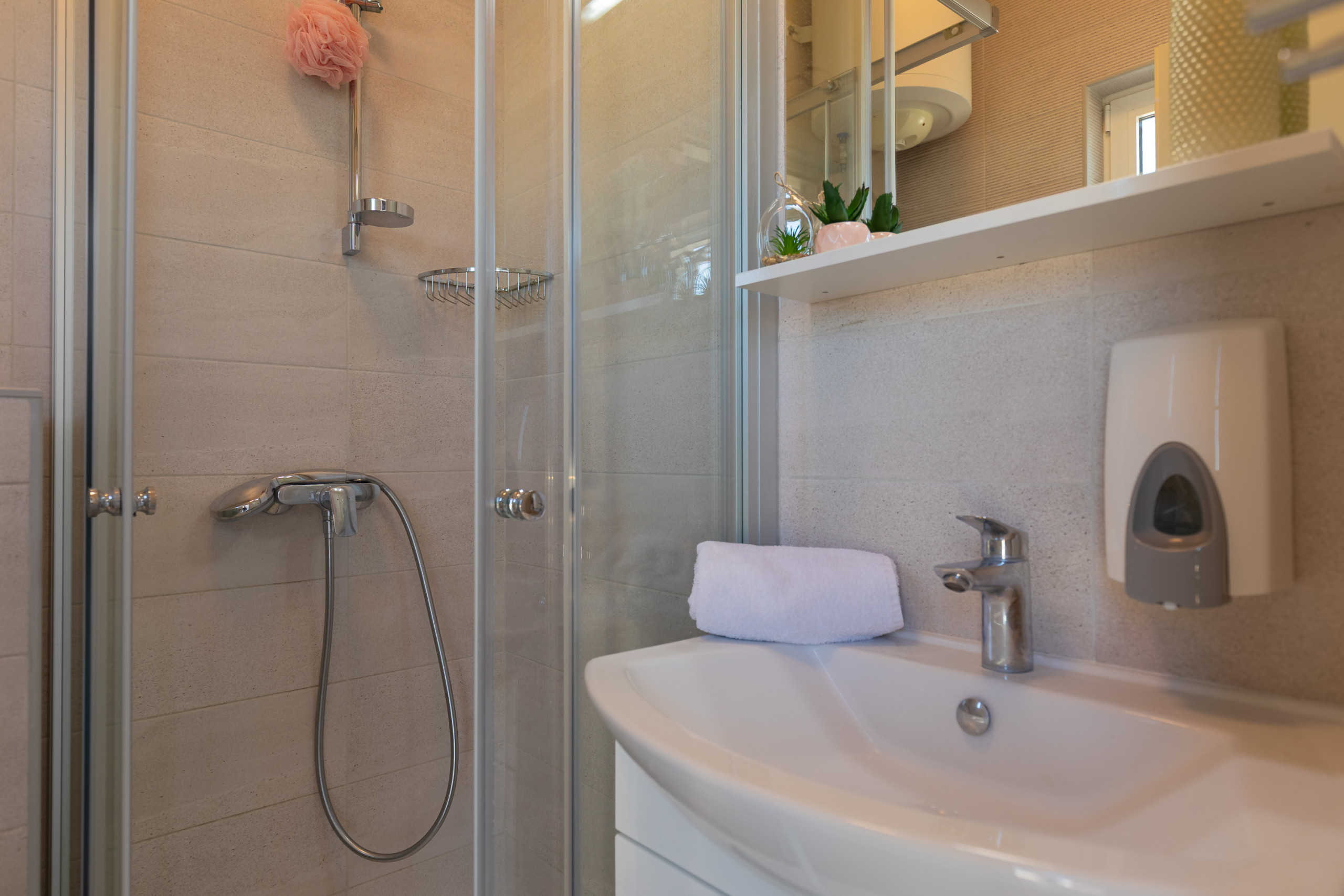 Our modernly designed apartment is located in a 4 star villa on the beach/seafront of island Vir. It features a 75 square meter infinity pool with a whirlpool corner and a gorgeous view of the sea, the bay and the surrounding islands..