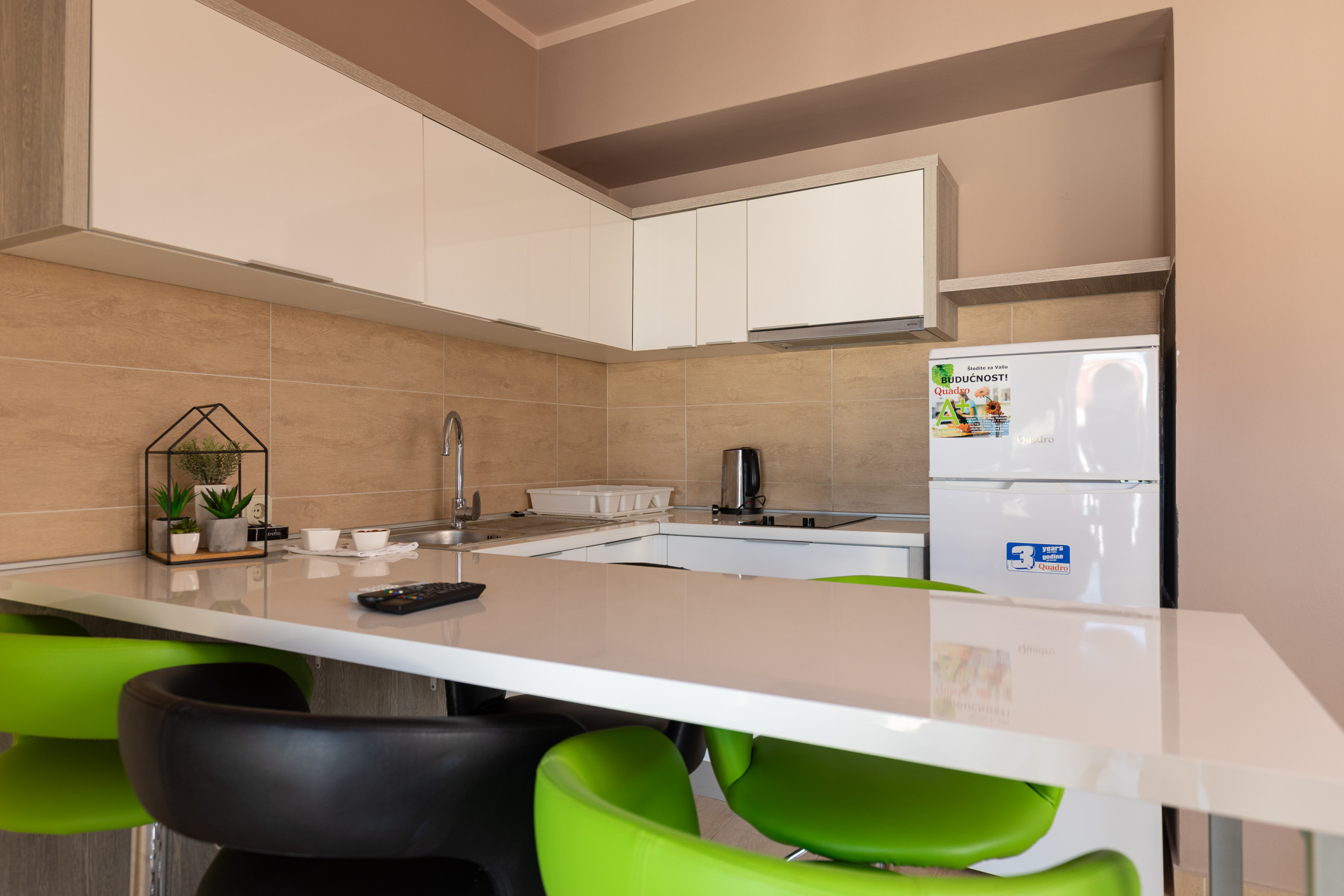 The kitchenette is equipped with cutlery and has two circuits for cooking, while the living and the dining area are equipped with a flat screen TV with satellite programs. Both bedrooms are equipped with queen-sized beds and have access to a furnished balcony.