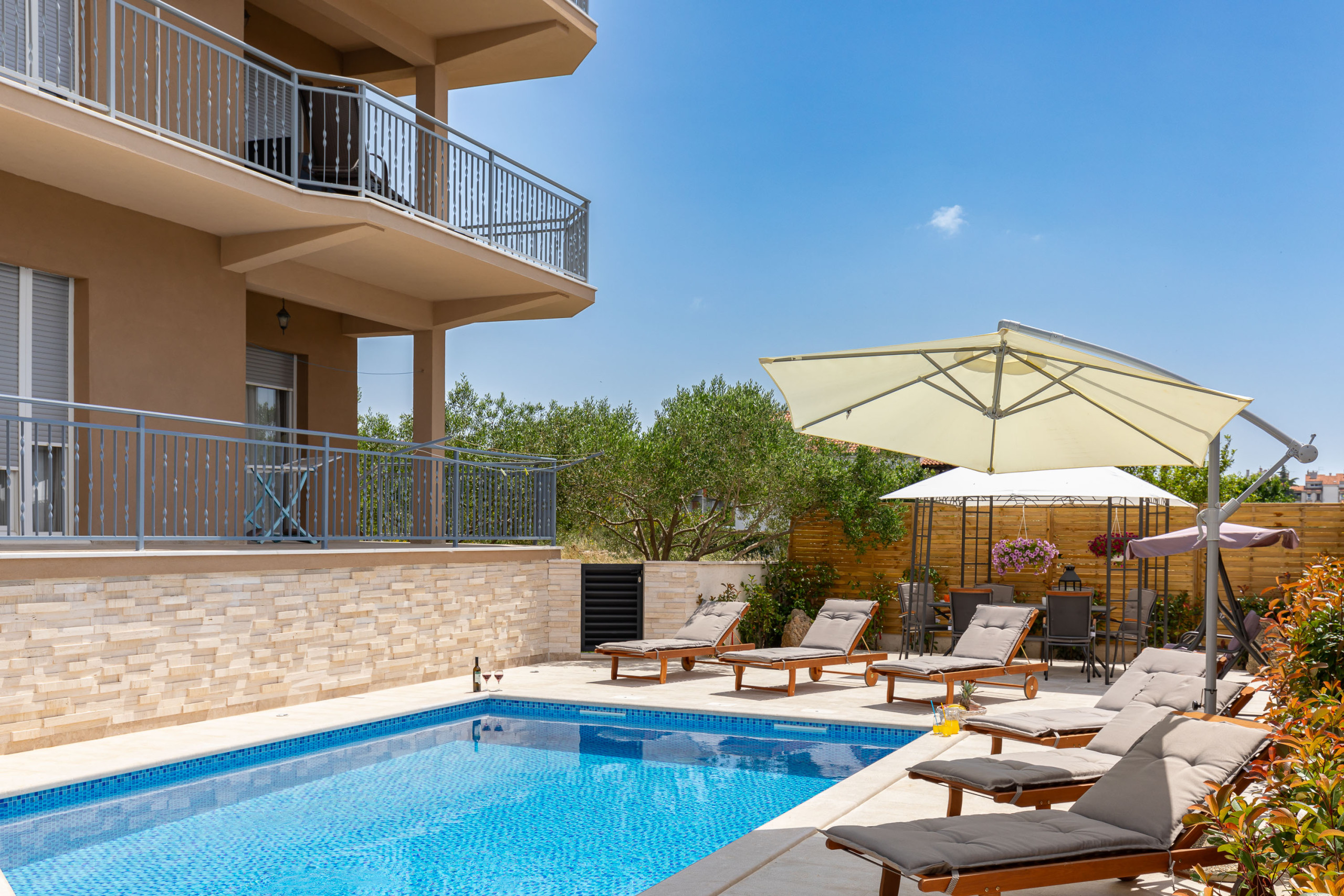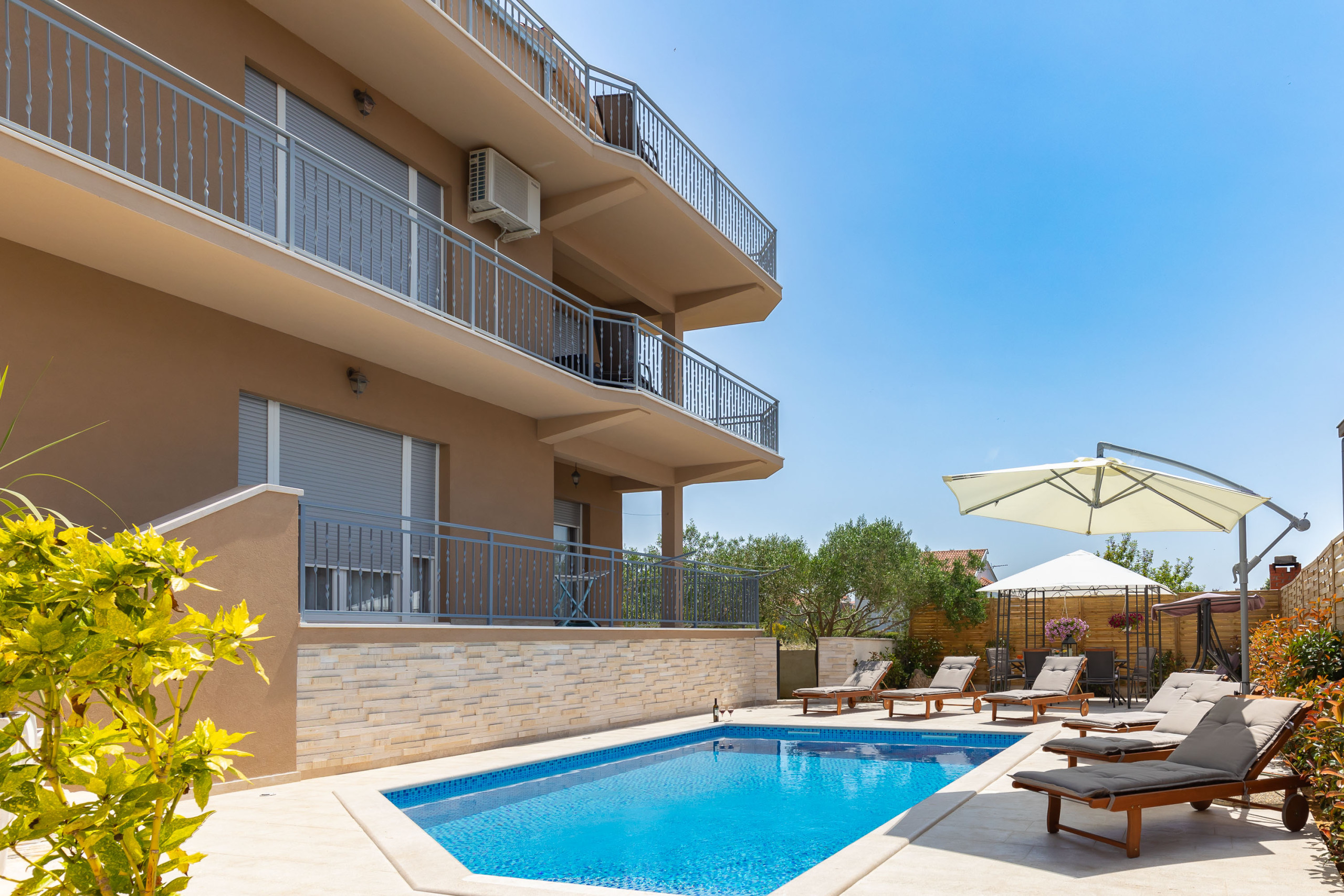 Modern holiday apartment in Zadar with 2 bedrooms, balcony, Wi-Fi, A/C & free parking. Beach 1.4 km, old town 1.7 km. Perfect for families, couples & active guests. No pets allowed.