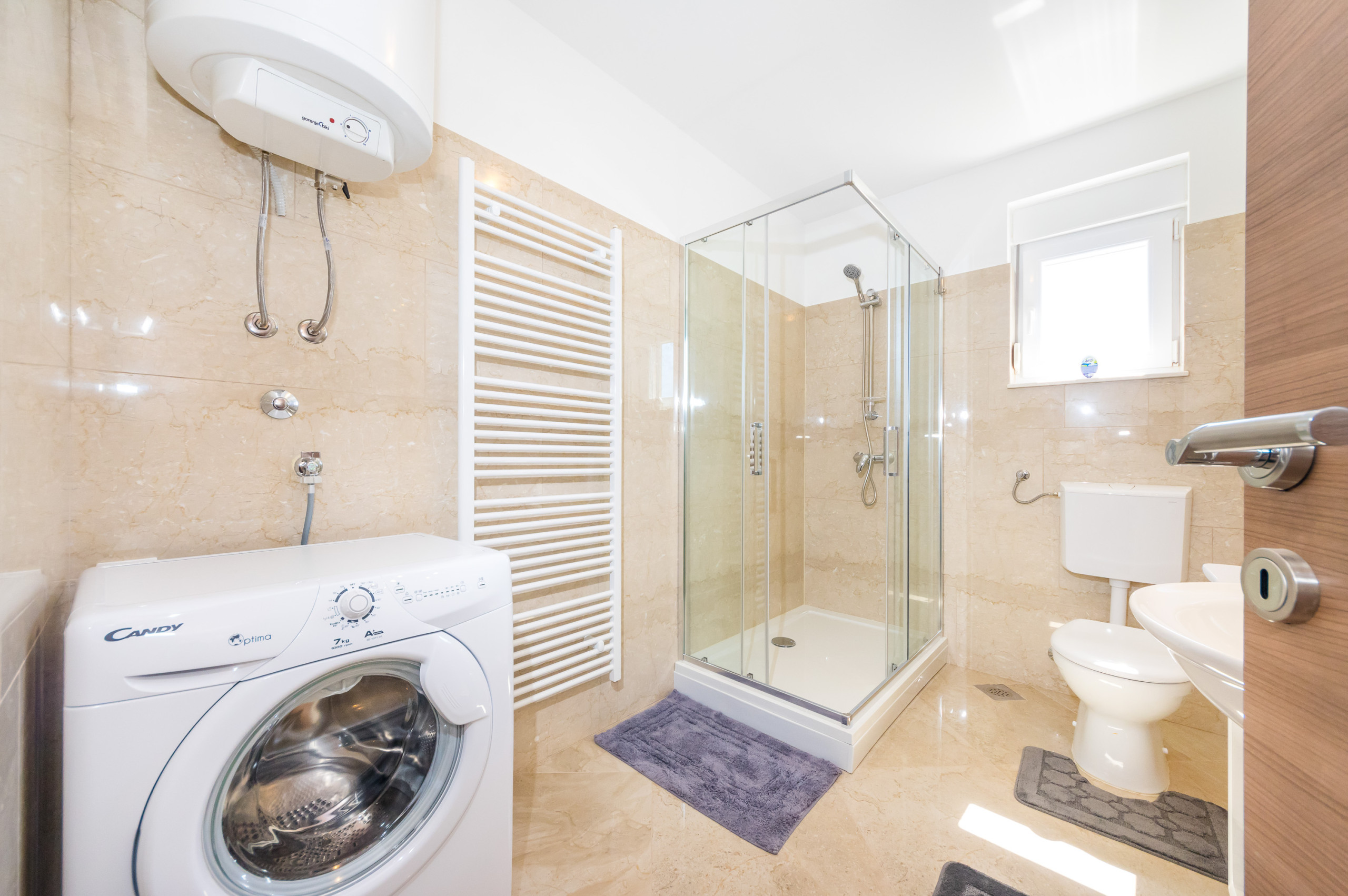 There is also a bathroom with a washing machine.
