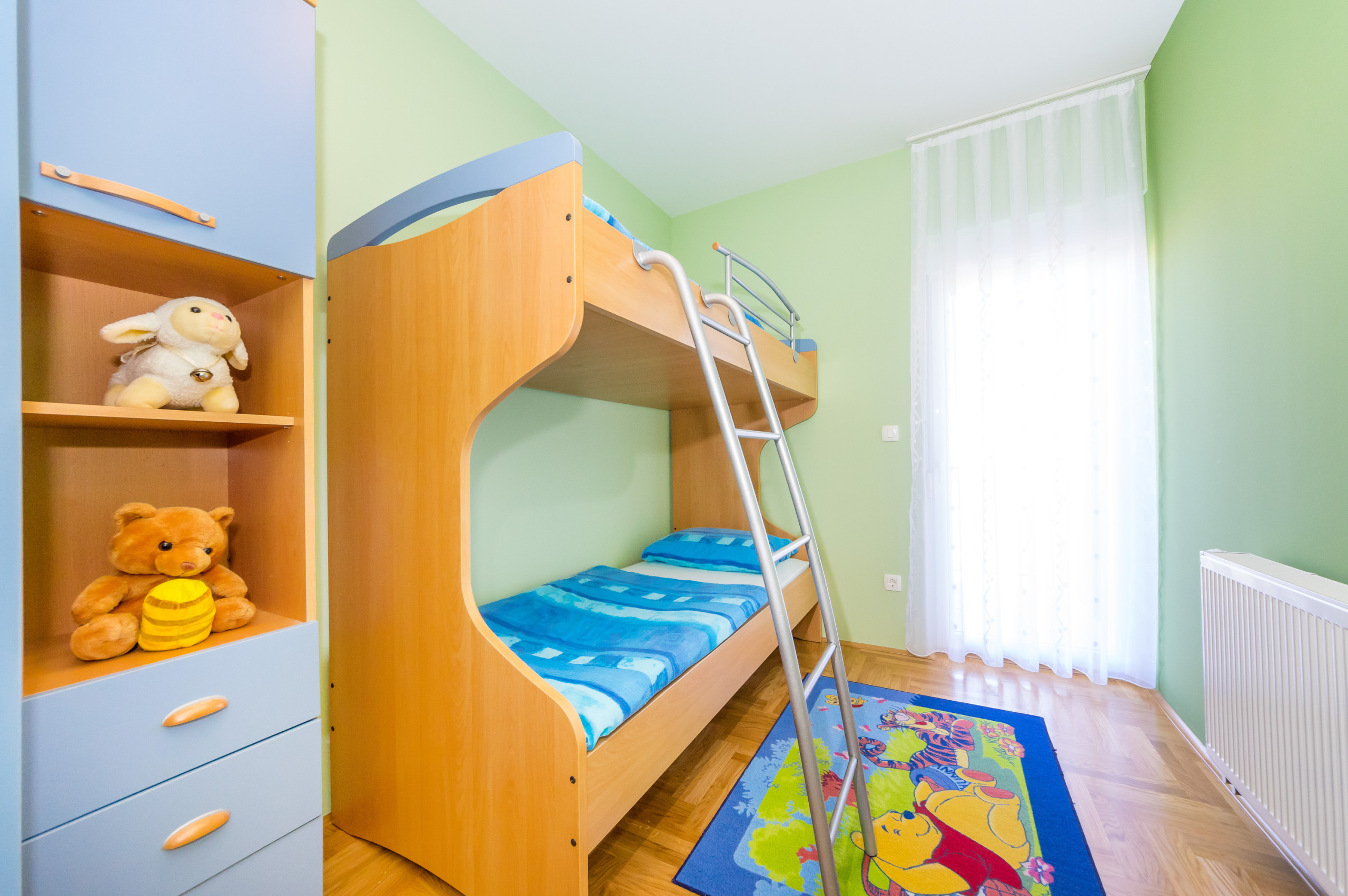 The apartment has 3 bedrooms. The first and the second bedroom are equipped with queen sized beds and a built in wardrobe. The third bedroom has a bunk bed.
