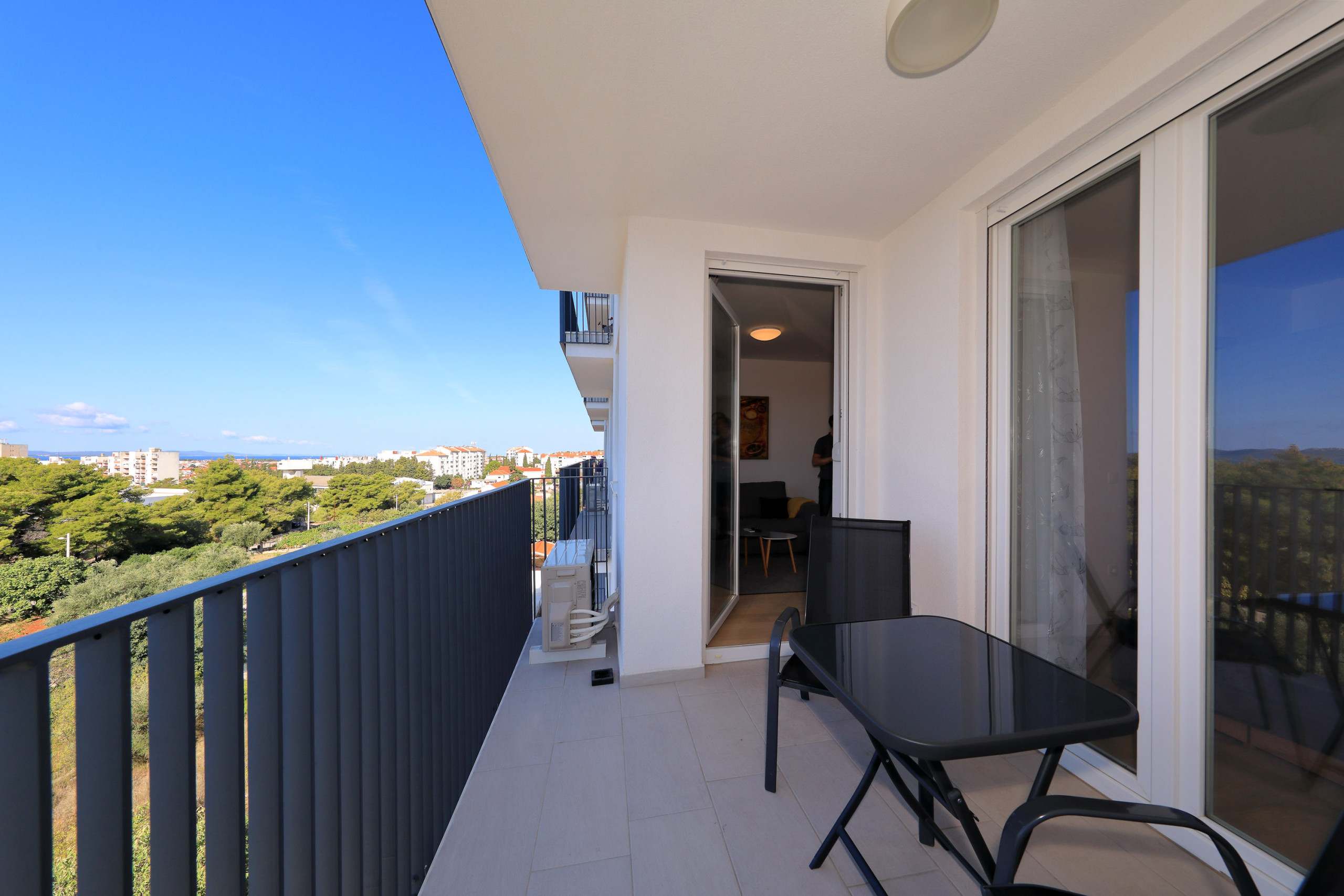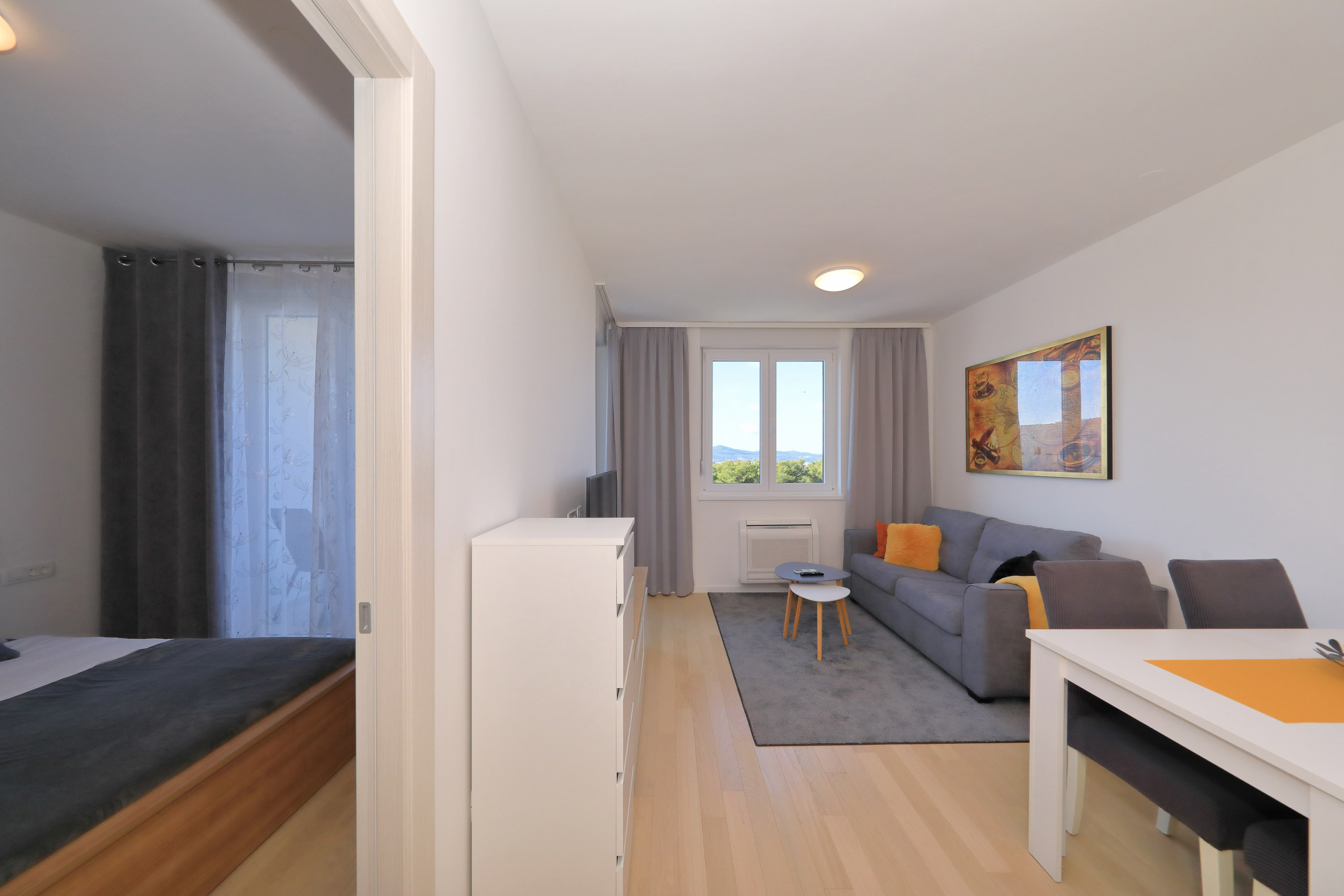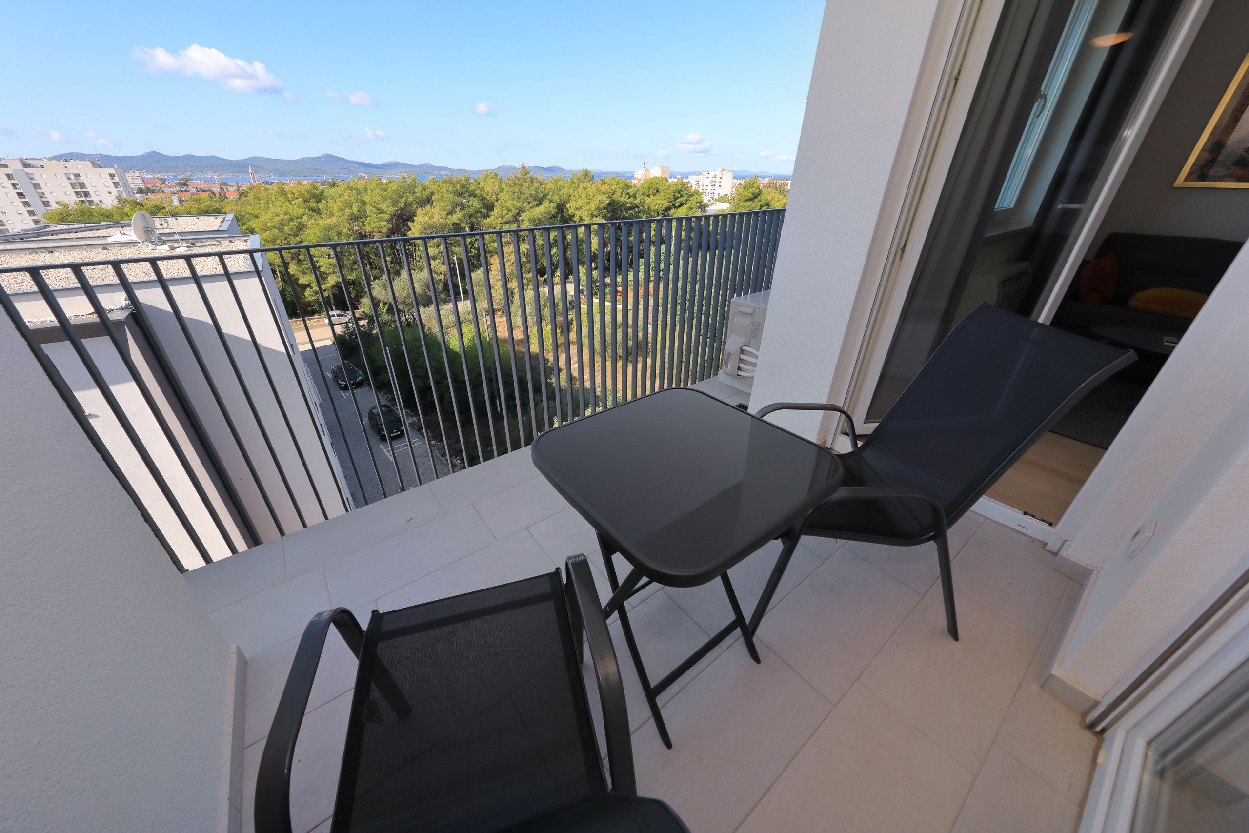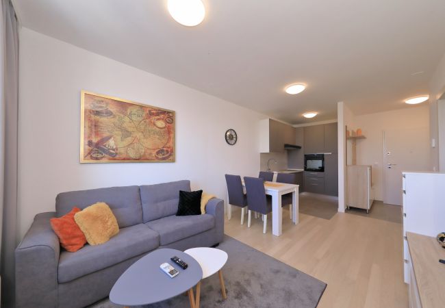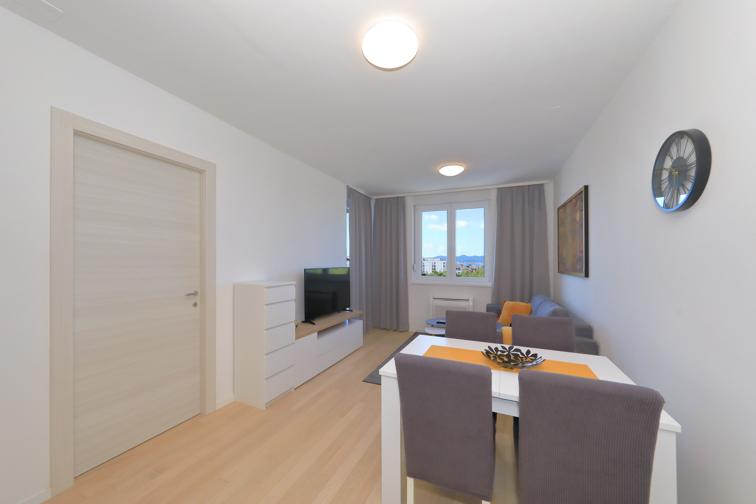 Modern apartment in Zadar for 4 guests with balcony, A/C, Smart TV, kitchen & free Wi-Fi. Beach 1.4 km, city center 1.8 km. Supermarket & restaurant nearby. Parking & washing machine included.