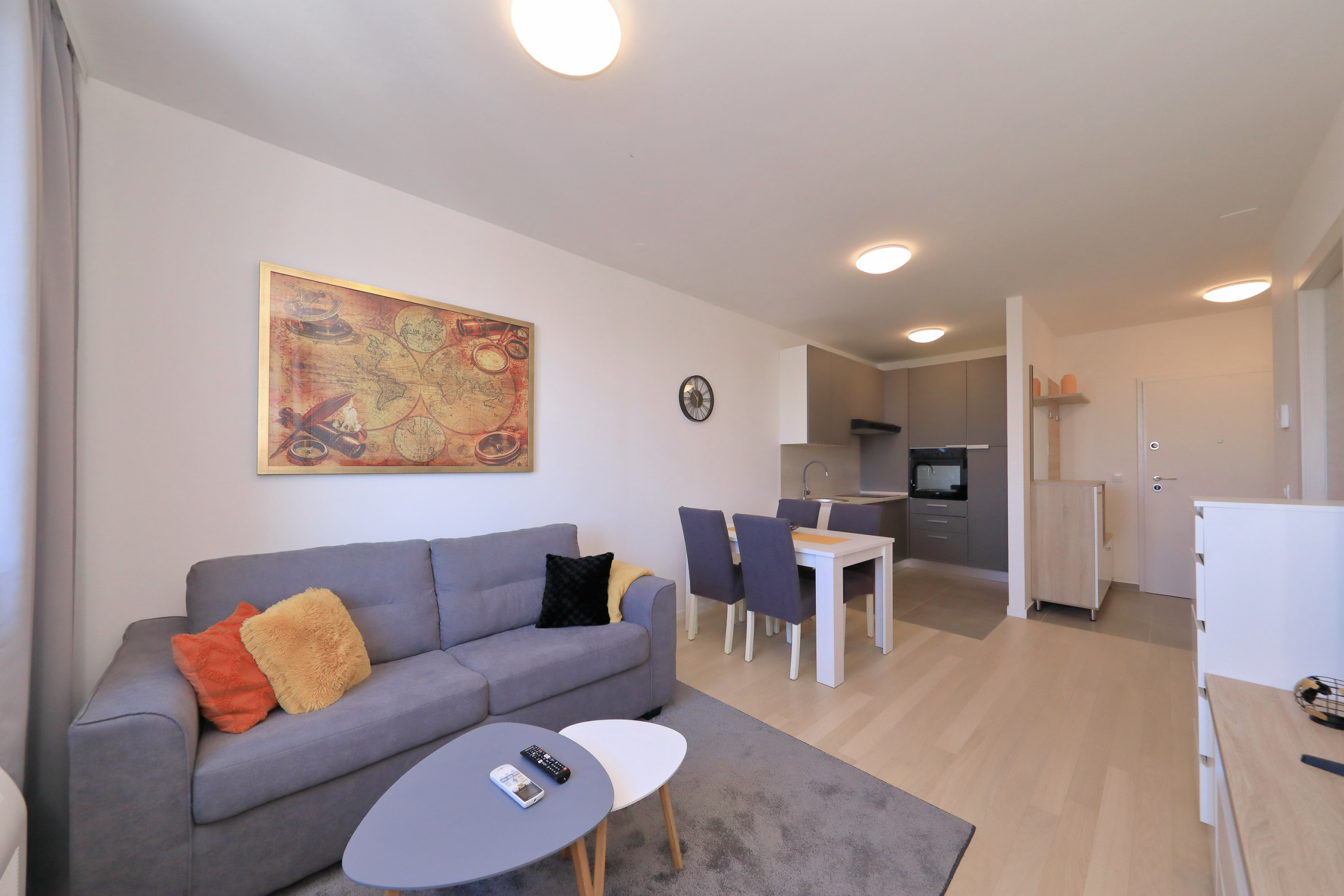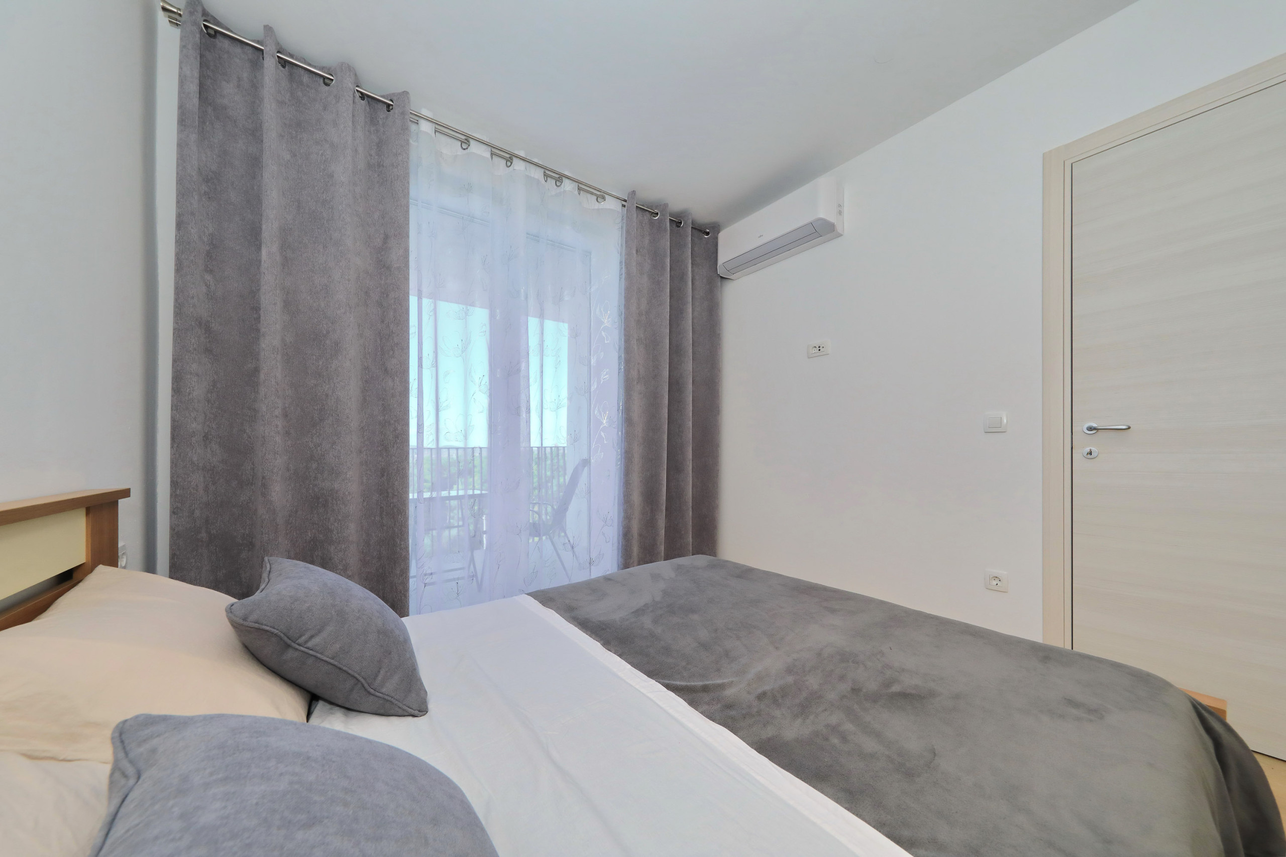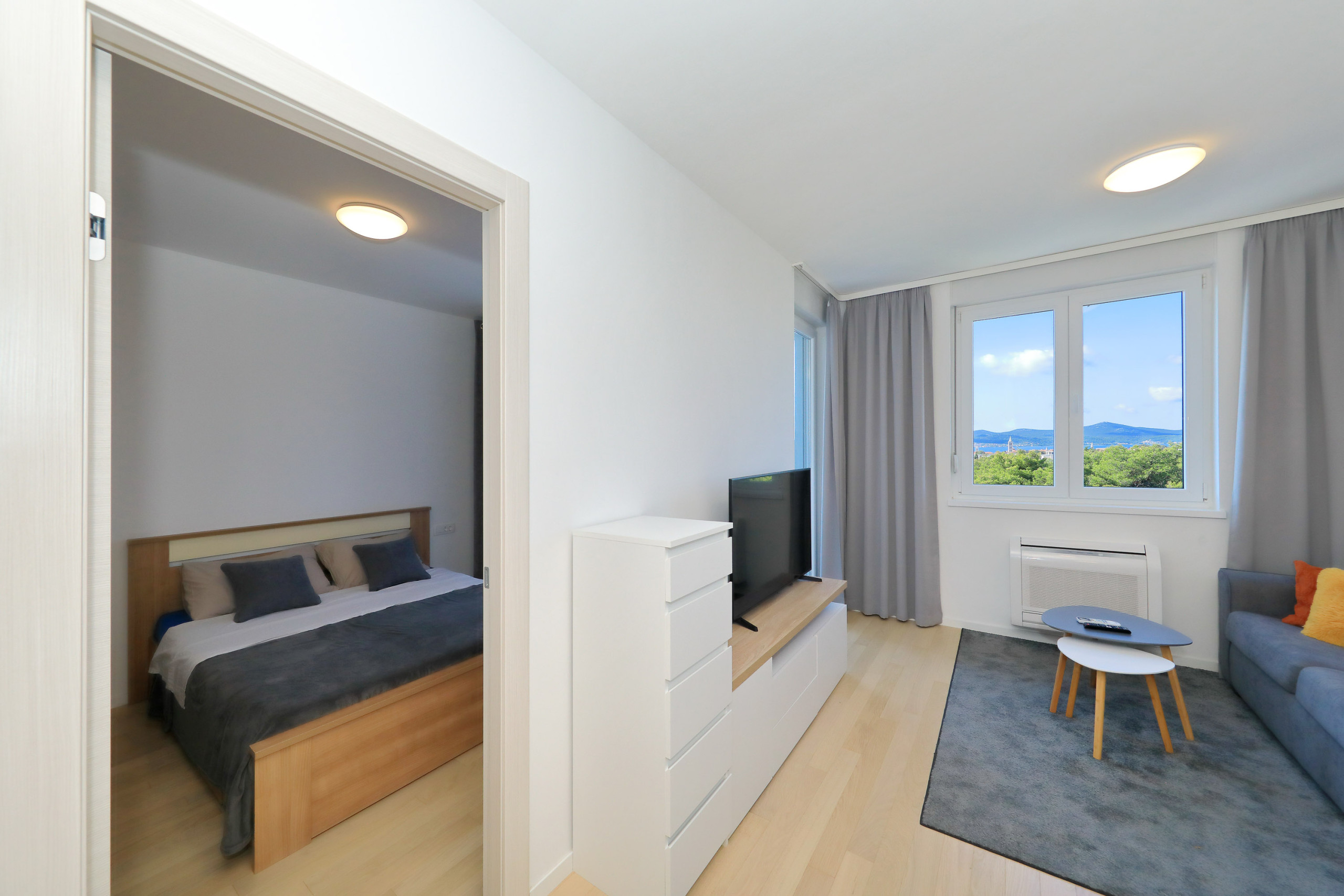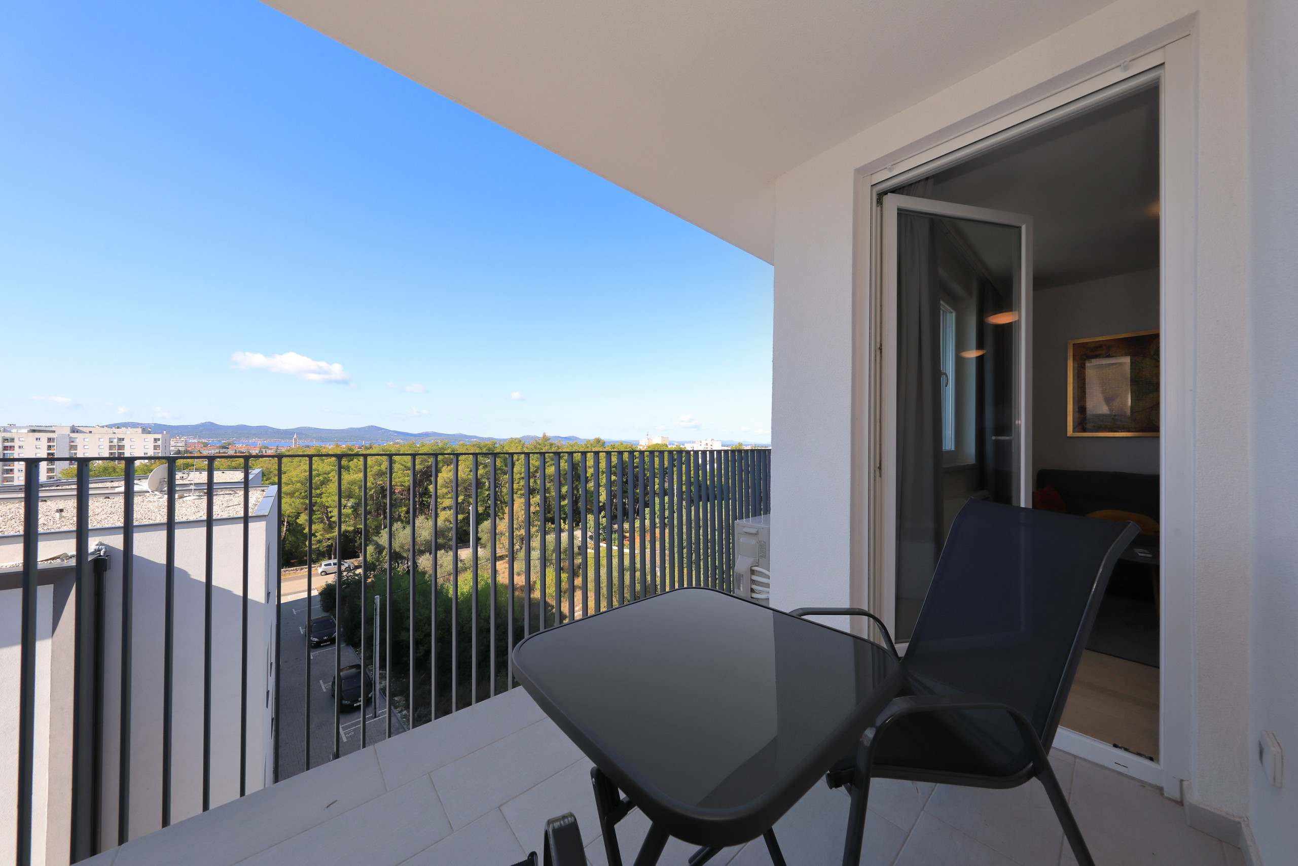 Modern apartment in Zadar for 4 guests with balcony, A/C, Smart TV, kitchen & free Wi-Fi. Beach 1.4 km, city center 1.8 km. Supermarket & restaurant nearby. Parking & washing machine included.