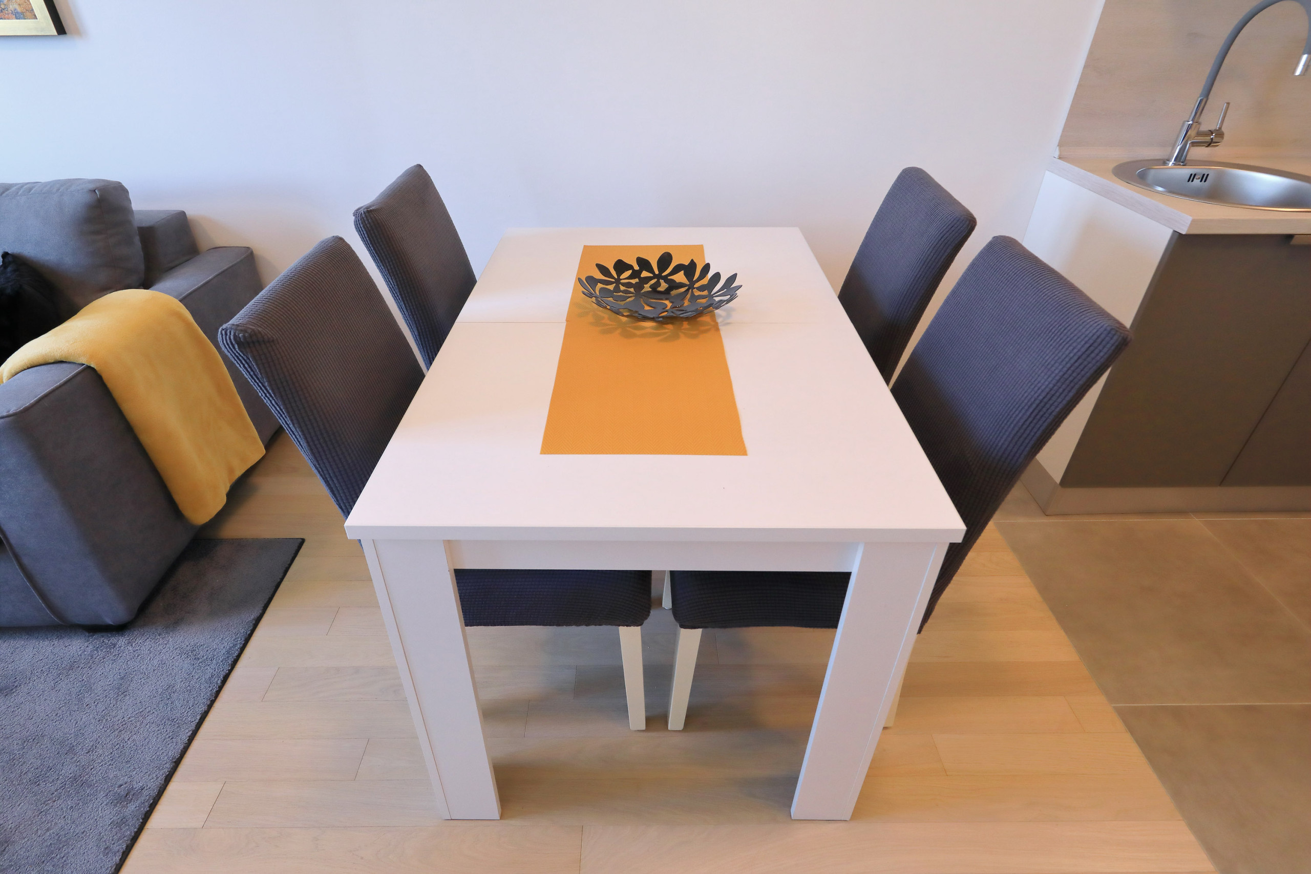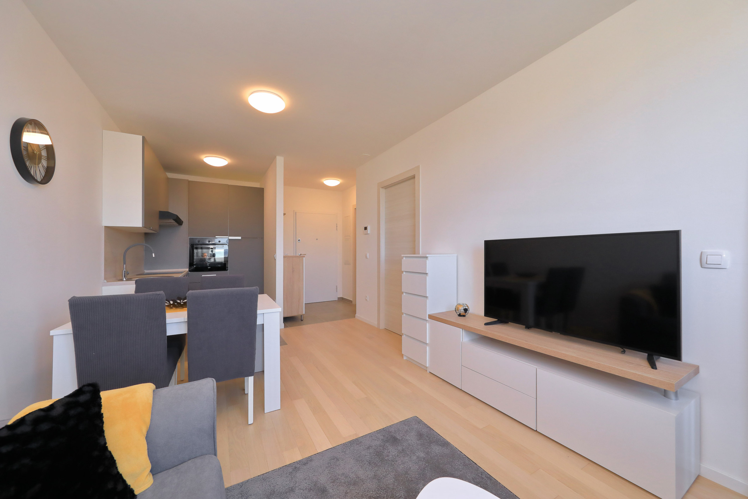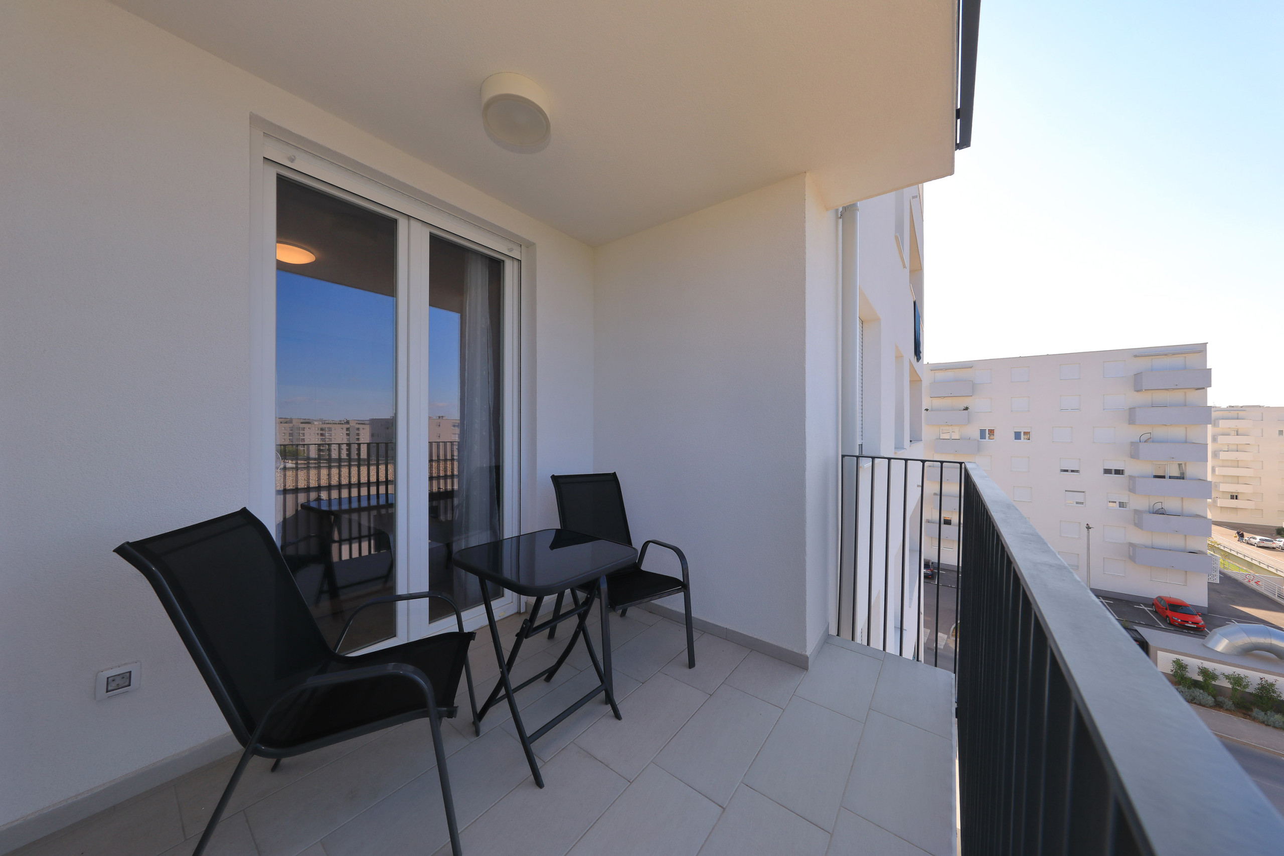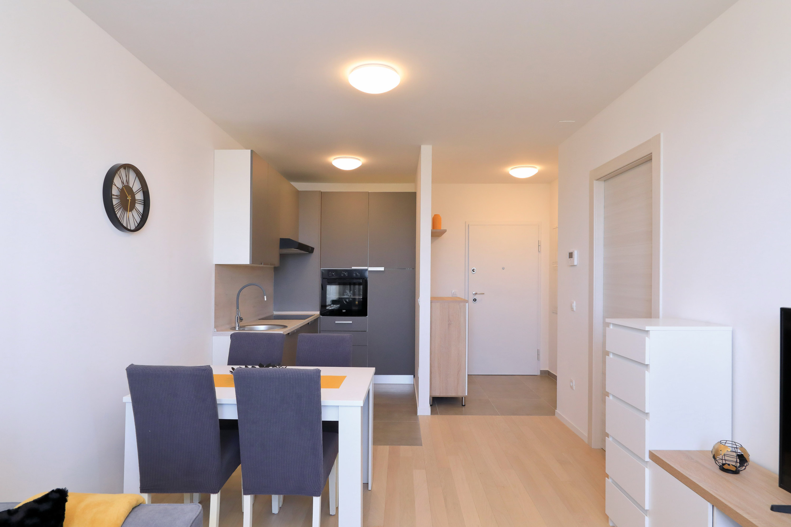 Modern apartment in Zadar for 4 guests with balcony, A/C, Smart TV, kitchen & free Wi-Fi. Beach 1.4 km, city center 1.8 km. Supermarket & restaurant nearby. Parking & washing machine included.