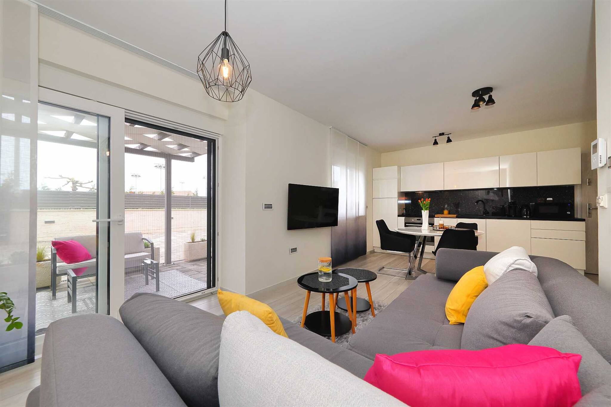 The separate bedroom features a comfortable double bed, ensuring restful nights. The open-plan living area includes a cozy sofa, a Smart TV, and free Wi-Fi, making it an ideal place to relax after a day of sightseeing or sunbathing.