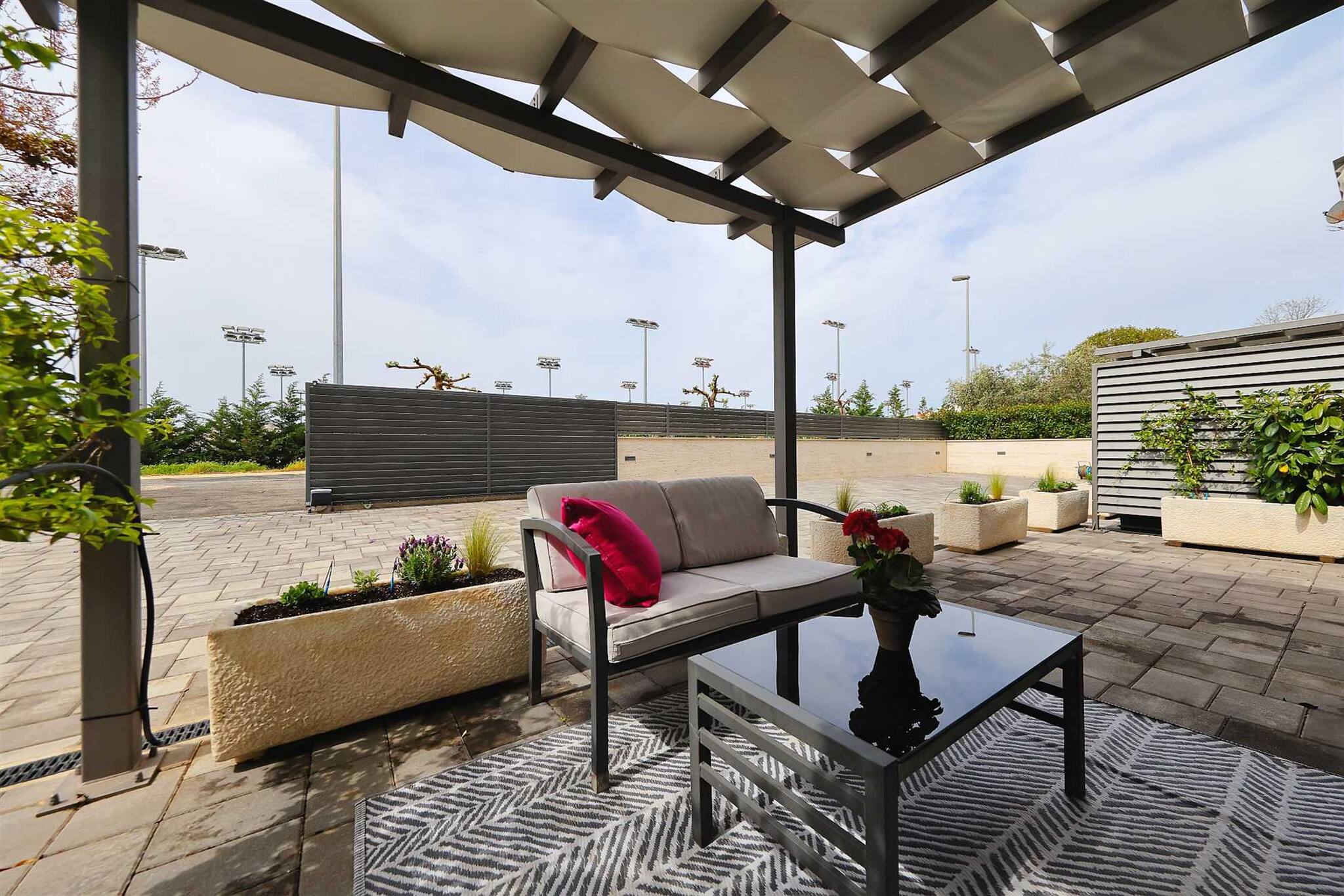 The furnished balcony with sunshade is a lovely spot to soak up the Mediterranean atmosphere, enjoy your morning coffee, or unwind with a glass of wine in the evening.