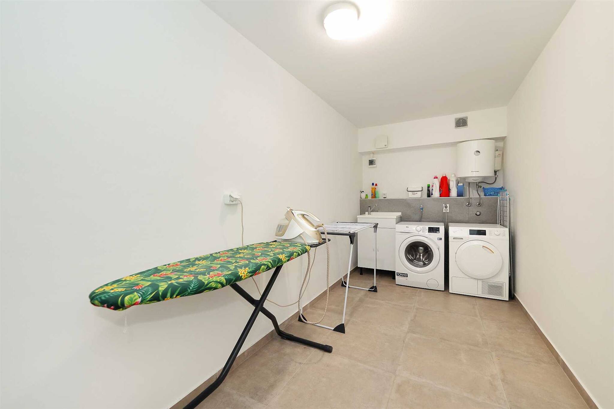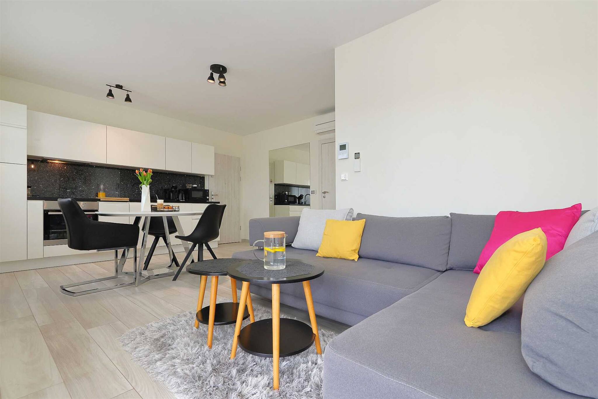 A modern air conditioning unit in the living room ensures a comfortable indoor climate even on hot summer days. For added convenience, a washing machine and dryer are also available. A free parking space in front of the building is included.