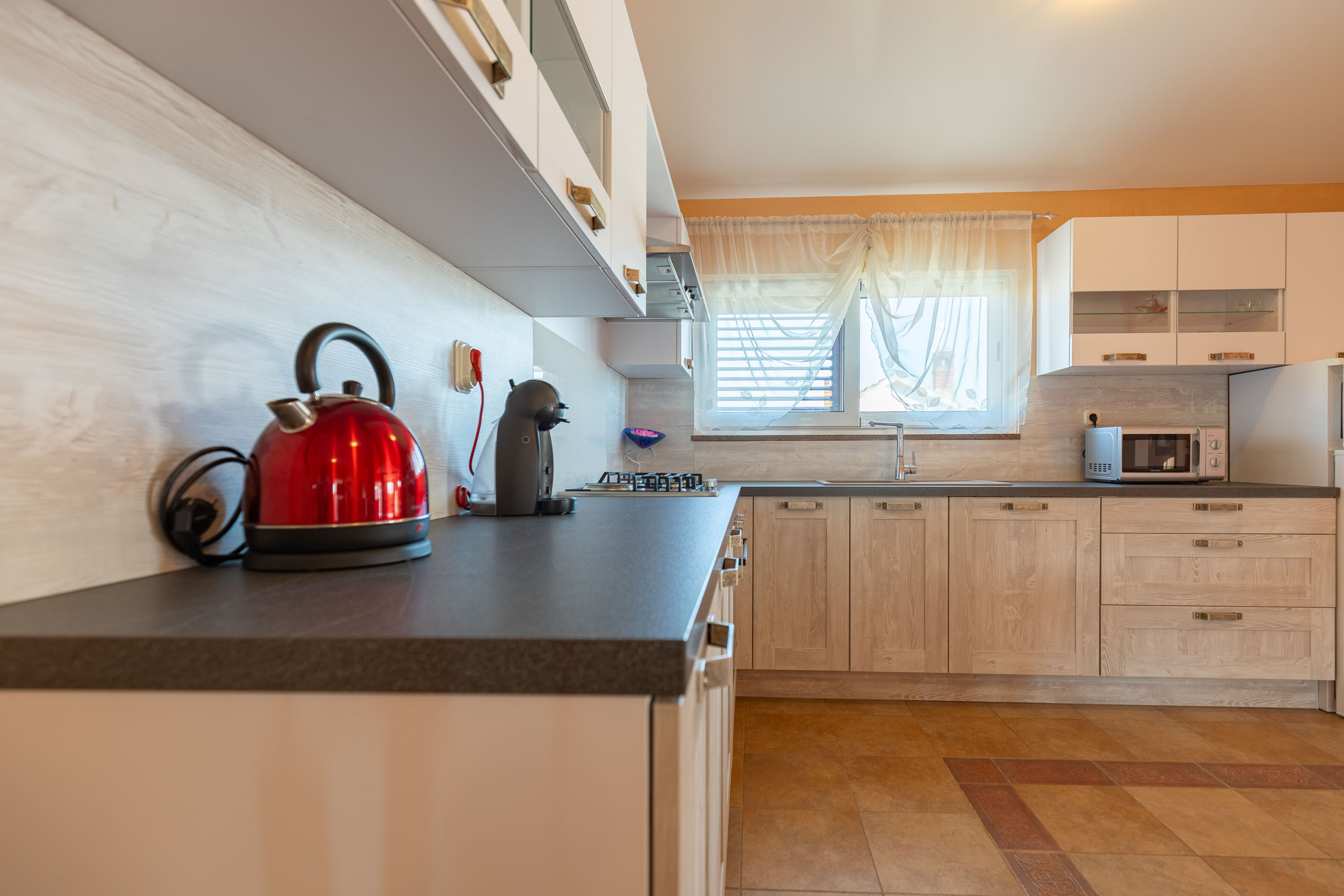 In the gas open plan kitchen, refrigerator, microwave, oven, freezer, dishwasher, dishes/cutlery, kitchen utensils, coffee machine, kettle and hob are provided.