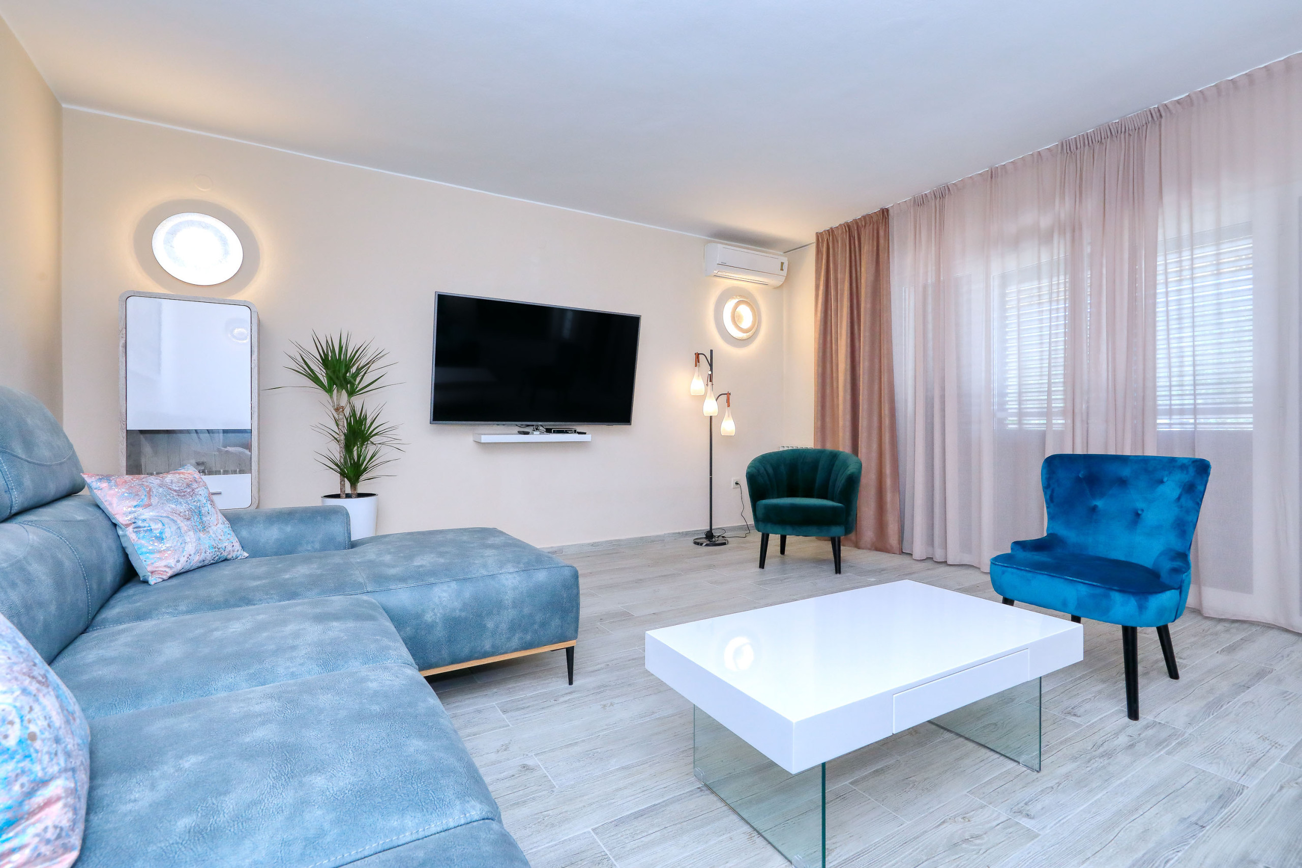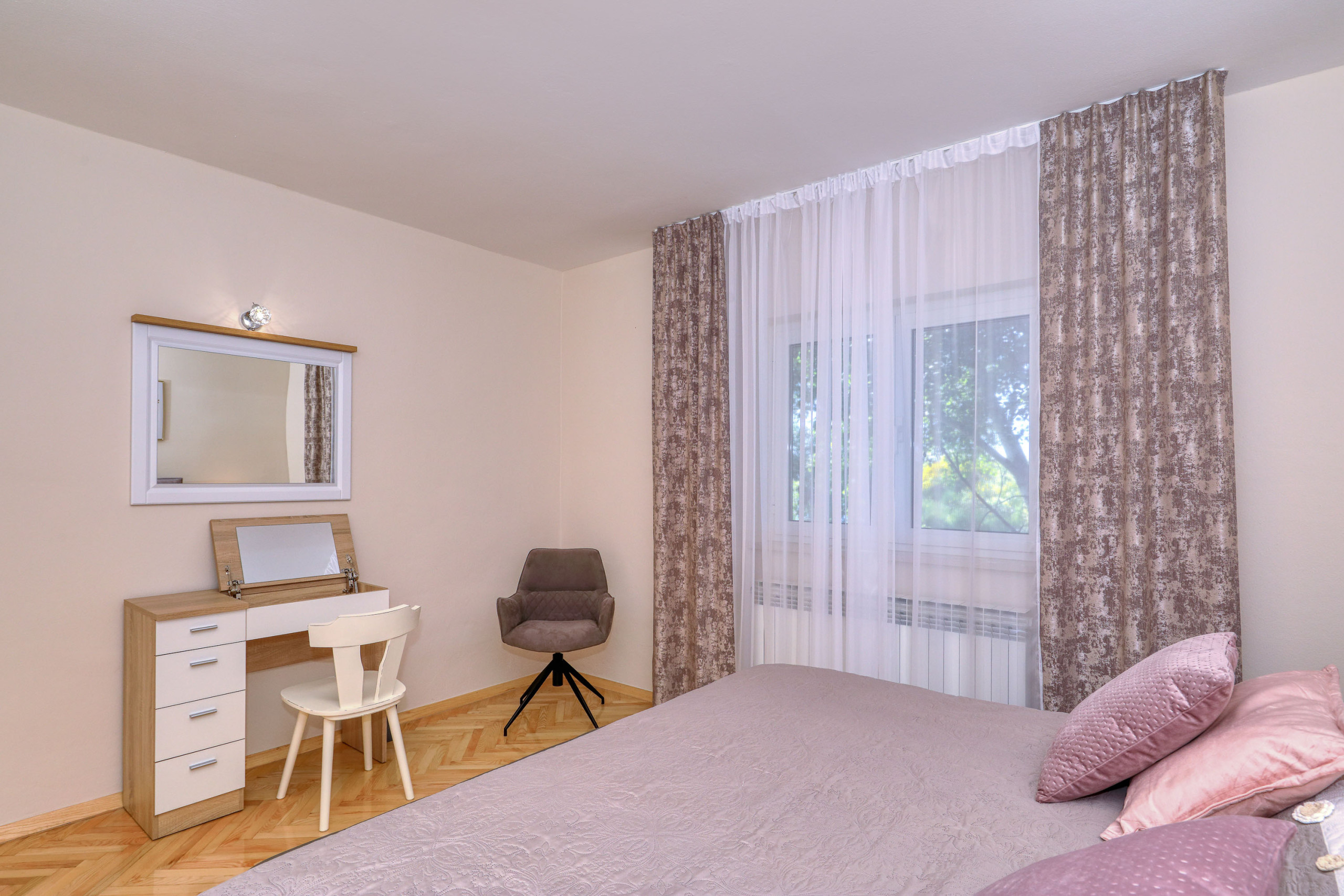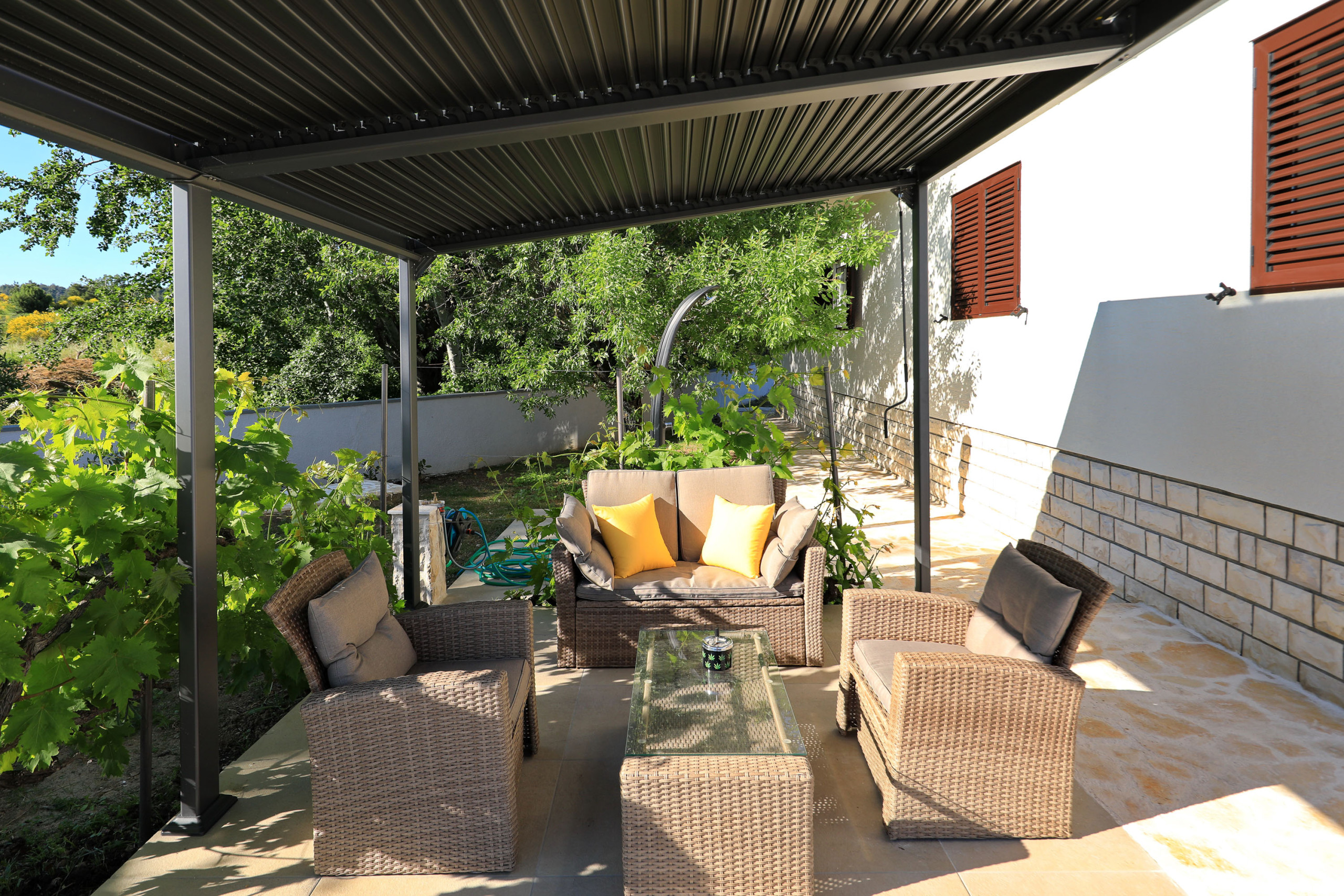 The accommodation is equipped with the following items: garden, garden furniture, 70 m² terrace, washing machine, barbecue, iron, safe, internet (Wi-Fi), hair dryer, balcony, childrens area, heat pump, air-conditioned, open-air parking the same building, mosquito net/nets in the bedroom, 1 TV, satellite tv.