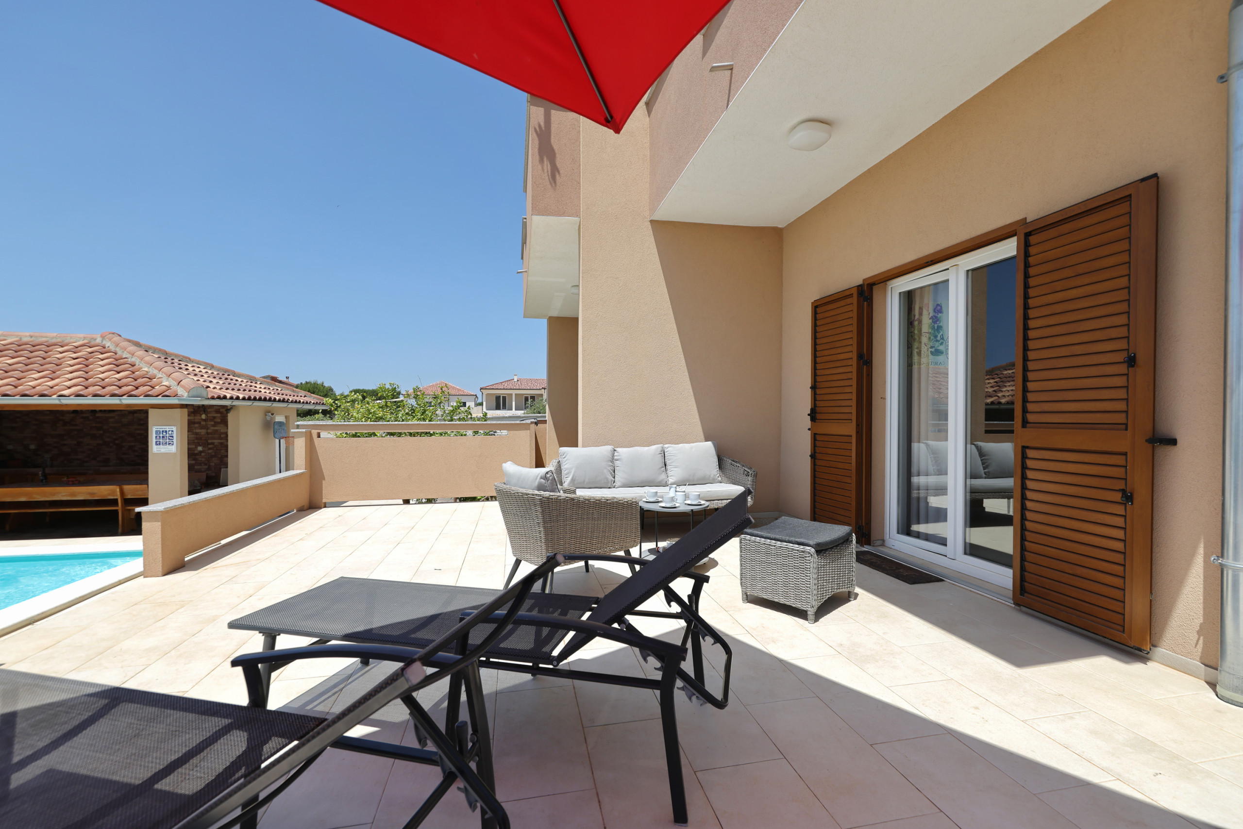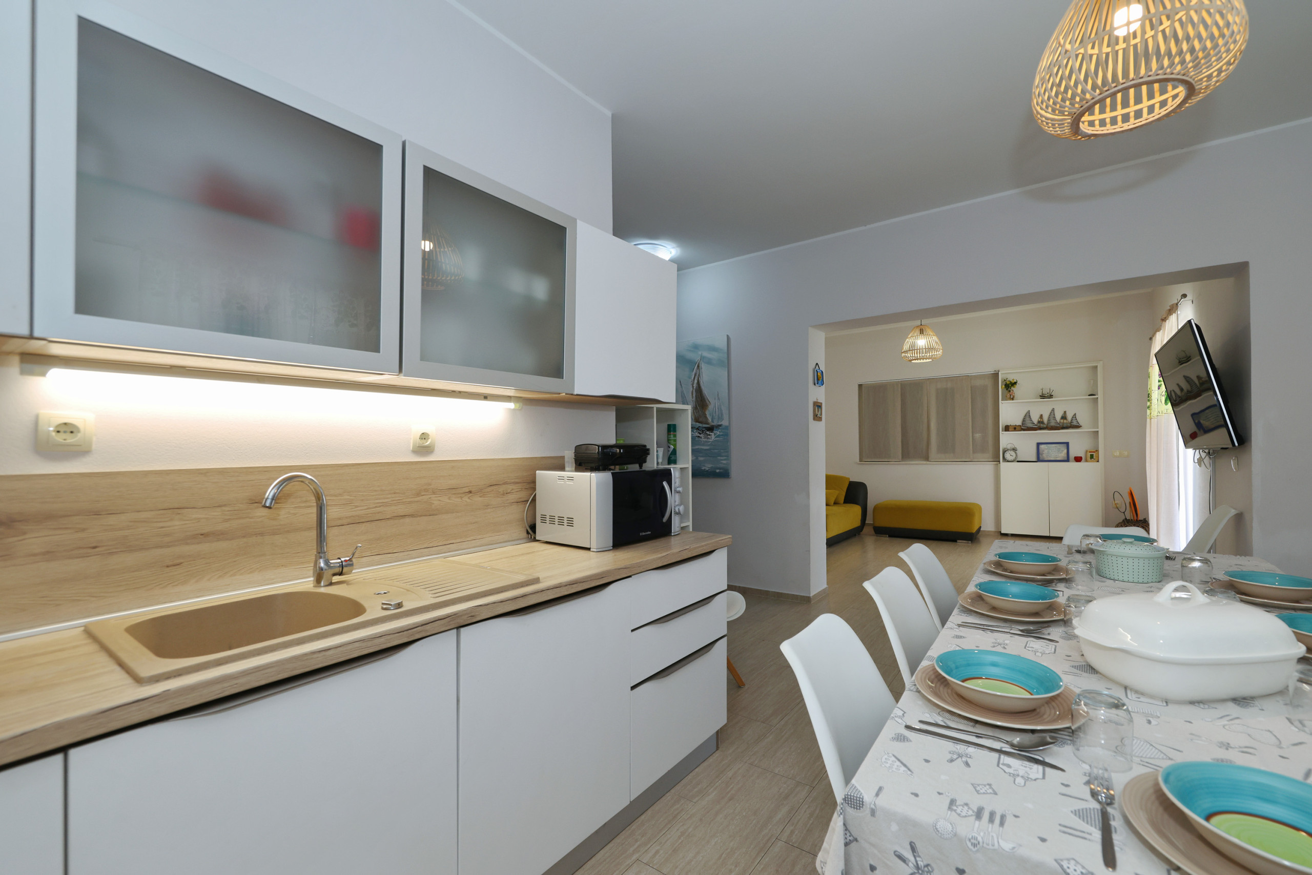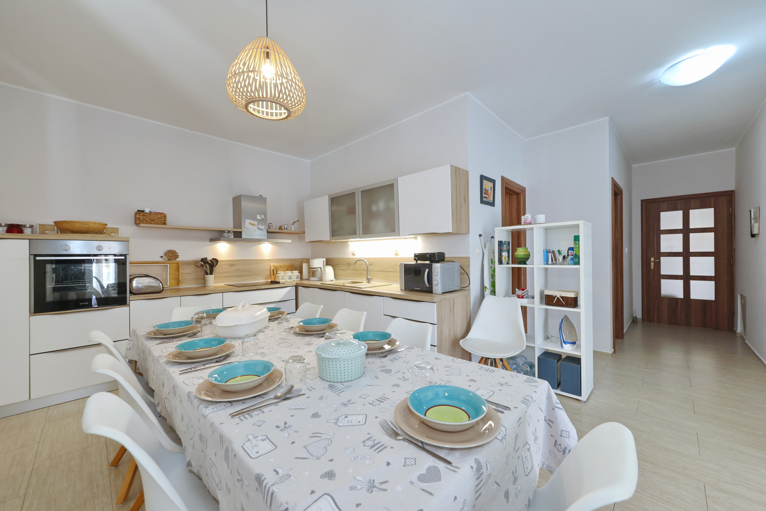 The heart of the home is the American-style kitchen, fully equipped with modern amenities including a glass-ceramic hotplate, fridge, freezer, dishwasher, oven, microwave, coffee machine, and all necessary kitchenware. Enjoy preparing delightful meals with loved ones or use the outdoor BBQ and picnic area for al fresco dining.