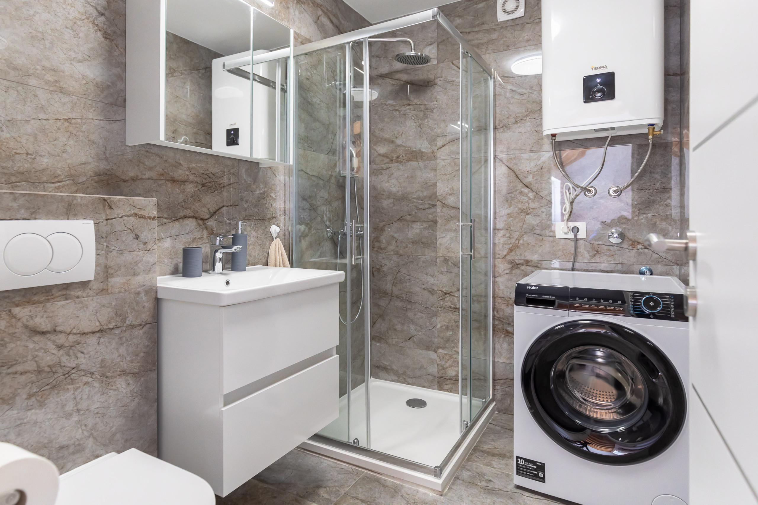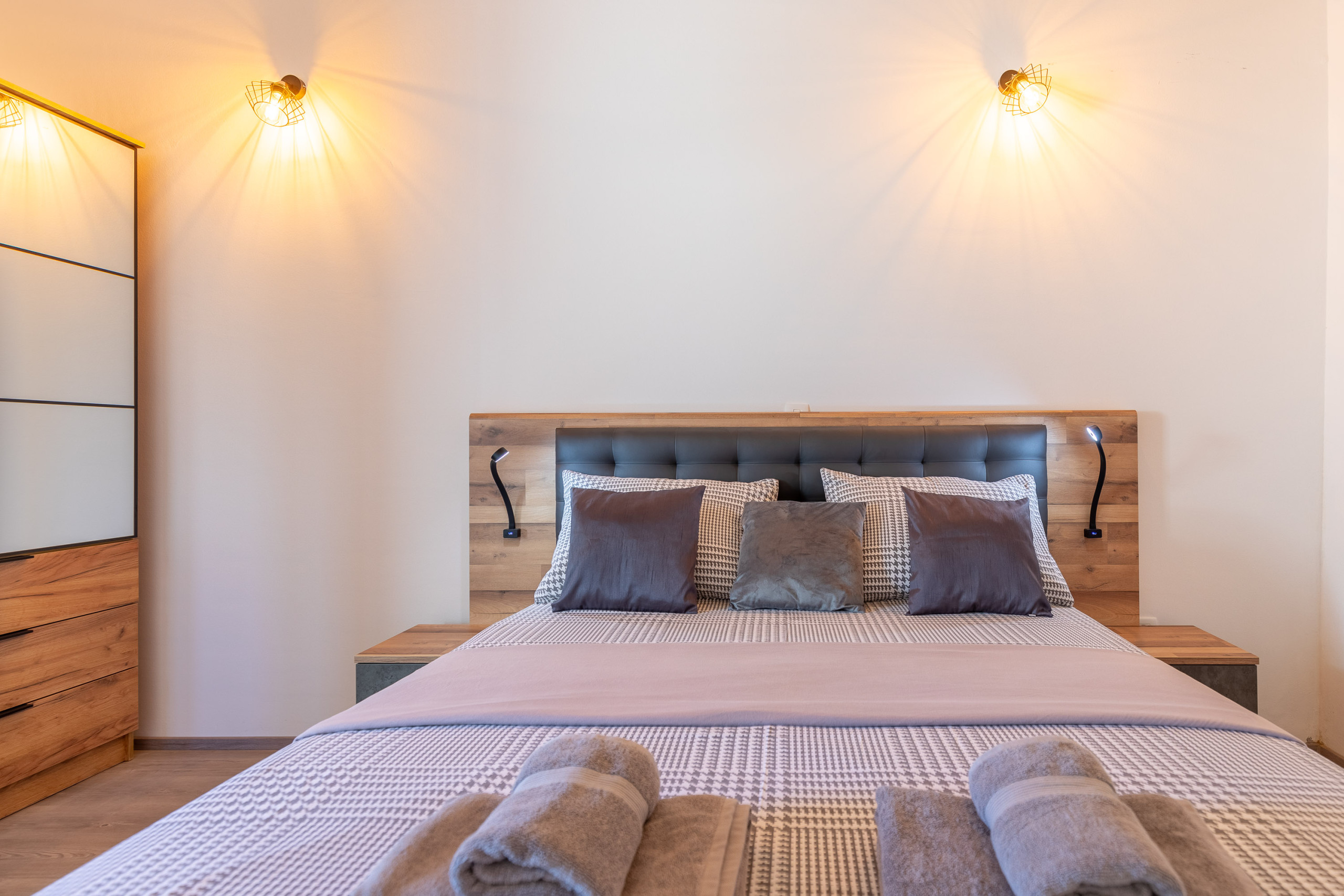 The accommodation is equipped with the following items: garden, garden furniture, 30 m² terrace, washing machine, barbecue, iron, internet (Wi-Fi), hair dryer, balcony, childrens area, heat pump, air conditioning in the living room, open-air parking the same building, mosquito net/nets in the bedroom, 1 TV.