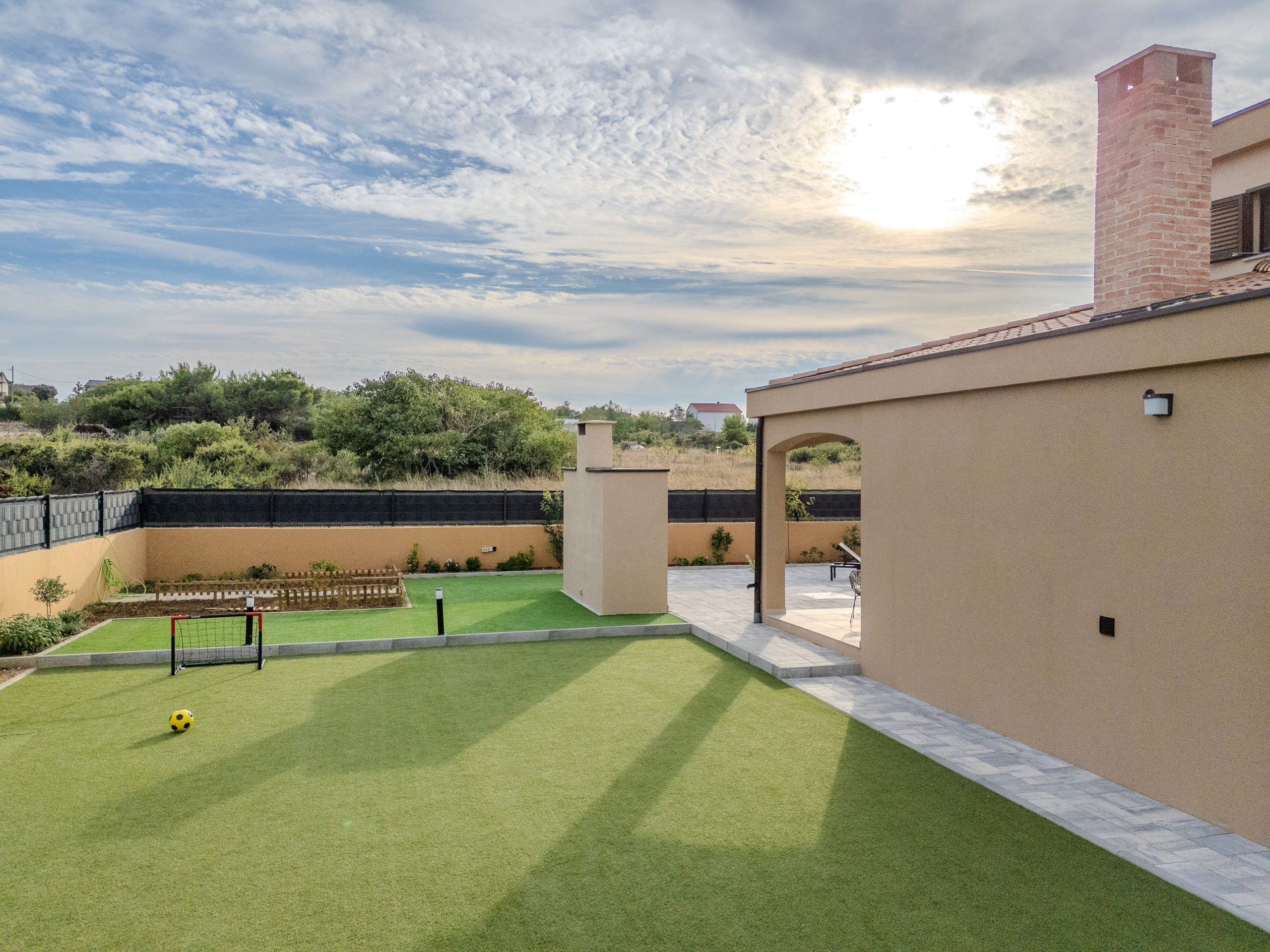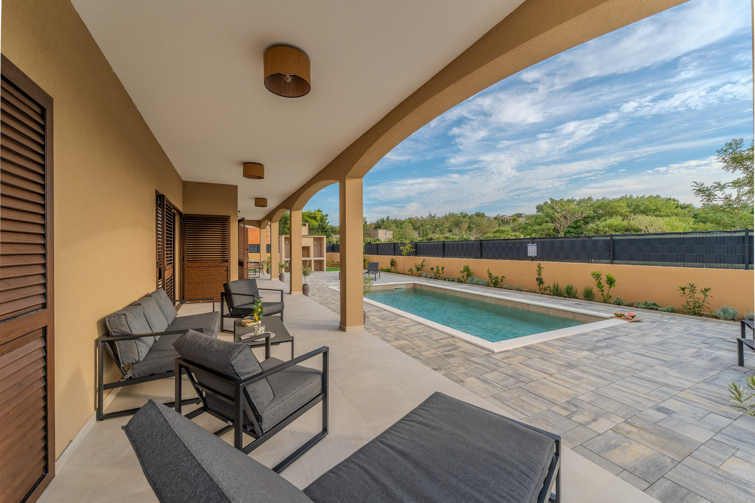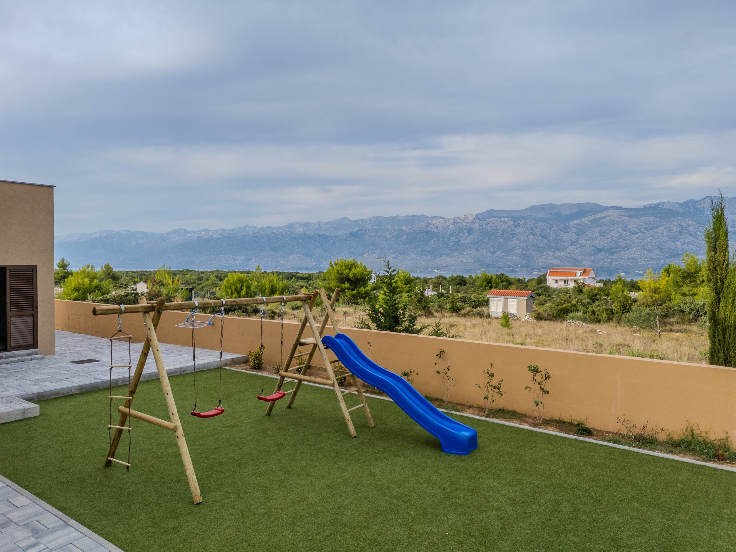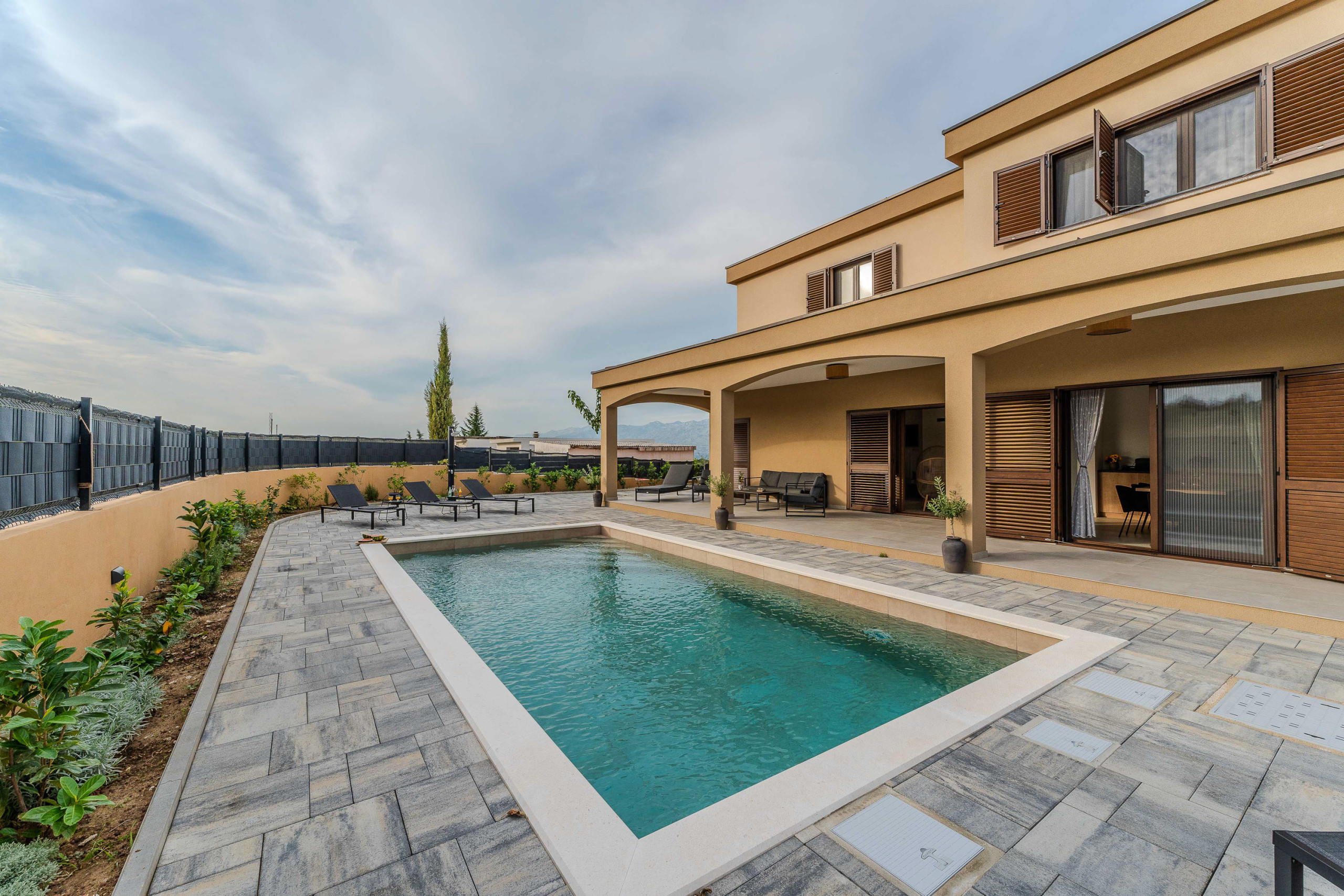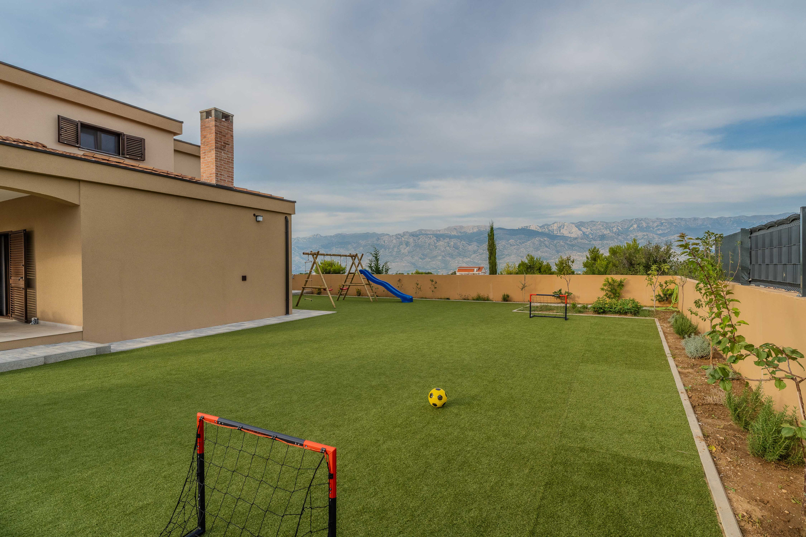 The accommodation is equipped with the following items: garden, garden furniture, fenced garden, washing machine, barbecue, fireplace, iron, safe, internet (Wi-Fi), hair dryer, balcony, childrens area, heat pump, air conditioning throughout the house, private swimming pool, open-air parking the same building, mosquito net/nets in the bedroom, 1 TV.