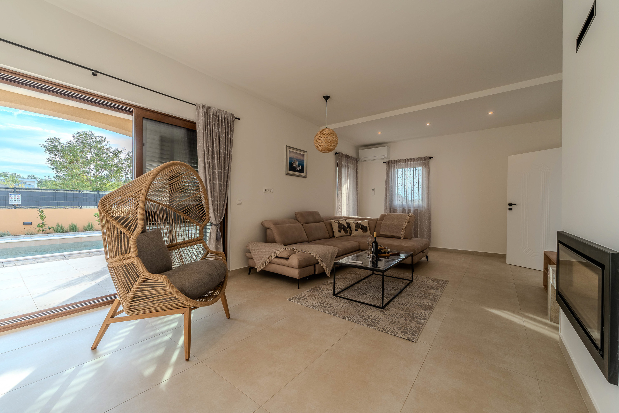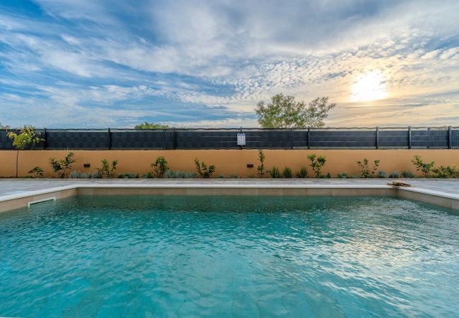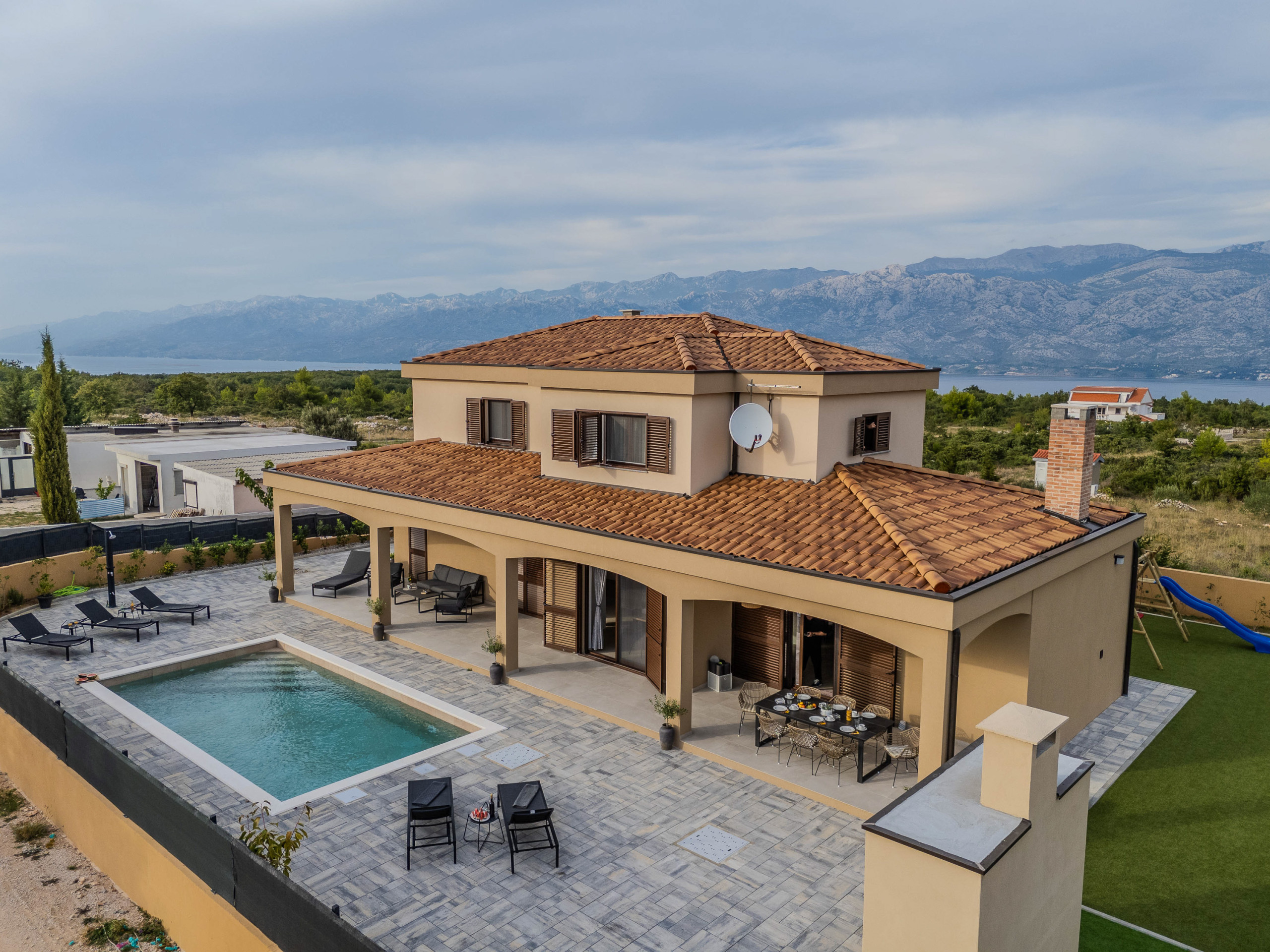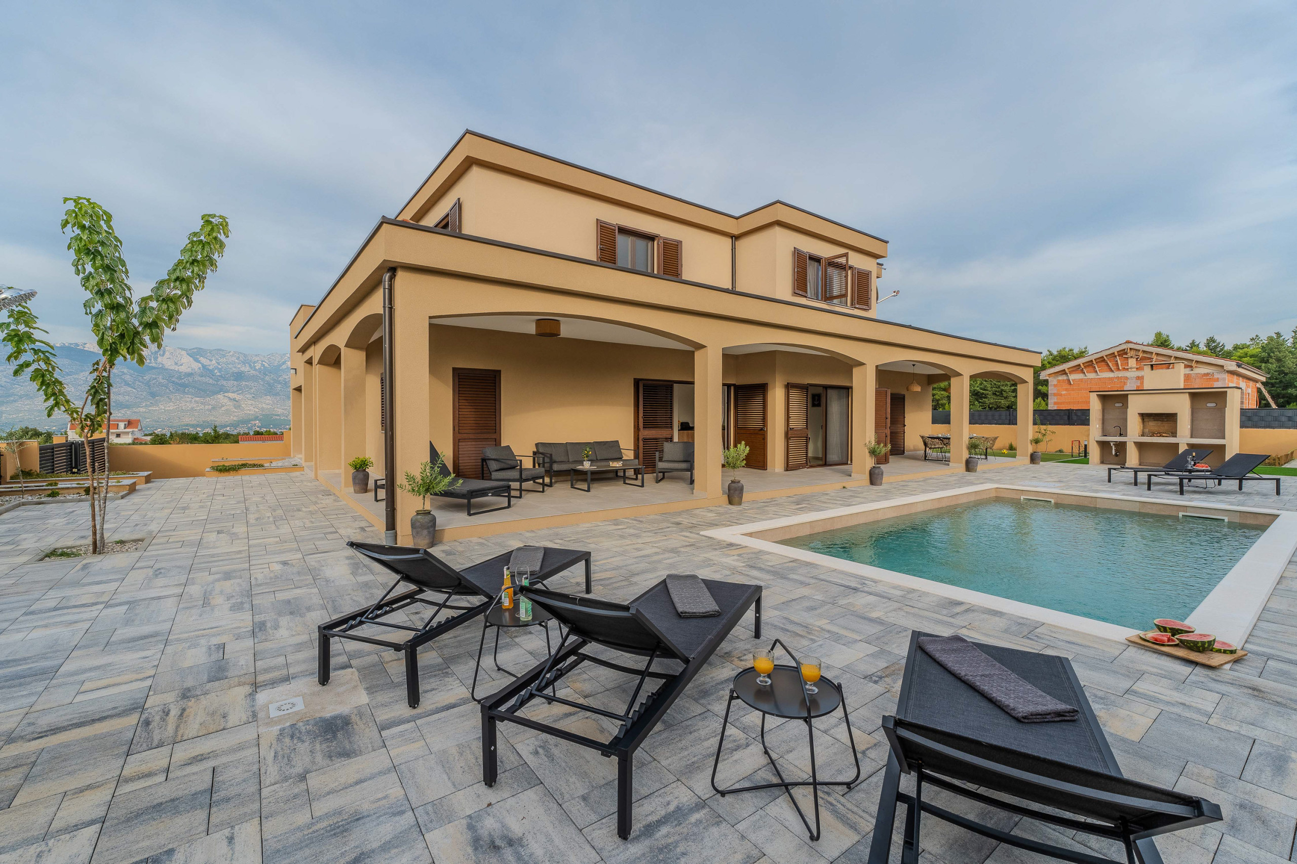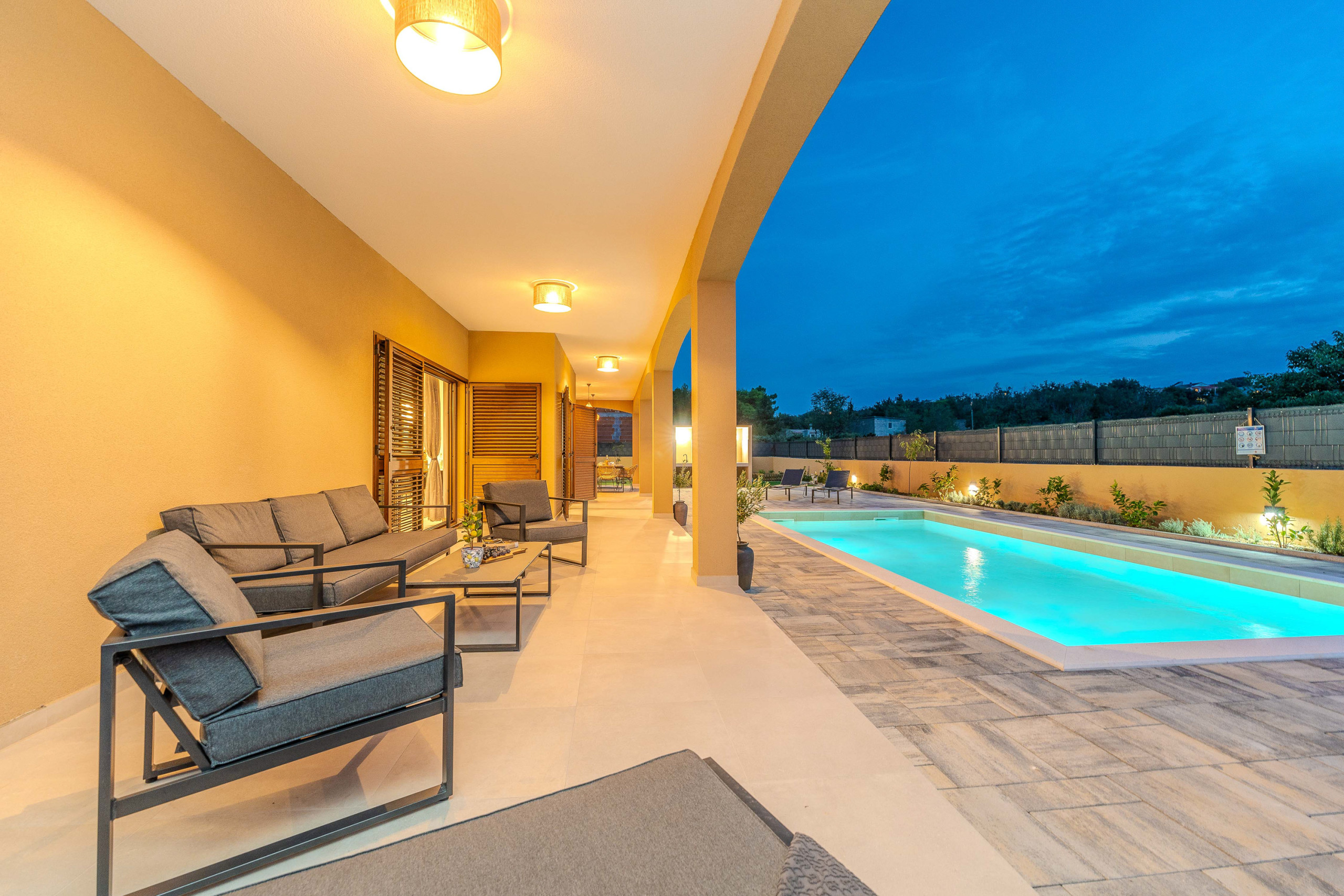 The accommodation is equipped with the following items: garden, garden furniture, fenced garden, washing machine, barbecue, fireplace, iron, safe, internet (Wi-Fi), hair dryer, balcony, childrens area, heat pump, air conditioning throughout the house, private swimming pool, open-air parking the same building, mosquito net/nets in the bedroom, 1 TV.