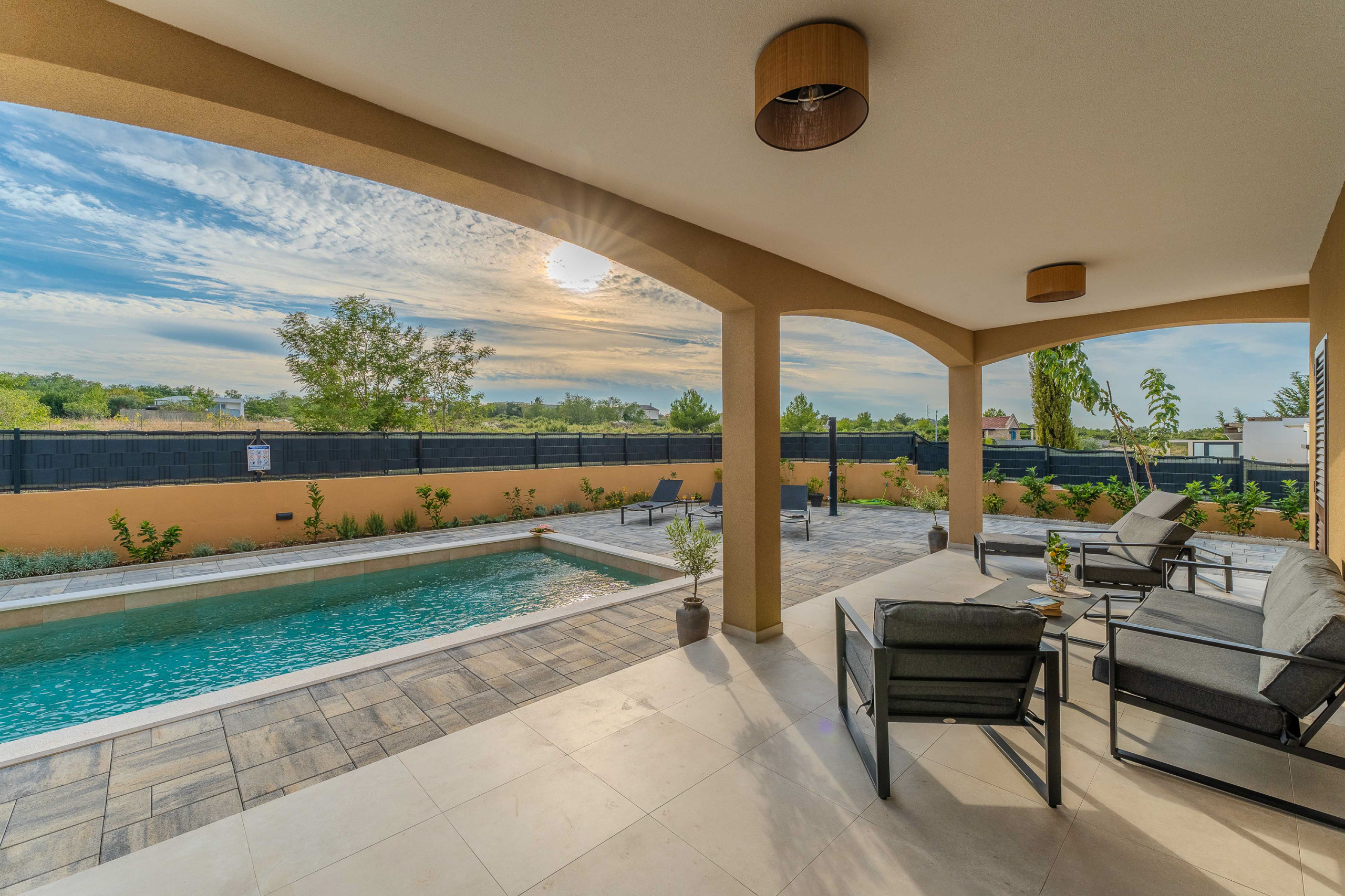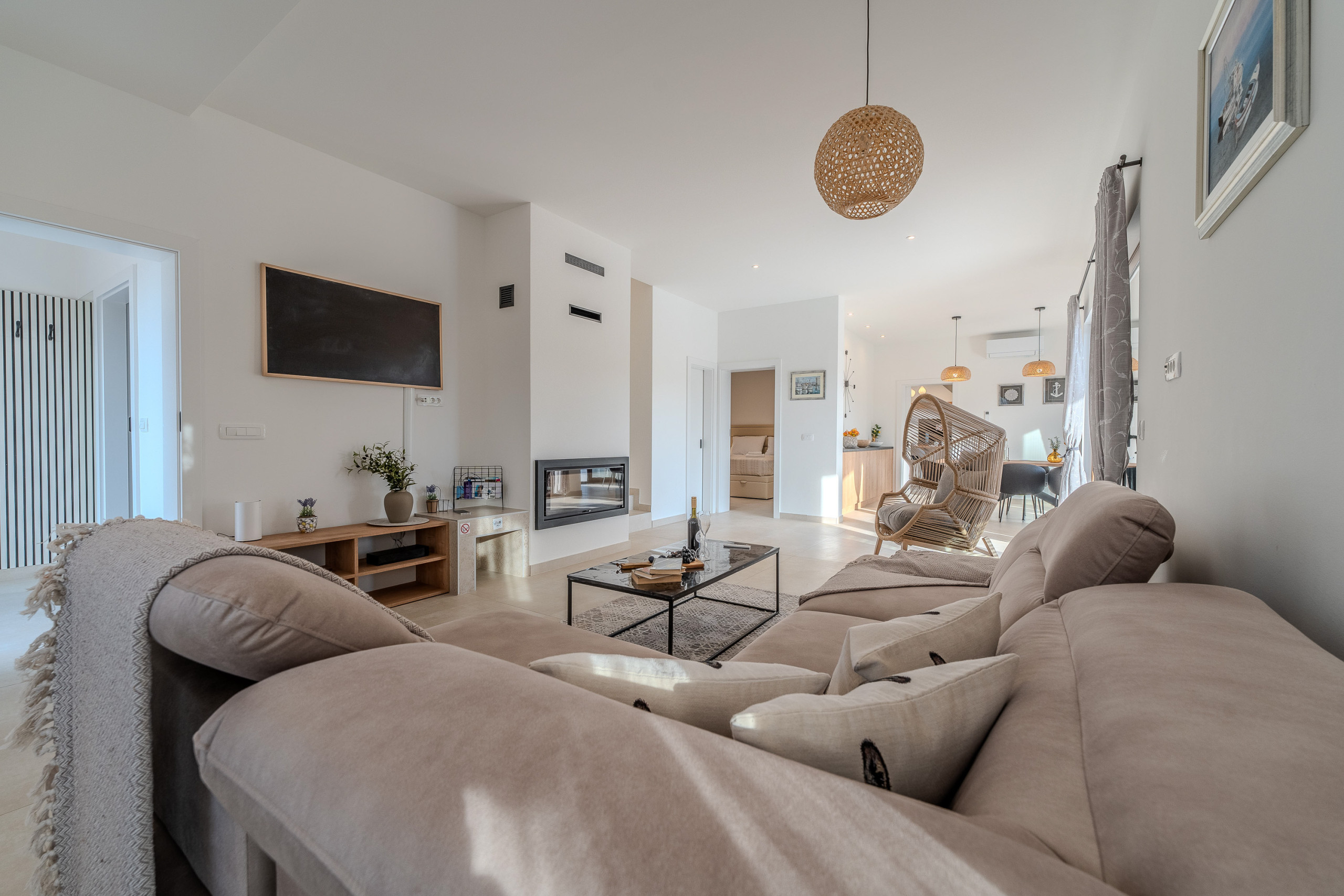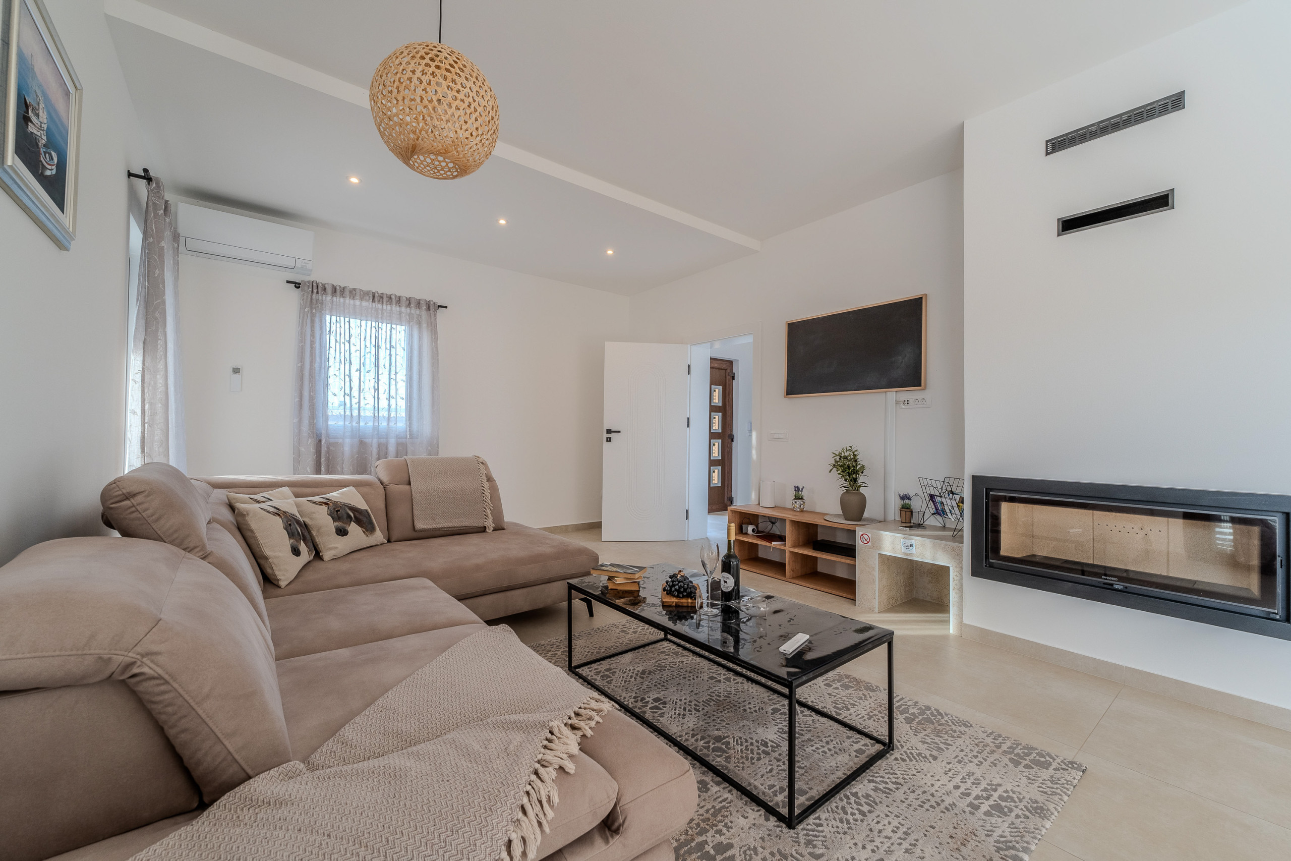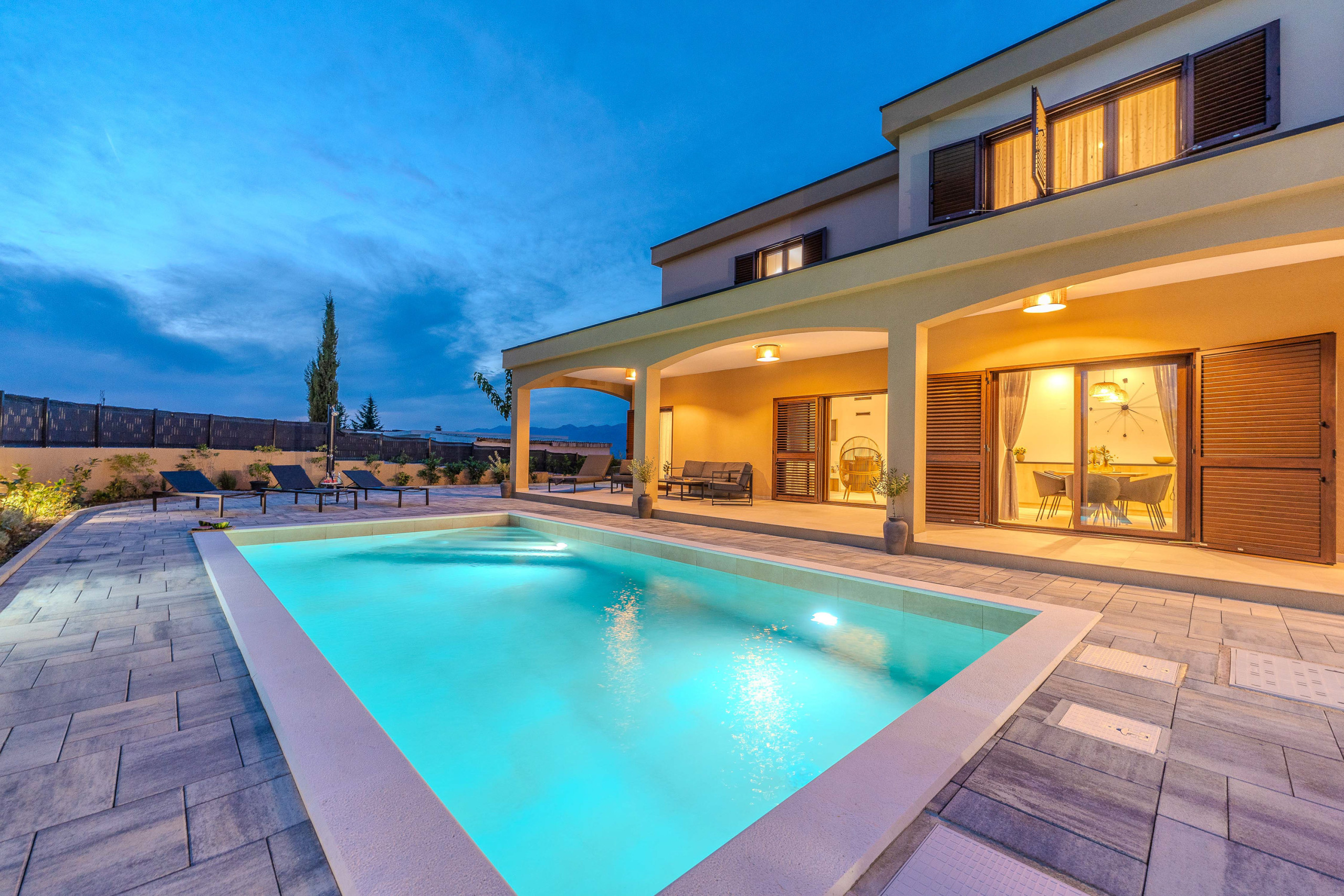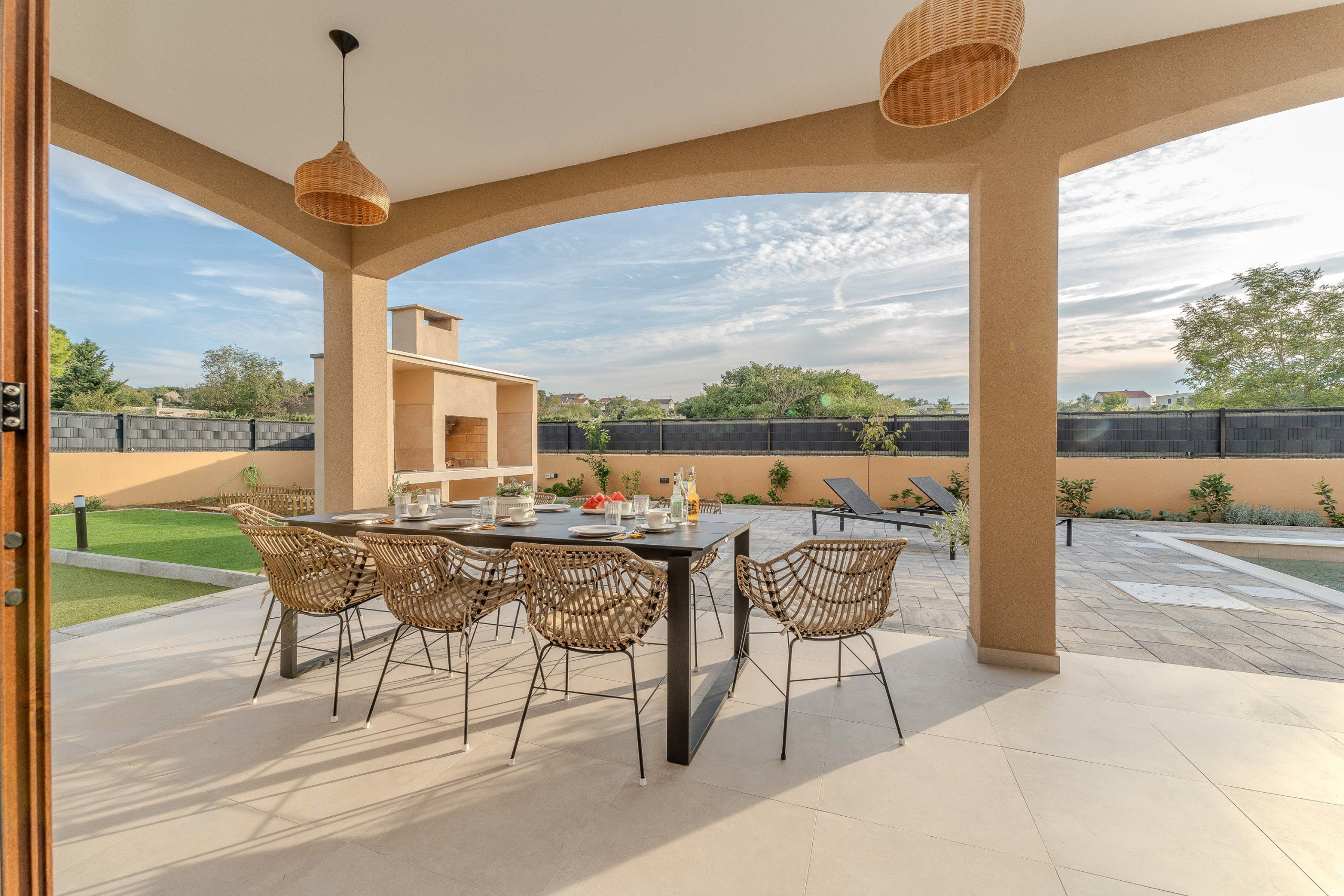 The accommodation is equipped with the following items: garden, garden furniture, fenced garden, washing machine, barbecue, fireplace, iron, safe, internet (Wi-Fi), hair dryer, balcony, childrens area, heat pump, air conditioning throughout the house, private swimming pool, open-air parking the same building, mosquito net/nets in the bedroom, 1 TV.