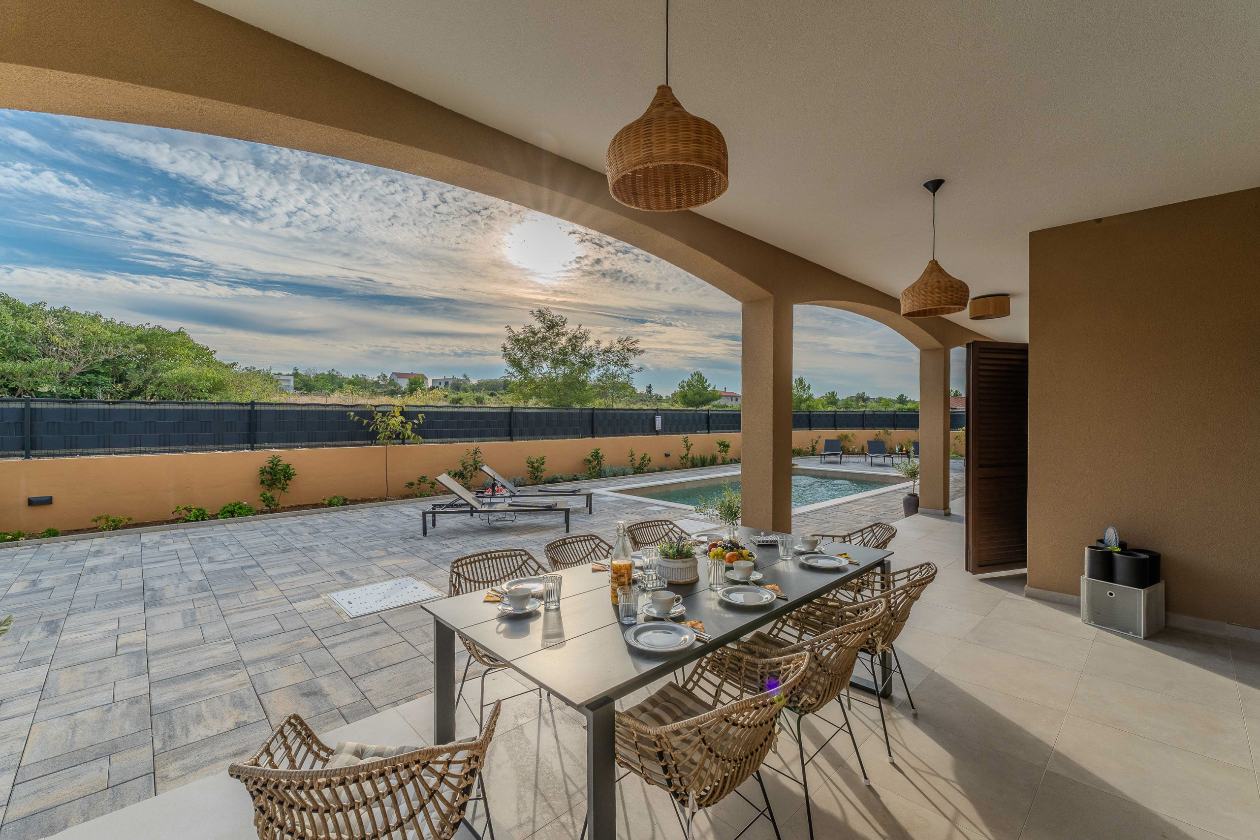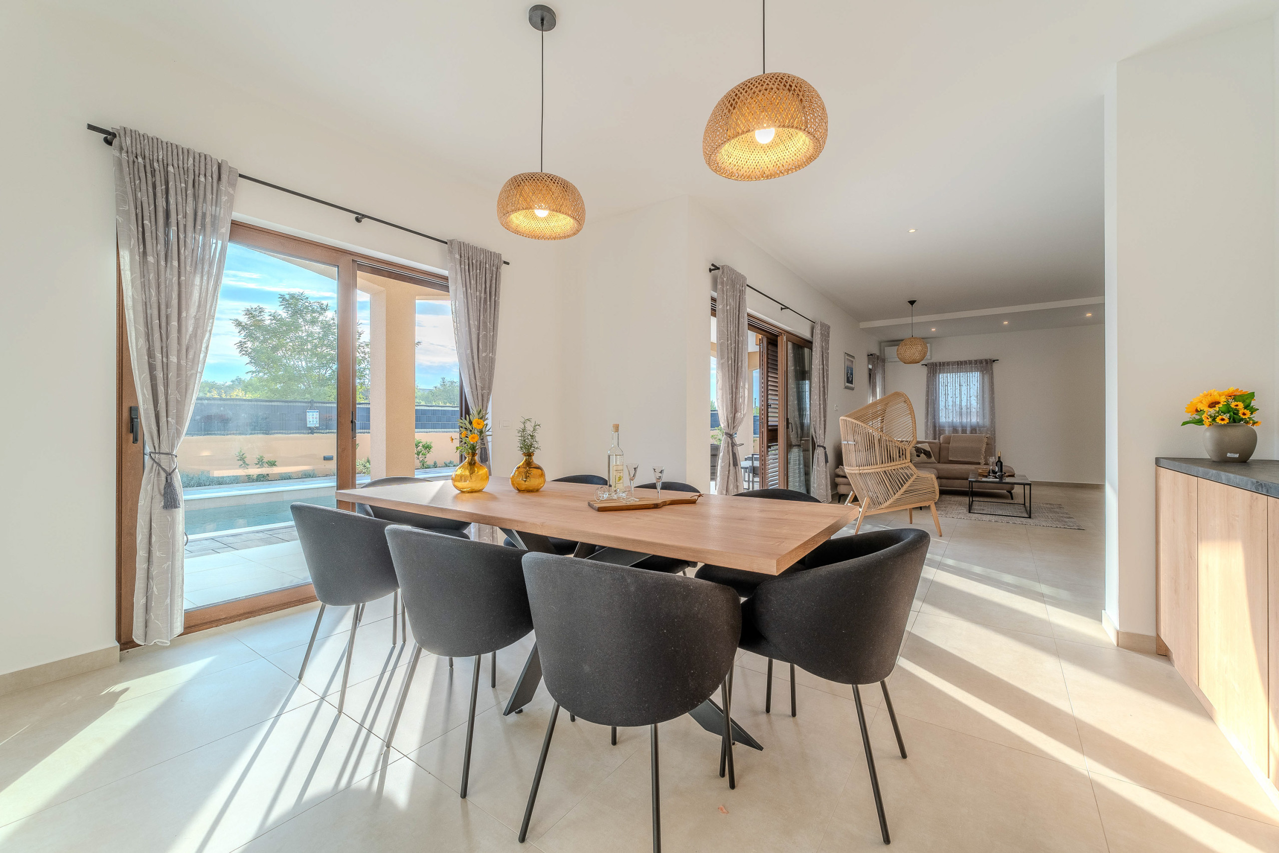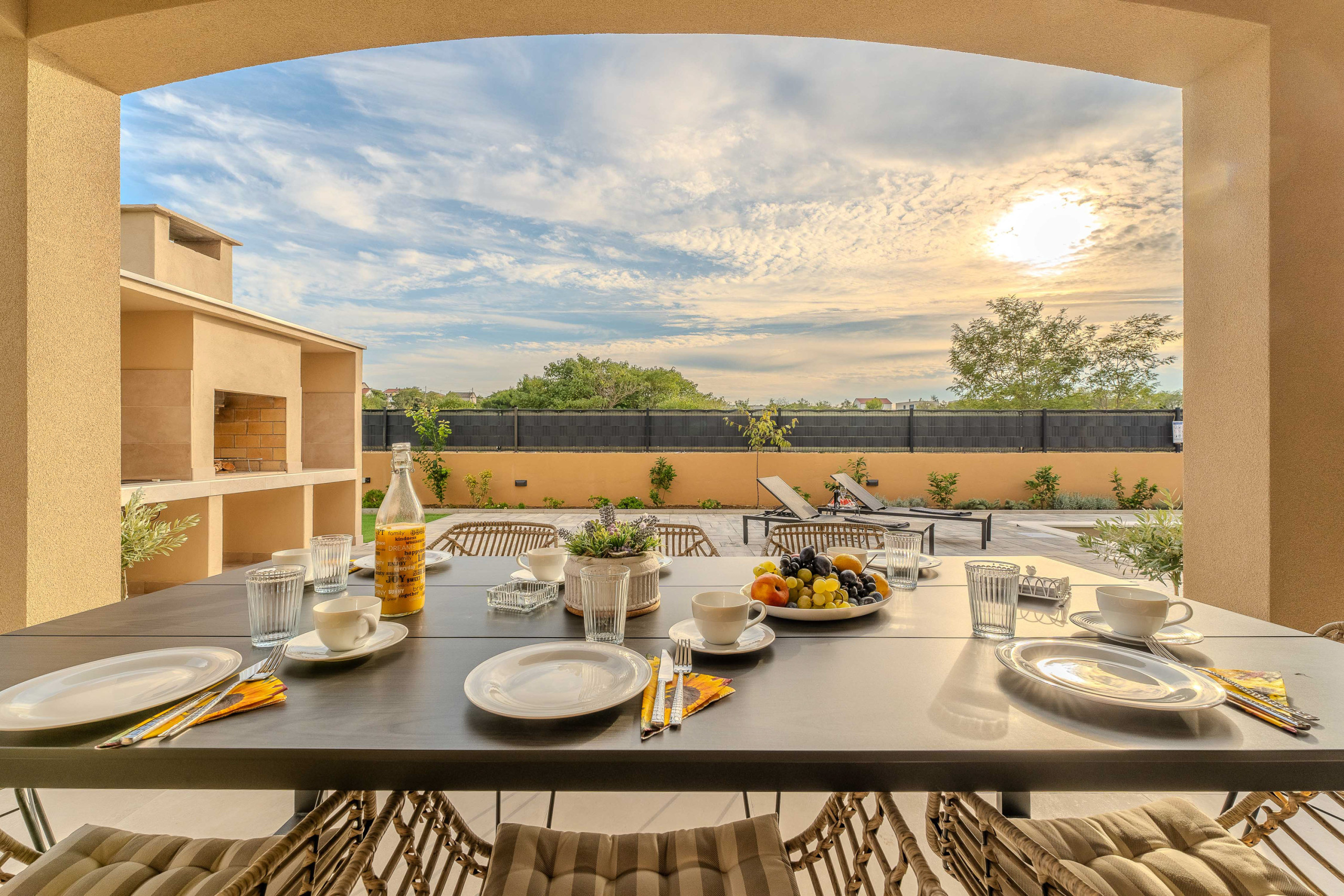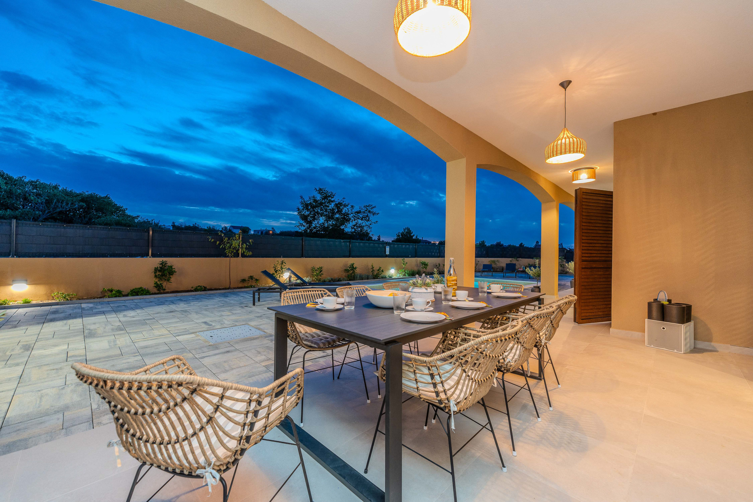 The accommodation is equipped with the following items: garden, garden furniture, fenced garden, washing machine, barbecue, fireplace, iron, safe, internet (Wi-Fi), hair dryer, balcony, childrens area, heat pump, air conditioning throughout the house, private swimming pool, open-air parking the same building, mosquito net/nets in the bedroom, 1 TV.