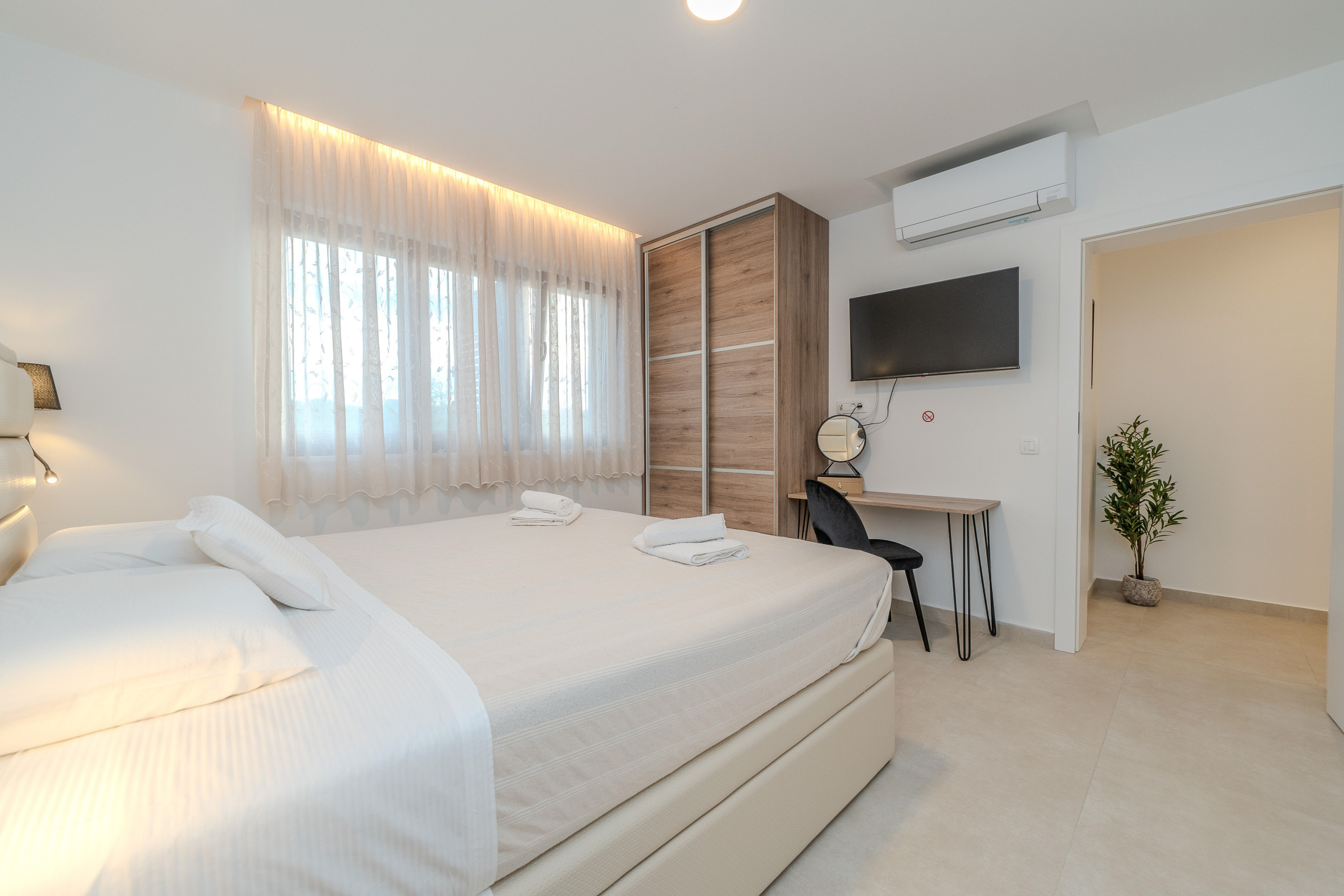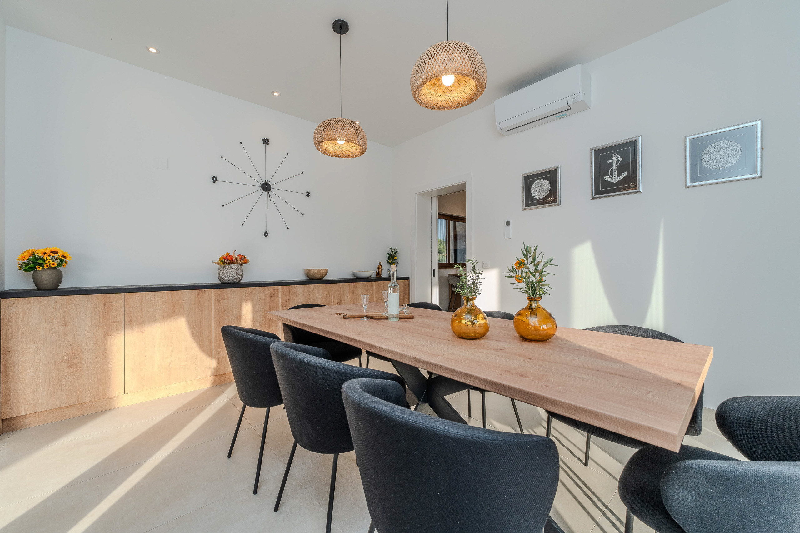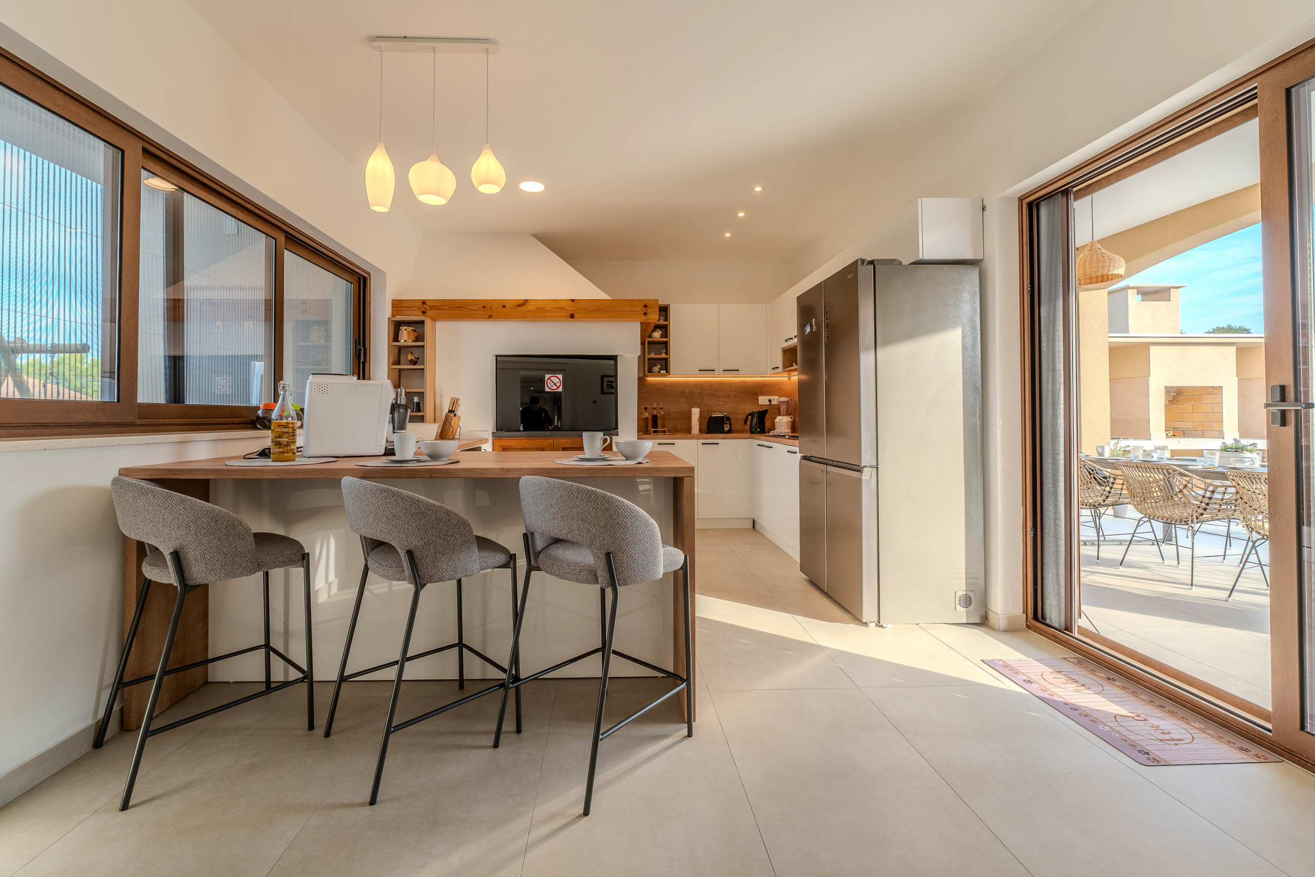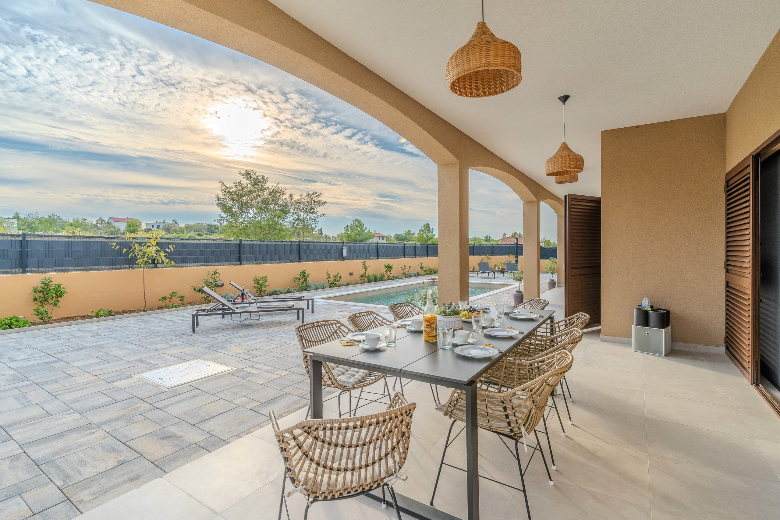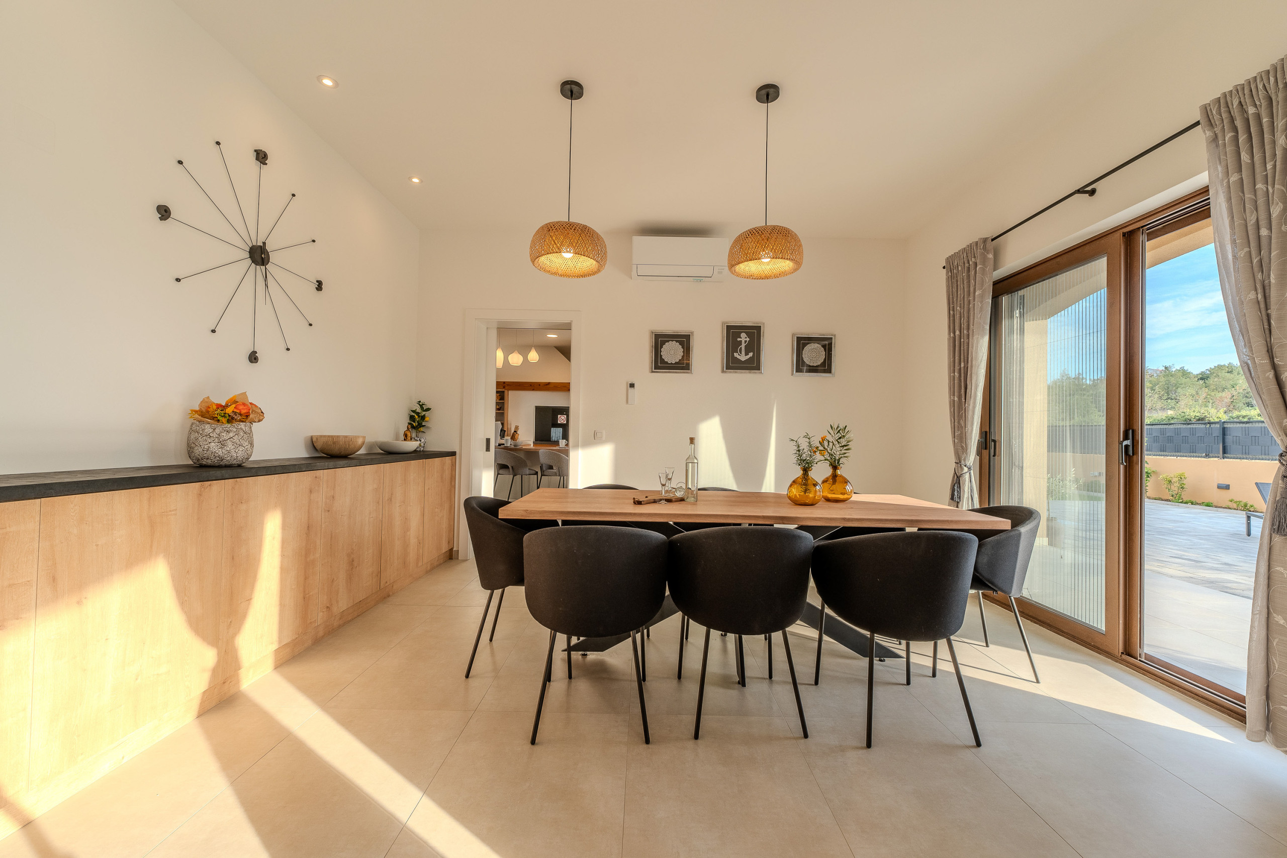The accommodation is equipped with the following items: garden, garden furniture, fenced garden, washing machine, barbecue, fireplace, iron, safe, internet (Wi-Fi), hair dryer, balcony, childrens area, heat pump, air conditioning throughout the house, private swimming pool, open-air parking the same building, mosquito net/nets in the bedroom, 1 TV.